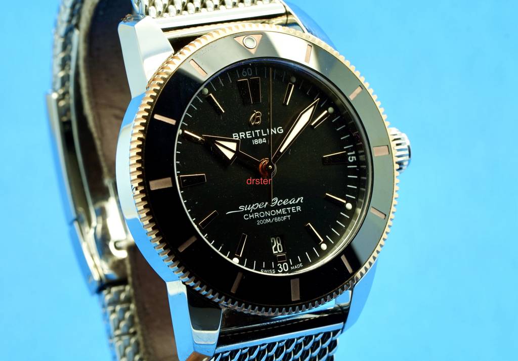 For sale (or trade) is my Breitling Superocean Heritage II 44 in 18K Rose Gold and Stainless Steel reference UB2030. It's 44 mm in diameter. The bezel is 18K Rose Gold. Black dial with gold markers. The ceramic bezel has gold markers. This is the newest version with the in house movement. Water resistant to 200m. It's a COSC chronometer and keeps COSC time. It is in near mint condition. No issues. Still covered under Breitling warranty until 2028.
