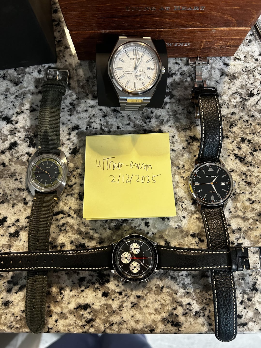 Made a big purchase so consolidating some entry level pieces that don’t get wrist time. All prices listed will be inclusive of shipping. No trades at this time. - Citizen Zenshin: full kit, 40mm, automatic, titanium, $299 shipped - Bulova summer wind: box only, 40mm, automatic, $215 shipped - timex ww75: 37mm, manual, generic box, $115 shipped - Dan Henry 1962 (evil panda): 39mm, quartz, full kit, $135 shipped Feel free to message with more questions!