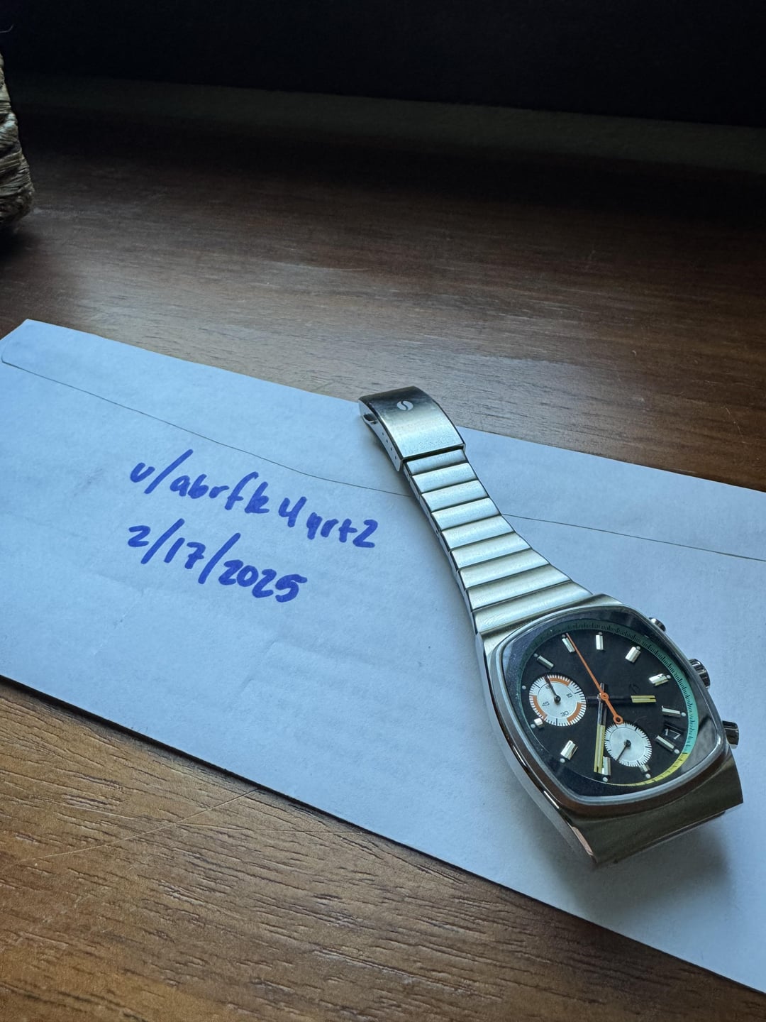Hey all, looking to sell my Brew Metric Retro chronograph. It’s a really cool watch but I just don’t wear it very often and am looking to sell off a few pieces in my quest to save for a more expensive watch or two. Since it’s not worn very often, the watch is in great condition, having only some minor desk diving scratches on the clasp, shown in the pictures. Full kit included (watch roll, cloth, booklet). *I’m looking for $400, shipping included to the continental US.* Zelle or Venmo (for users with good transaction history) preferred. This will be my first sale here, but I’ll also be looking to get rid of a LNIB Seiko 62MAS SPB253 and a clear Casioak, so if those sound like something you’re interested in keep your eyes peeled here or send a PM for more info.