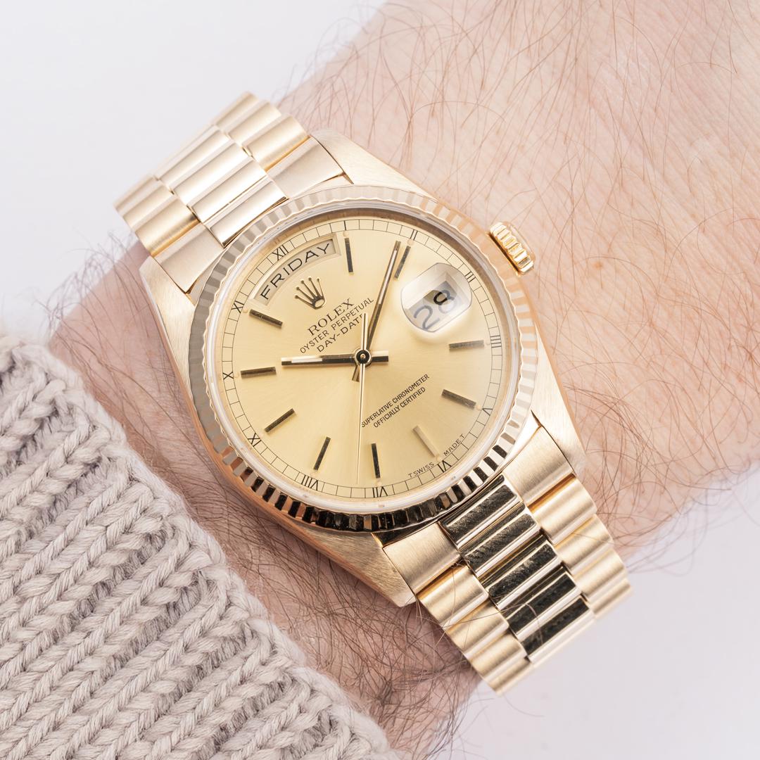 **Model**: 18238 **Condition**: Excellent (little to no signs of wear) **Year**: 1988 (R-Serial) **Scope**: Box **Movement**: Automatic **Case Width**: 36mm **Strap Length**: 7.50" (additional links can be sourced) **Listing ID**: 220001794 **Price:** Offered at $16,550 shipped. Wire or Zelle. [Album](https://imgur.com/a/DKpOxKd) | [Timestamp](https://imgur.com/a/Fl37Td7) **Our Take** The Ref. 18238 combines modern quick-set date function with timeless design, striking a perfect harmony between the classic and contemporary Day-Date styles. This exquisite Day-Date model boasts a stunning champagne rail track dial. The watch is in excellent condition, displaying minimal to no signs of wear. The case features sharp edges and retains its original factory finishes. It operates within COSC specifications, having undergone a mini service in Feb 2025. During the service, new gaskets were installed to ensure proper water resistance, and a new mainspring was added to restore full power reserve capacity. Although the original papers are not included, the watch comes with its original inner Day-Date box.