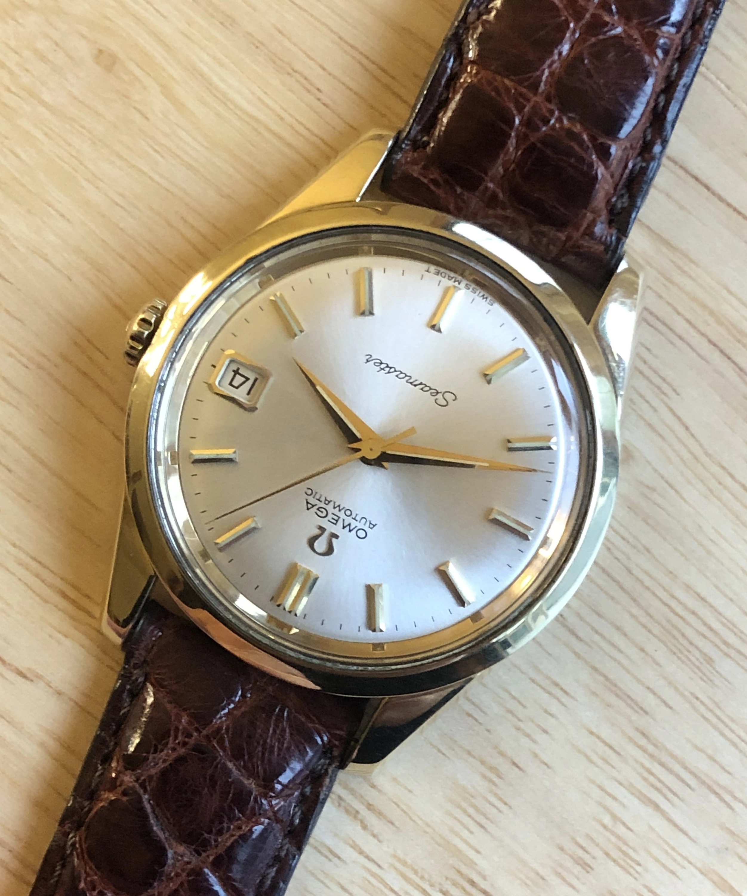 Here is a beautiful Omega Seamaster (ref 166.010) from the mid-1960s with a clean silver sunburst dial and a 35mm gold-capped over stainless case. The watch has not been serviced in my possession, but is winding, setting, and running properly. Comes with a lightly worn crocodile strap