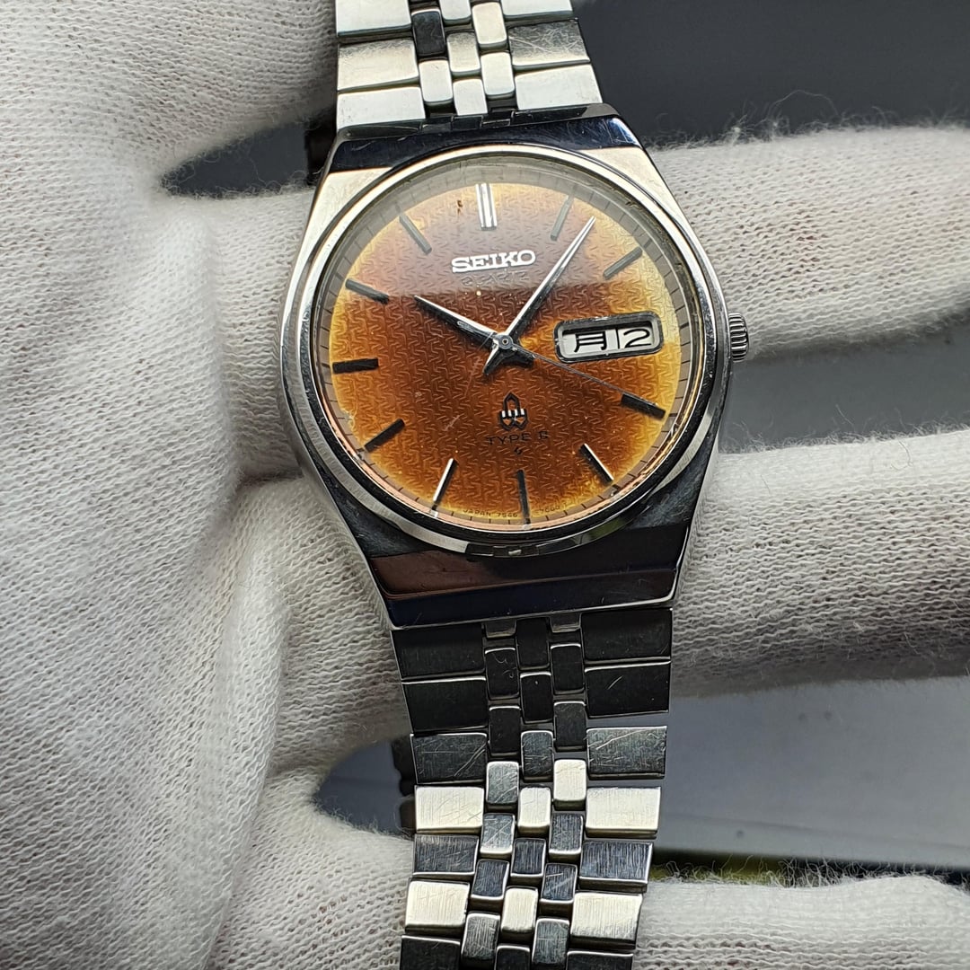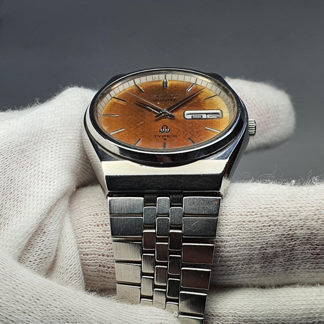 For sale is this vintage Seiko Type-II 7546-7000, made in Japan, in April of 1978. During the 70s Seiko was leading the quartz revolution with extremely high-quality quartz watches of which this in no exception. Type-II (Type-2) was Seiko wanting to make a more attainable series of quartz watches to the people as quartz watches were very expensive, far more than the equivalent automatics of the time. These were Japanese domestic market only. This particular example has a very unique tropical patina on the "tatami" textured dial. The silver rehaut minute track is unaffected which adds to the look. Sharp dauphine hands, a classic Seiko element, with a black stripe down the middle match the baton markers which are also silver with a black strip. Applied single crystal quartz logo and Seiko logo. The case of the watch is high polish and with nice facets. The bracelet is original and has an extend function best fitting wrists roughly 17.5cm-20cm. Day wheel is bilingual with English and Japanese Kanji. Brand new battery.Offers welcome. Dimensions are: 35mm x 41mm x 10mm Lug Width 20mm Looking for $140 (Buyer pays Paypal Fees) International Tracked Shipping included in price TIME STAMP IN LINK BELOW More pics: [https://flic.kr/s/aHBqjC5Bky](https://flic.kr/s/aHBqjC5Bky) Decent condition for its age (almost 50 years old!) with general wear as expected, faint scratches on crystal. Bought in Japan. \*Returns accepted but return postage costs are the buyer's responsibility under all circumstances.