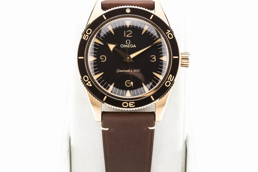 Up for sale is an excellent condition Omega Seamaster 300 41mm Bronze Gold on leather strap, reference 234.92.41.21.10.001. It comes complete with all boxes, papers, booklets, hang tag, and Omega Warranty Card dated June 2021.