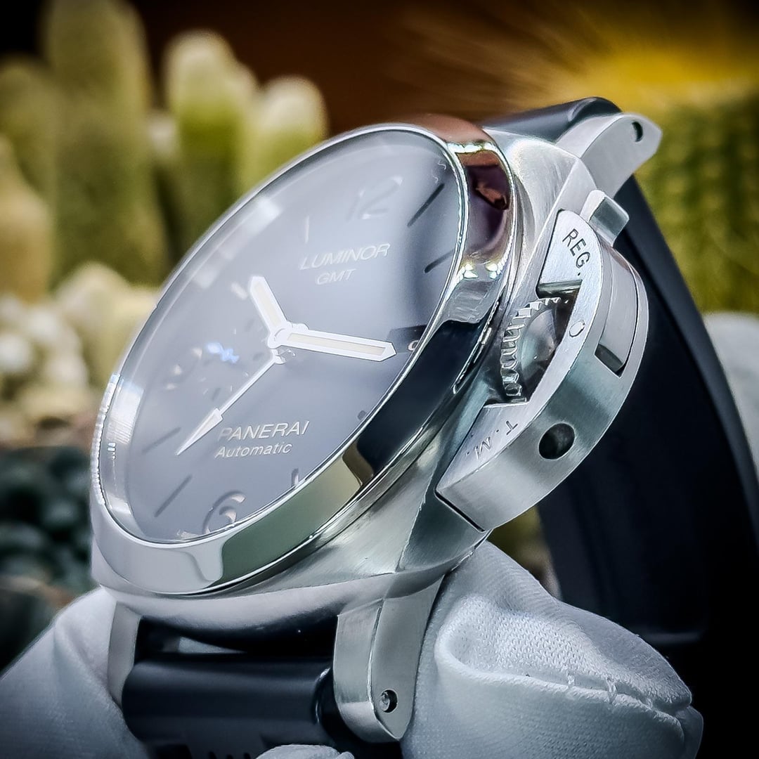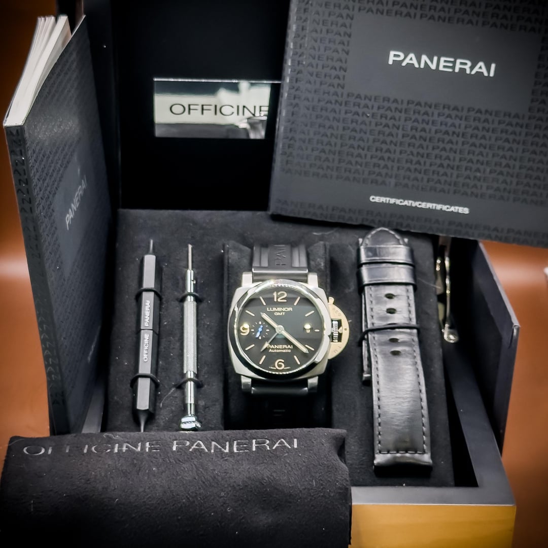 2019 Pam Luminor 1950 3 Days GMT Automatic Ref PAM01320 + additional leather O3M Strap 44mm steel on Rubber or Leather, calibre P.9011 automatic movement and 3 day power reserve, GMT function, small seconds at 9 o’clock and date at 3 o’clock, exhibition case back, black dial with luminous silver-tone hands and indices, domed sapphire crystal and protected crown. MSRP: $10,110 Asking: 5500 shipped Will entertain trade offers Excellent Condition - Crystal/Dial/Bracelet is clean.. Complete Set: Includes inner wooden box, outer cardboard box, international warranty, Manual, microfiber cloth, strap tool kit and additional leather O3M strap Ships from Scottsdale, AZ, with Priority Overnight Shipping from FedEx **All images are taken by Cactus Luxe Collective LLC and product is owned by us and in our possession. These images are copyright Cactus Luxe Collective, LLC.