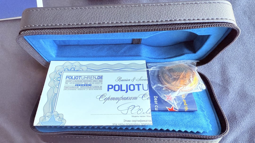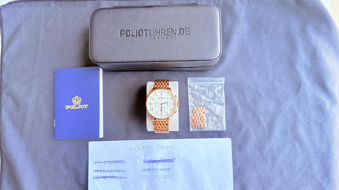 Hello all, I'm selling my Poljot Chronograph Journey (Caliber 31681) in rose gold color . Comes with everything: manual, certificate, extra links, spare metal back cover and a storage box. The case is in excellent shape - I don't see a single scratch. The bracelet has a few links that developed some nice darkening (patina?) around the pivot points (you can see it in one of the pictures). In my opinion, it actually looks quite good like that. Asking for $500 net to me. I accept PayPal (F&F or G&S, either one is fine). While I have not sold here yet, I have more than 30 verified trades on r/mechmarket. I can provide the references if you want. Specs: Movement: Caliber Poljot 31681 Case: stainless steel rose gold plated Dial: white Diameter: 41 mm Thickness: 13 mm From the manufacturer: This elegant chronograph in the rose gold stainless steel case is characterized above all by the classic dial design with applied Arabic numerals, the date between "1" and "2", the additional 24-hour display at "6", the silver-white dial and the rose gold-colored hands. The stepped case at the top looks particularly interesting and the glass back is secured with 4 screws. With the crown fixed at the "10" position, the internal 12-hour bezel can be turned - this is inserted very precisely into the case and does not rattle when the watch is shaken. Very rare Poljot hand-wound caliber 31681 with 25 jewels, shock protection, 21,600 vibrations and a power reserve of approx. 48 hours! 3ATM splashproof. Lug width 20mm