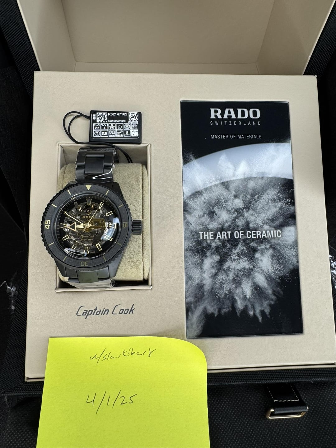 For sale is A sold out, limited edition by Rado. It is a regret to sell it but I just purchased a grail and need to consolidate. Full black ceramic bracelet, case, and bezel, bezel is treated to not get fingerprints, scratchproof material, skeleton with gold accents. 80 hour PR. This was purchased Brand New from AD and never worn. This will handily beat all comps on new! Asking $3000 shipped insured signature required in the US. The packaging on this unit is unbelievable, I'd call it better than speedy packaging. Besides shipping in all of CONUS, I can meet in Chicago or Milwaukee area. Preference to in-person buyers followed by wire/zelle buyers, but will also ship and take Paypal FF. Available for facetime to check out the watch as well Please see my extensive history on this platform, including recent sales of a No Time to Die, Pelagos, white speedmaster, and many others. I have ebay and other references available as well [timestamp ](https://imgur.com/a/wn0RKI0)for today's listing