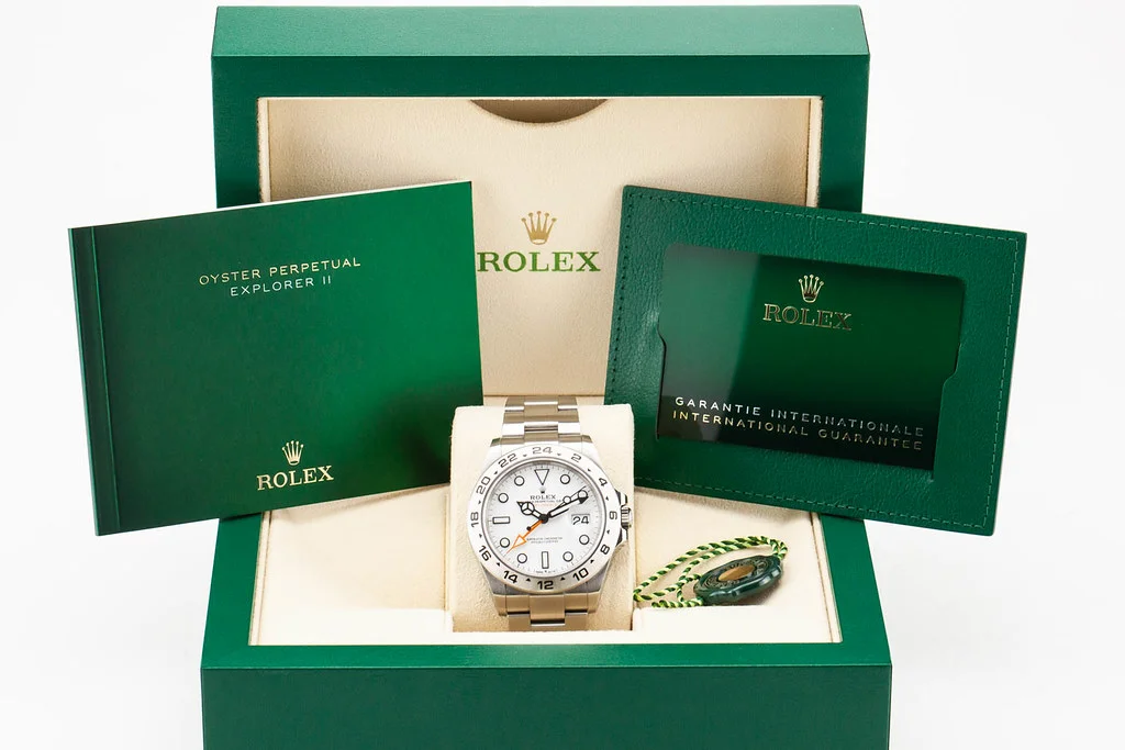 Up for sale is an excellent condition Rolex Explorer II 42mm Polar White Dial, reference # 226570. It comes with all boxes, papers, booklets, hang tag, and Rolex Warranty Card dated July 2024.