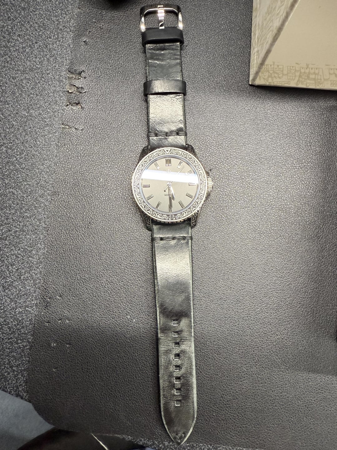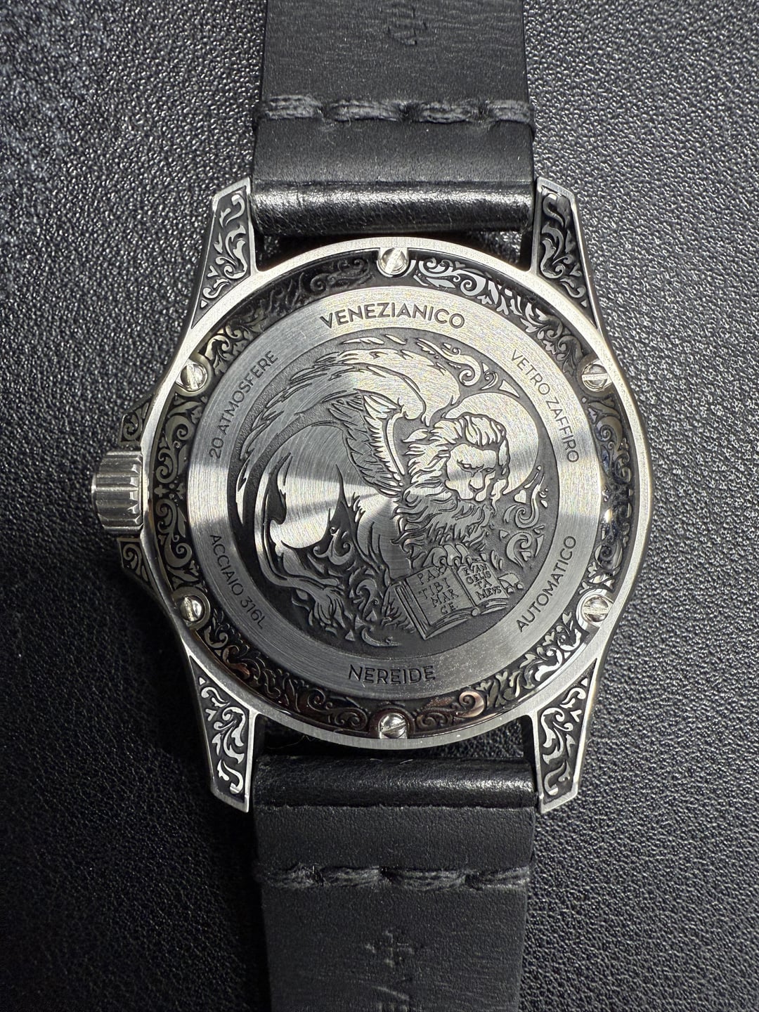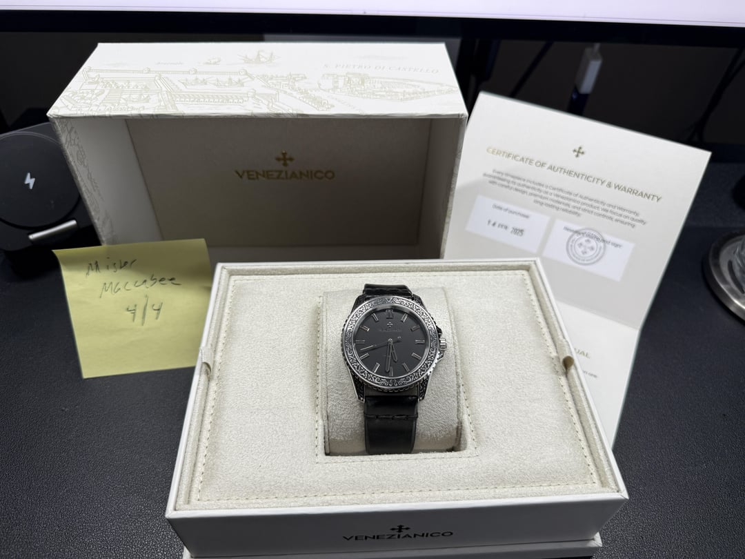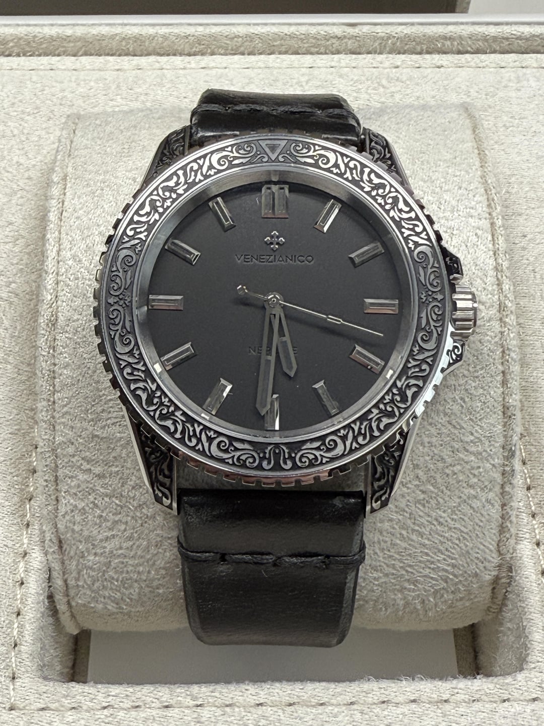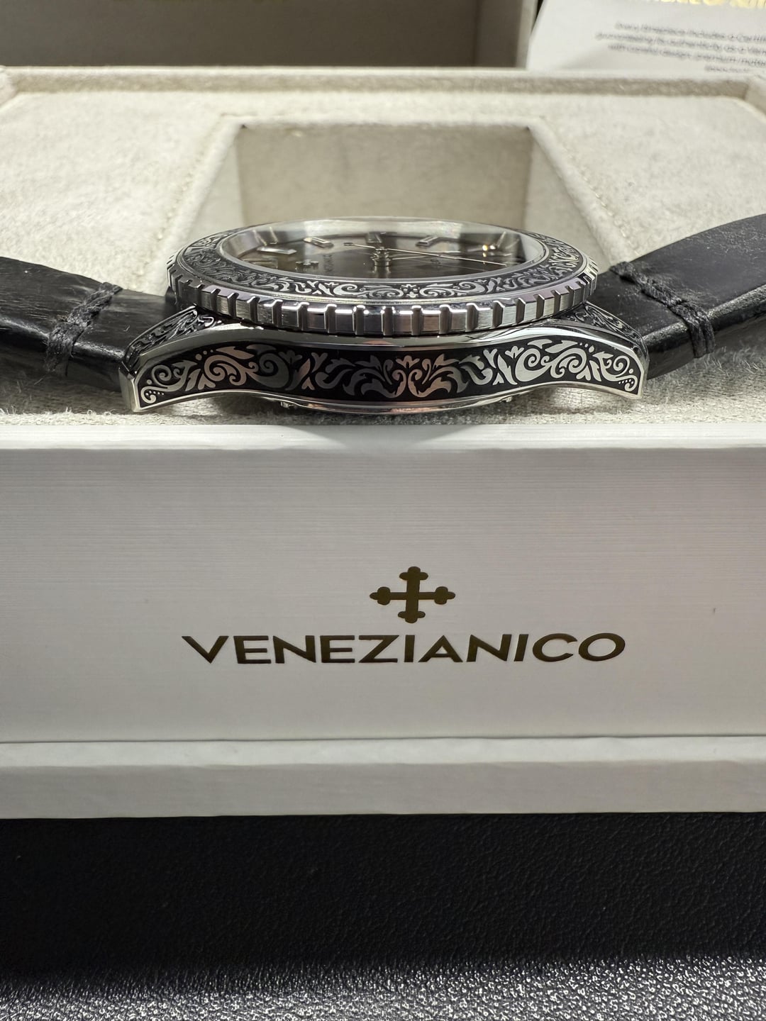 Hey folks Really beautiful edition from Venezianico that keeps selling out. Currently not available on their website. Excellent condition. Worn only a couple times. Please see pics for multiple angles to view its quality. Comes with the original hand-aged black leather strap with an engraved buckle. Really nice touch! I'll leave below some specs from their website. Comes with the new Venezianico shipping box which is also a treat :) $800 shipped via USPS Priority Mail conus only PayPal F&F preferred (G&S ok but you will have to pay the addt 3% PayPal fee). I have 15 positive transactions here with good feedback so please read them. Also have an eBay store with hundreds of sales and hundreds of positive feedback so read them as well (offtherakcollectibles) Sale only, no trades. Ships from NYC so if you’re in area can meet up locally. Please leave a comment here so I can view your transaction history and then message me if you’re interested. Thanks! \------------ The Nereide Acquaforte stands out for its finely engraved case, adorned with a refined Renaissance pattern inspired by acanthus leaves, paying tribute to the timeless elegance of neoclassical art. The minimalist black dial, enhanced with polished indexes, strikes a perfect balance between aesthetics and functionality. For the first time, the indexes and hands are coated with Black Swiss Super-LumiNova®, emitting a subtle green glow to ensure impeccable readability even in low light, while staying true to the artistic and neoclassical essence of this timepiece. **CASE MATERIAL:** 316L Stainless Steel **DIMENSIONS:** Ø42 mm, lug to lug 49.00 mm **DECORATIONS:** Engraved case filled with ink **MOVEMENT:** Automatic Cal. Miyota 9039 **CRYSTAL:** Sapphire Glass with anti-reflective coating **LUMINOUS MATERIAL:** Black Swiss Super-LumiNova® **BEZEL:** 316L Stainless steel, 120 clicks WR: 20ATM (= 200mt) **STRAP:** Hand-aged Leather, engraved buckle