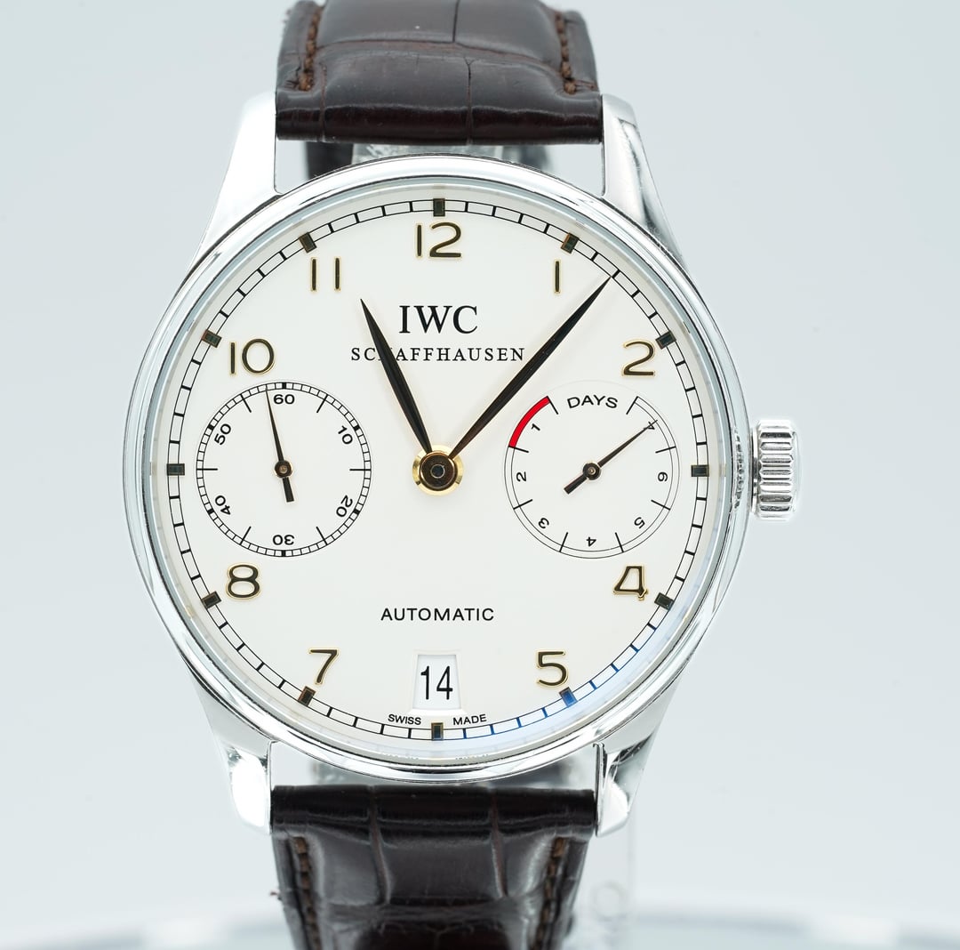 **\[WTS\] IWC Portuguese Automatic 7 Day Reserve Silver Dial IW500114 !** **Location**: U.S.A. / South Carolina **Condition**:This timepiece comes as a watch only sale. The watch is in nice pre-owned condition. The case as you can see in the photos has some typical cosmetic wear. The case has some small pinpoint dings. The strap shows some wear but still has plenty of life left. The crystal has some typical light AR coating wear. Mechanically the watch is functioning as it should. Serial numbers & names are blurred in photos only for privacy reasons. **Price: $5500** **Payment Method: Bank Wire Transfer**  **Shipping:** I ship fully insured Fedex overnight after clearing of the wire transfer. International buyers please reach out and we can discuss options. **Details** * Reference Number: IW5001-14 * Bezel: Fixed Smooth Stainless Steel * Band: Brown Alligator Leather on steel deployant buckle * Case: Stainless Steel * Case Diameter: 42.3mm * Movement: Automatic * Crystal: Sapphire * Dial Color: Silver * Functions: Hours, Minutes, Small Seconds, Date, Power Reserve Indicator * Year: N/A * Water Resistance: 30 Meters * Power Reserve: 7 Days/168 Hours * ·       Water Resistance: 100 Meters * ·       Year: N/A Pictures: [https://imgur.com/a/yTJYDB6](https://imgur.com/a/yTJYDB6)  Timestamp:[https://imgur.com/a/O263qG7](https://imgur.com/a/O263qG7)