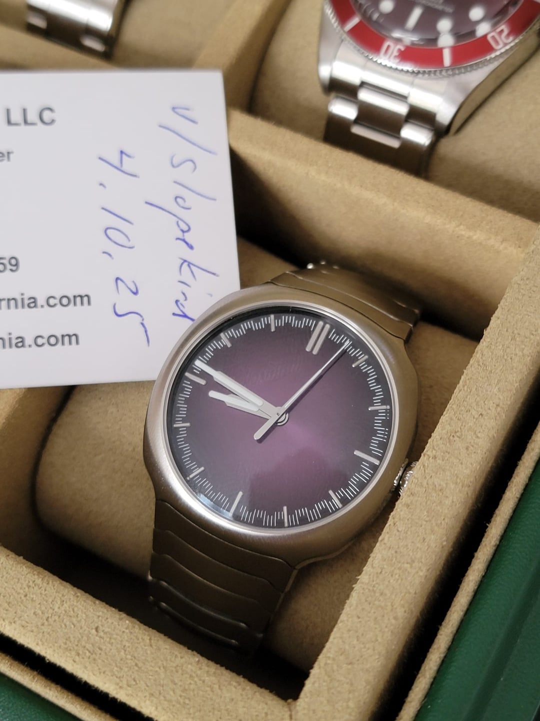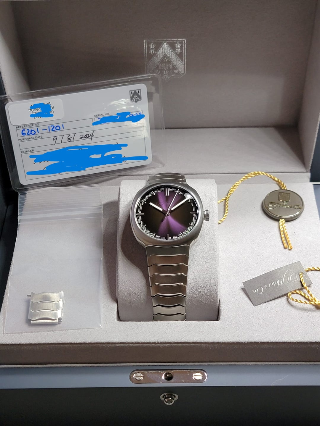 H Moser Streamliner Purple Haze Ref: 6201-1201 This watch is in mint condition with no signs of visible wear. Will come complete with double box, serial tags, full links, and warranty card dated and filled out 9/8/2024. Price - $22,999 shipped Pics & Timestamp = [https://imgur.com/a/pVqrYqh](https://imgur.com/a/pVqrYqh) IG = watchfornia Cheers, Adam