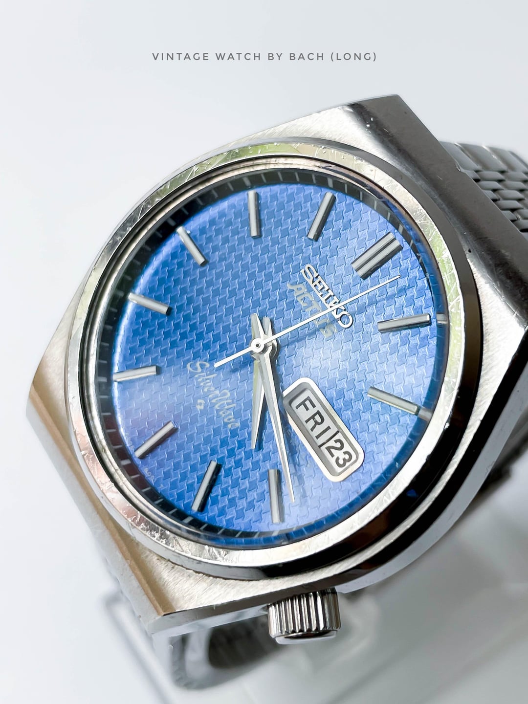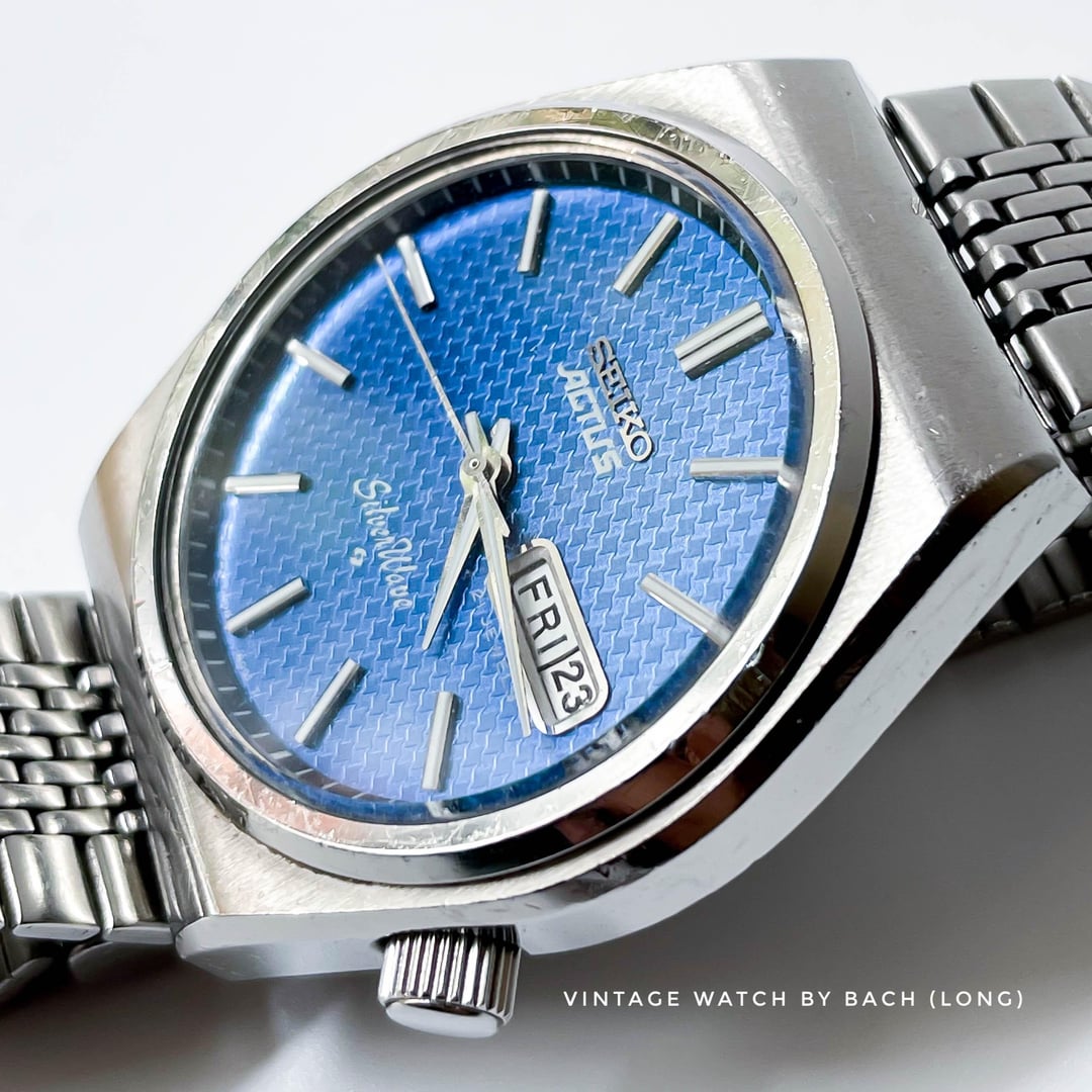 **Seiko Actus Silverwave 6306-8010 (Automatic)** **SPECIFICATIONS:** \- Japanese Seiko Actus Silverwave exellent condition from 1976, classic and vintage style. This model is combination of two most representative models that enlivened Seiko at the time, the Actus and Silverwave. These model was loved by people of all generations because of its sporty, waterproof performance and simple design. \- Seiko stainless steel strap, fit up to 21cm wrist. \- Stainless steel case size 37mm (without crown), Lug to Lug: 41mm, Lug Width: 18mm, Thickness: 10mm. \- Blue houndstooth pattern on the dial make it look three-dimensional. White dauphine hands with raised shinny hour markers add more depth to the dial. Bold calendar box for Kanji/English day and date. \- Screwdown crown at 4 o’clock position . \- Quickset for day and date, by screw the crown out (counter-clockwise) then pulling out the crown at first position and wind it. \- The swirl logo applied at the bottom of the dial, means Suwa Factory - today's Seiko Epson. **CONDITION:** The watch is well preserved for its age (See Photos). The original movement is serviced and works perfectly fine (keeping the time, changing the day and date). Please note that only adjust the date/day in 6-7 o’clock (safe time), must not adjust it in 9PM-4AM or the movement will be broken. When setting time, it’s recommend to winding the minute hand in clockwise direction. Winding in counter- clockwise might damage the movement. Recommend to avoid getting wet for vintage watch. The watch has been tested for 1 month and operate stablely before selling. **SHIPPING AND PAYMENT:** \- Worldwide shipping via UPS (cost me 60-80 USD) with tracking number. 6-8 business days. \- Price 310 USD (free shipping). PayPal F&F or G&S (+4.4% transaction fee paid by buyer) \- Import duties, taxes and charges are not included in the item price . These charges are the buyer’s responsibility. Please check this prior to buying. These charges are normally collected by shipping company (UPS). For more beautiful watches, visit: Etsy store: [https://vintagewatchbybach.etsy.com](https://vintagewatchbybach.etsy.com) Chrono24: Please DM for product links. Ebay store: [https://www.ebay.com/usr/vintagewatch\_bybach](https://www.ebay.com/usr/vintagewatch_bybach) Instagram: [https://www.instagram.com/vintagewatch\_bybach](https://www.instagram.com/vintagewatch_bybach)