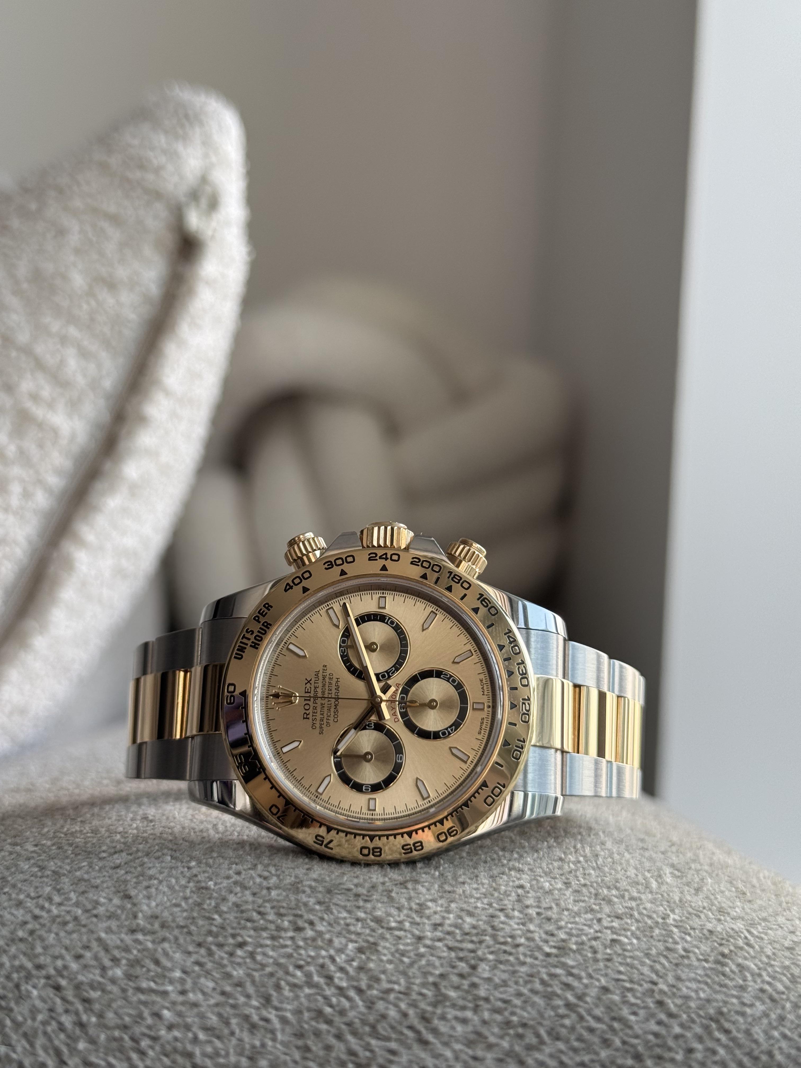 Rolex Daytona Two-Tone 126503 champagne dial. The watch comes as a complete set -wt and is in like-new condition. The card is dated late 2024. [Timestamp](https://i.imgur.com/VOLU6aA.jpeg) [Photos](https://imgur.com/a/CN71039) [Follow me on IG for more watches](https://www.instagram.com/watchauren/) Price - 22750 delivered *Crypto welcome