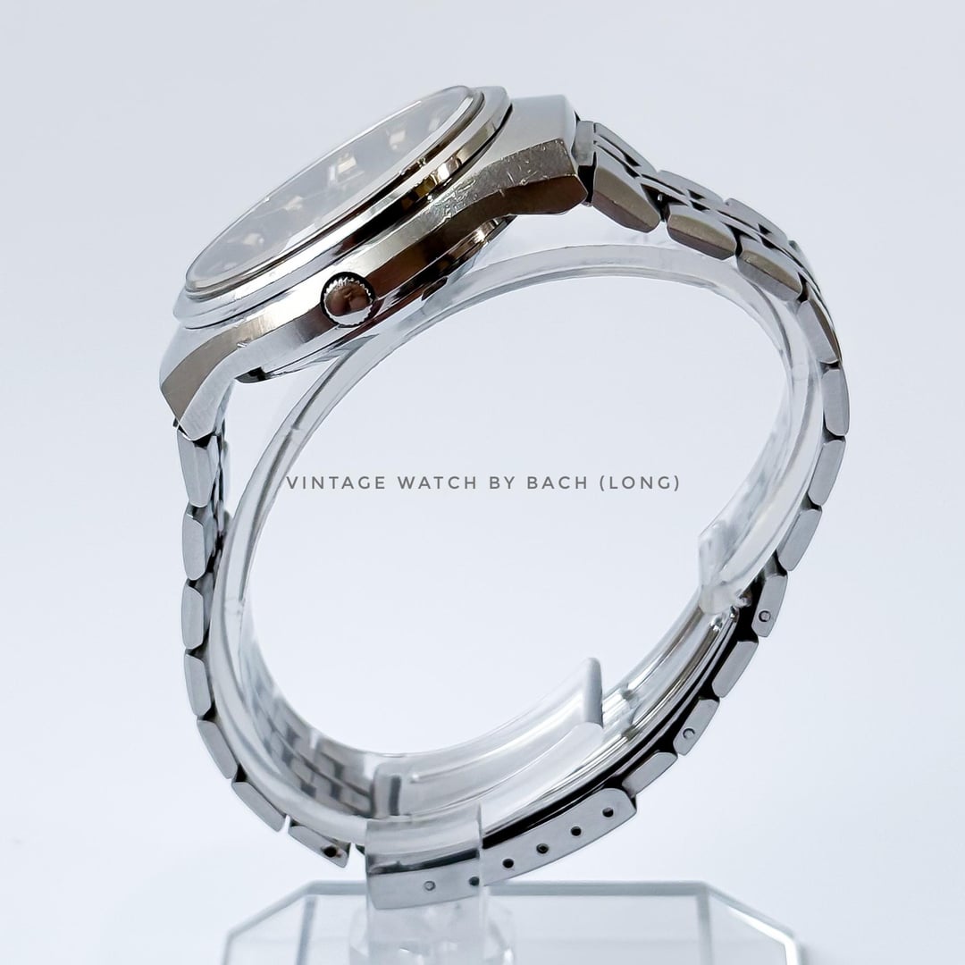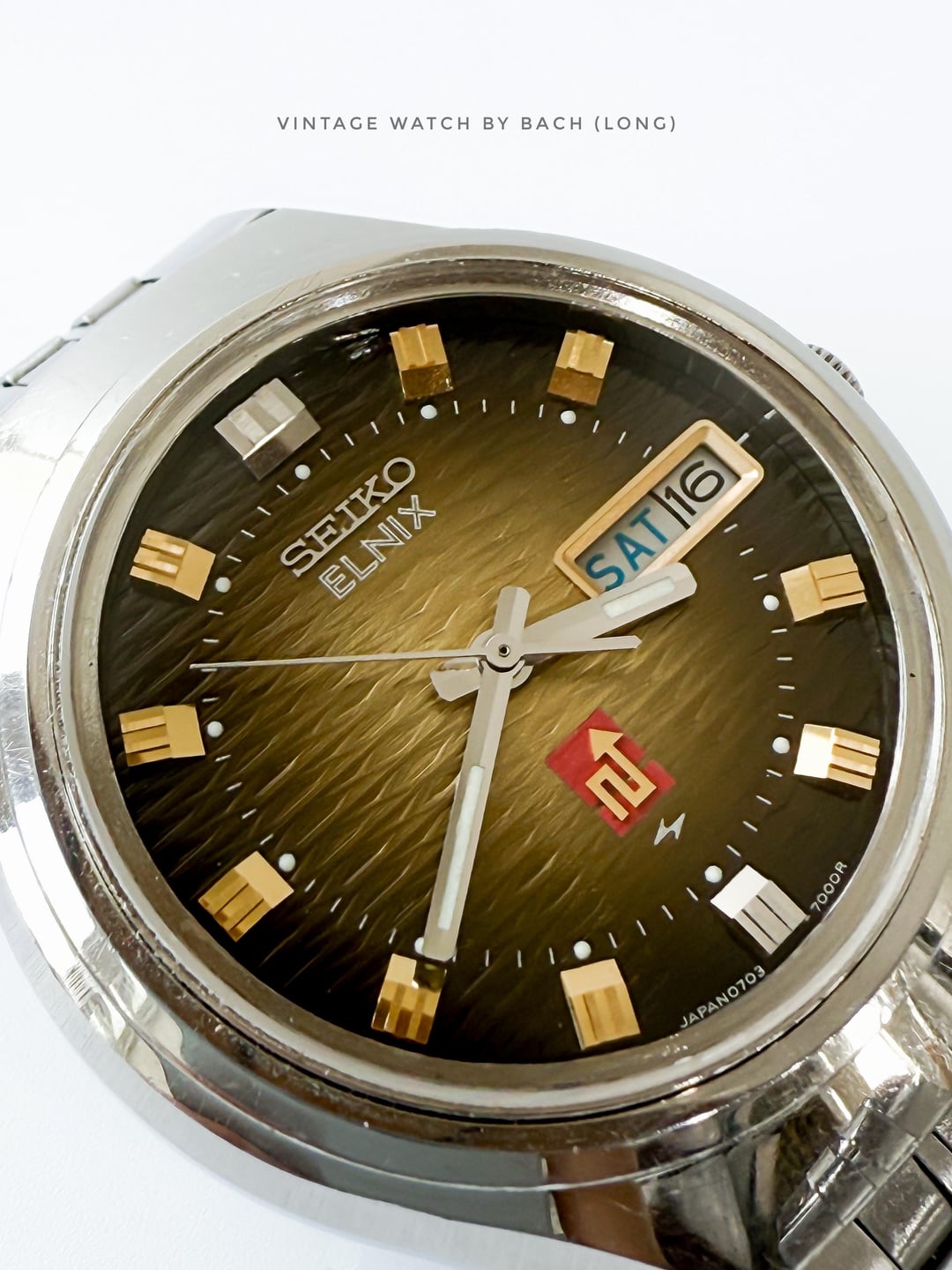 **Seiko Elnix 0703-7000 Guilloche Brown Dial** **SPECIFICATIONS:** \- Japanese Seiko Elnix excellent condition from July 1973. Classic and vintage style. Elnix were a kind of hybrid movement – they were mechanical but needed a battery. Runs for much longer time and higher accuracy than a mechanical watch. \- Original Seiko stainless steel strap, fit up to 19cm wrist. \- Stainless steel case size 37mm (without crown), Lug to Lug: 39mm, Lug Width: 17mm, Thickness: 11mm. Suitable with all wrist size. \- Guilloche brown dial, glowing light when seen from different angles. Thick baton hands with raised shinny steel hour markers, which not only enhance readability but also provide sophistication to this timepiece. \- Bold calendar box for Kanji/English day and date at 3 o’clock position. \- Sweeping seconds hand feature. \- 3D Elnix logo applied at the bottom of the dial (A snake with the arrow-head) **CONDITION:** The watch is well preserved for its age (See Photos). There are some inevitable hairline scratches on the case. The crystal and dial are almost good as new. The original movement works well and changing the day and date as it should be. Serviced and replaced with new battery. The movement needs to be calibrated after purchase for more accurate time. Recommend to avoid getting wet for vintage watch. The watch has been tested for 1 month and operate stablely before selling. It's recommend to set the day/date when the watch is at 6-7 o'clock. Do not change the date/day between 9:00 p.m. and 3:00 a.m or the movement will be broken. **SHIPPING AND PAYMENT:** \- Worldwide shipping via UPS (cost me 60-80 USD) with tracking number. 6-8 business days. \- Price 270 USD (free shipping). PayPal F&F or G&S (+4.4% transaction fee paid by buyer) \- Import duties, taxes and charges are not included in the item price. These charges are the buyer’s responsibility. Please check this prior to buying. These charges are normally collected by shipping company (UPS). For more beautiful watches, visit: Etsy store: [https://vintagewatchbybach.etsy.com](https://vintagewatchbybach.etsy.com) Chrono24: Please DM for product links. Ebay store: [https://www.ebay.com/usr/vintagewatch\_bybach](https://www.ebay.com/usr/vintagewatch_bybach) Instagram: [https://www.instagram.com/vintagewatch\_bybach](https://www.instagram.com/vintagewatch_bybach)