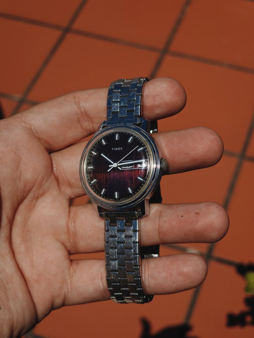 This 1976 Timex aged wonderfully. Originally blue, the dial gained a deep purple, almost burgundy-like colour from years of sun exposure. I’ve seen a few examples that were starting to change colour, but not as much as this one. The watch also features a barcode-style pattern on the dial that’s incredibly hard to see. I’ve attached a few pictures for a better look. It’s powered by the Timex caliber M27, an improved version of the ever-popular M24. It also includes a stretch steel bracelet. **Condition:** Very good. The case has some usage marks. Please see the pictures for a better description. **Case Size:** 35.1 x 39.5mm chrome-plated case with a thickness of 11.6 mm and a lug width of 18mm. **Crystal:** Acrylic **Movement:** Timex M27, manual wind, 18,000 bph with a 42-hour power reserve. I don’t know its service history, but everything is working as it should. **Price:** Asking $70. Please add $20 for worldwide shipping. Payment methods include Wise, ACH transfer, Revolut, Bitcoin (On-Chain or Lightning), or PayPal G&S for buyers with solid references. Add +6% for currency conversion fees on the latter. I’m located in Portugal, but worldwide shipping isn’t an issue. Established seller with over 220 transactions – buy with confidence! Make sure to follow me on Instagram (@daily.worn) to check out the newest additions. [Pictures](https://imgur.com/a/z77jzzt) [Timestamp](https://imgur.com/a/qMMeqd7)