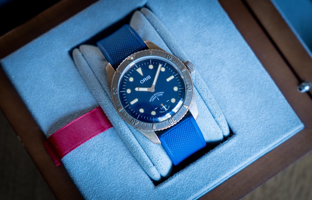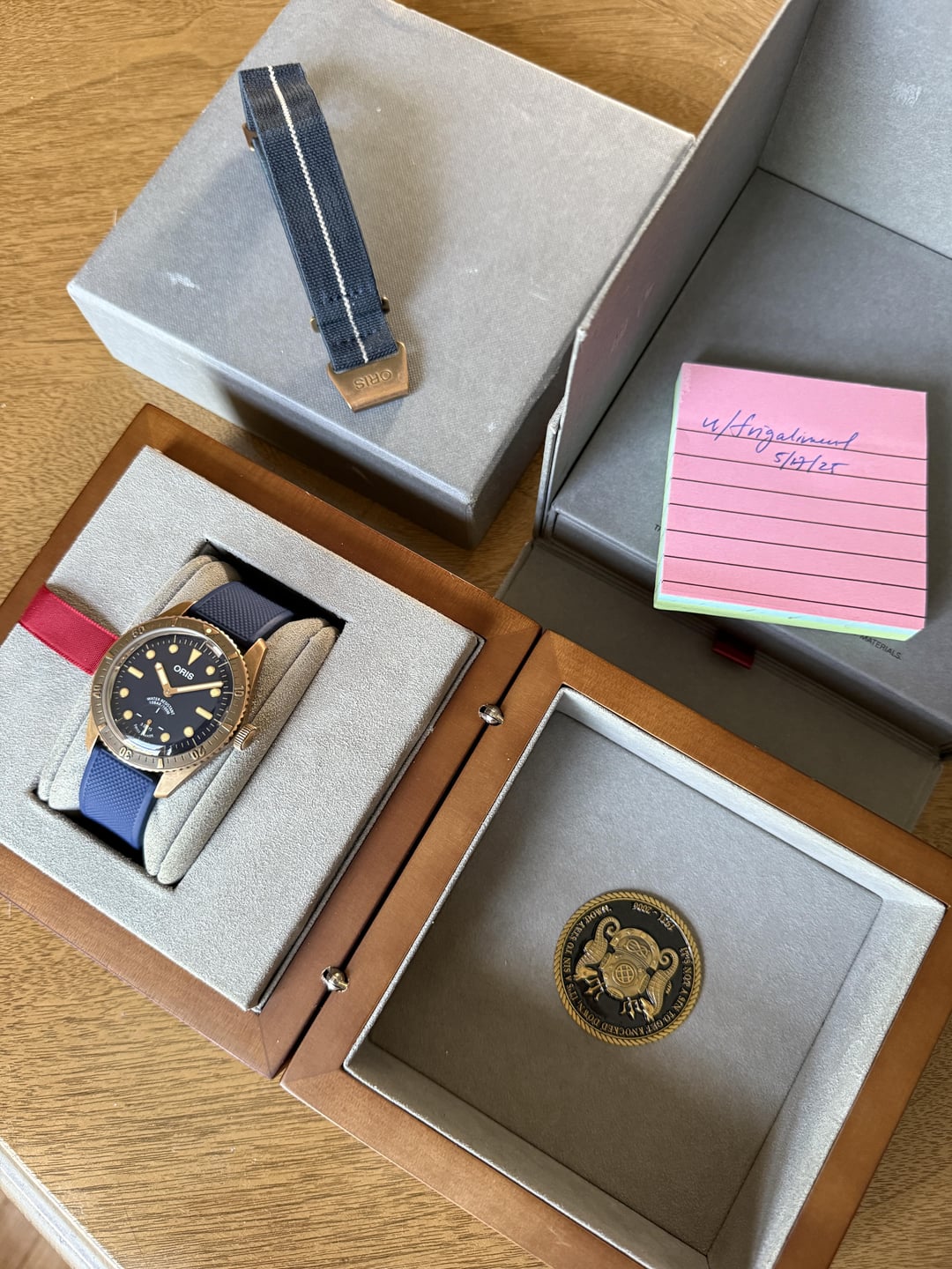 Reluctantly letting go of my Oris Carl Brashear Cal 401. This watch is exceptional, featuring a striking deep blue dial and a five-day power reserve. It has begun developing a beautiful patina, allowing you the opportunity to continue its unique aging process. The watch functions flawlessly and cosmetically excellent with the exception of the patina and some light scratches on the caseback and is incredibly comfortable on the wrist. Additionally, I have purchased a navy rubber strap along with a bronze buckle, enabling you to wear it with or without the OEM Erika's strap while maintaining consistent bronze hardware throughout. Comes with box, manuals, warranty card and the remaining OEM warranty that's good till 2031. **Price**: $2100 shipped in the CONUS. Would only consider trades involving possibly a BB58 blue or BB54. **Info**: [https://www.oris.ch/en-US/product/watch/divers/carl-brashear-calibre-401-limited/01-401-7764-3185-Set?srsltid=AfmBOor92OesEKLKj3tep8EYorQL69rUiF9h97Ak5ZP\_Y-gjJSPVHurM](https://www.oris.ch/en-US/product/watch/divers/carl-brashear-calibre-401-limited/01-401-7764-3185-Set?srsltid=AfmBOor92OesEKLKj3tep8EYorQL69rUiF9h97Ak5ZP_Y-gjJSPVHurM)