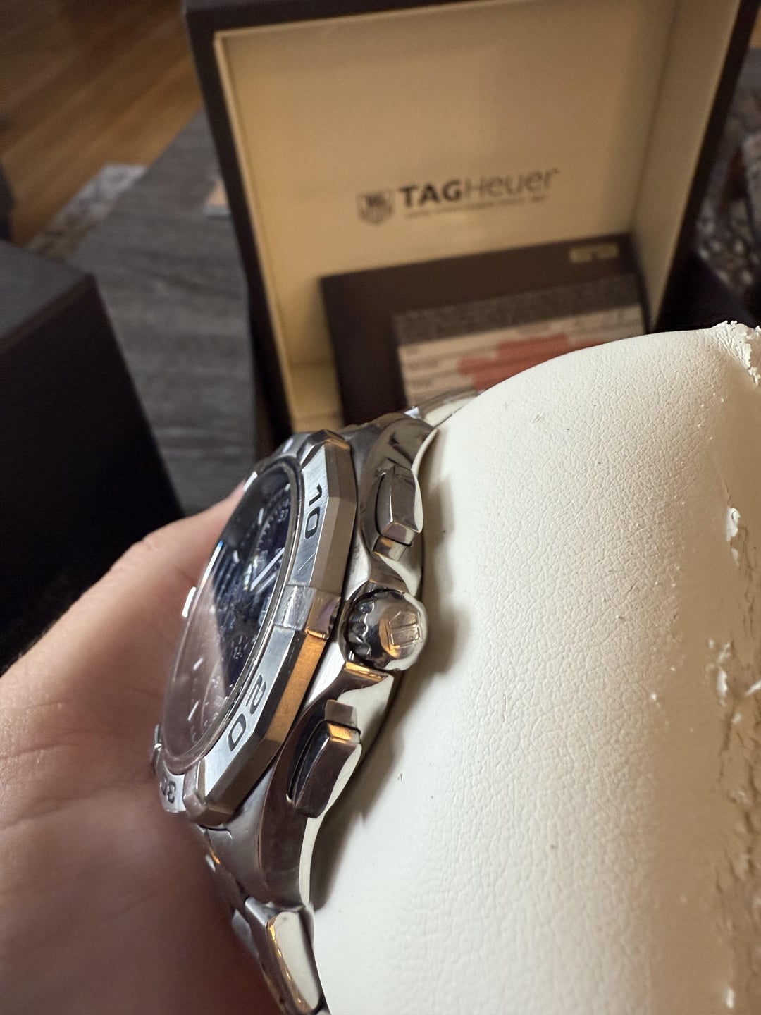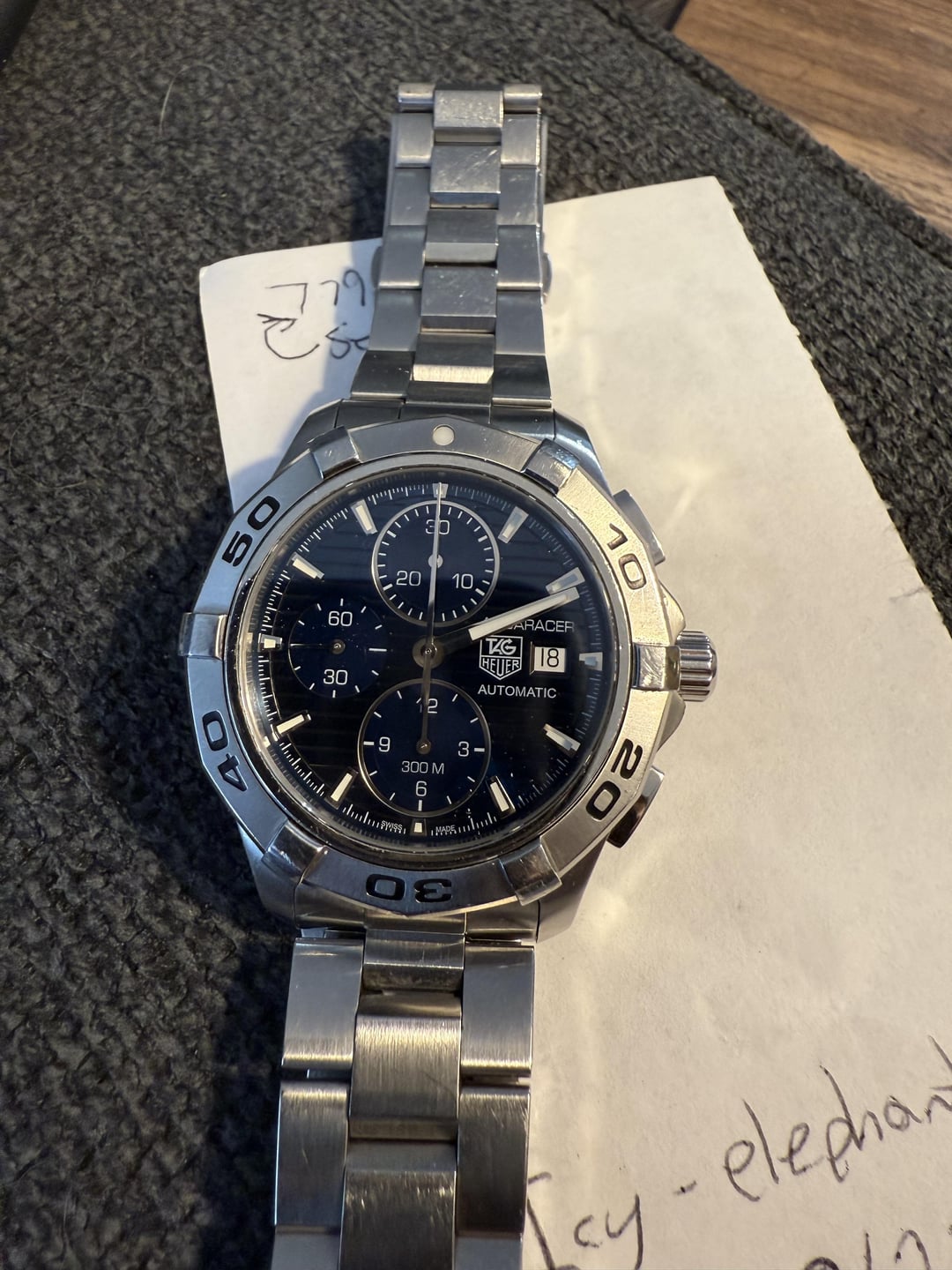 For sale only: Tag Heuer Aquaracer 43mm Comes complete full set from 2013! Watch functions as it should , chrono functions work perfect and snap right back to the reset position. Crown screws right in a few turns, winds nice , overall in nice shape! Has some scratches on the clasp mostly but nothing that couldn’t get polished to like new. $1050 shipped anywhere in the USA