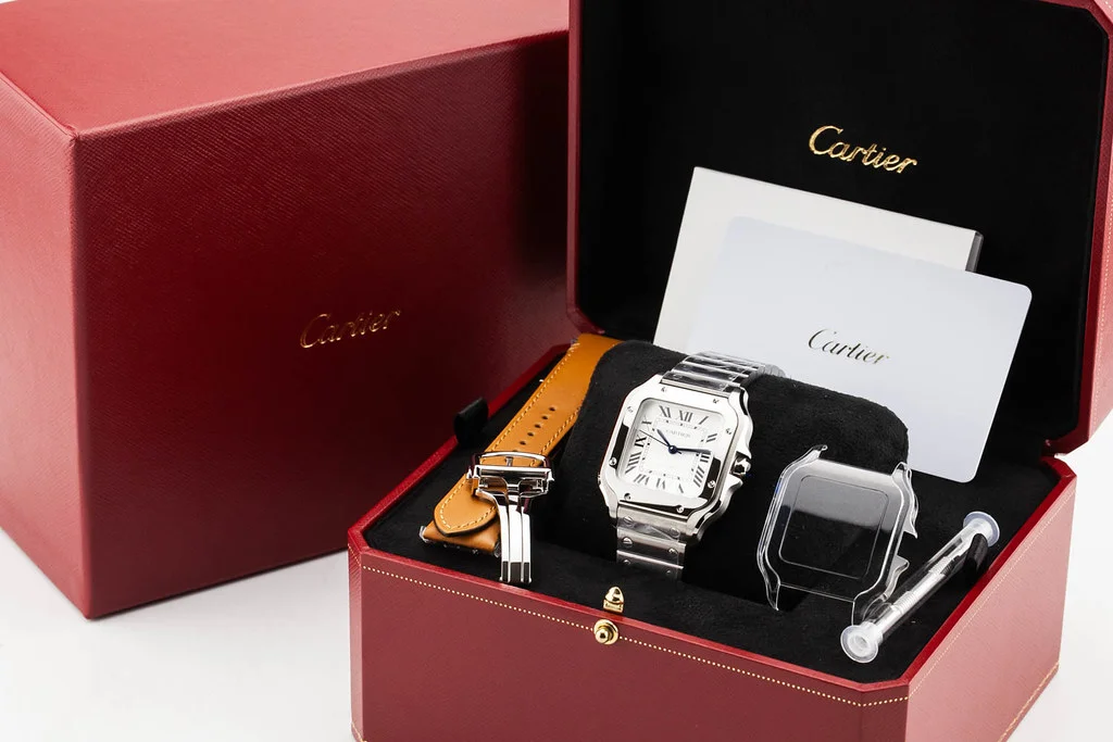 Up for sale is a brand new Cartier Santos De Cartier Medium Size, reference # WSSA0029. It comes complete with all boxes, papers, booklets, Smartlink straps & clasp, tools, hang tag, bezel guard, and Cartier Warranty Card dated May 2025.