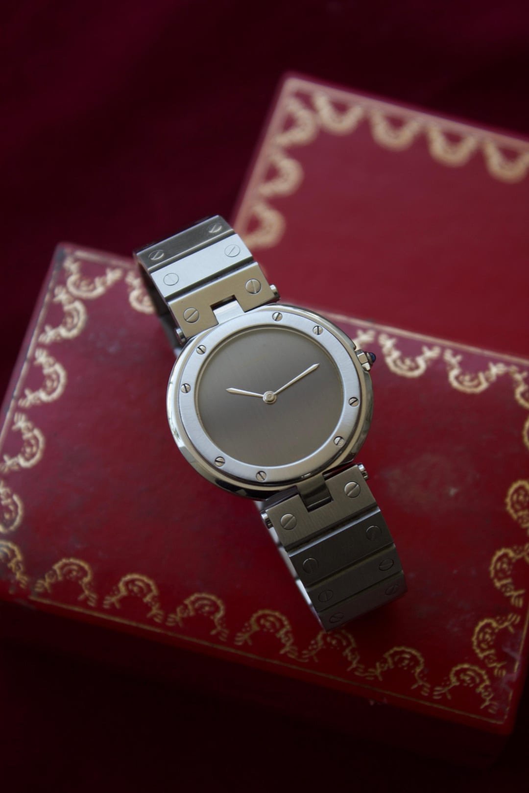 Cartier Santos Ronde Ghost Dial Reference 8192, this vintage Cartier features a 33mm case size with a rare grey/ghost dial. Subtle golden ‘Cartier’ that becomes visible at certain light angles. An all steel case that has been polished, and is in good condition. Bracelet will fit 7 inches. There seems to be a spot/bump on the dial above the logo visible on close inspection but something that can be easily ignored. Powered by a quartz movement. Circa 1980s approx Watch only Price: 2100$ through Zelle shipped via fedex conus