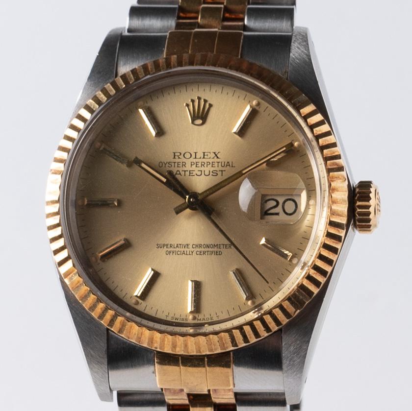 1987 Rolex Datejust 16013 Champagne Dial $5,350 Classic two tone champagne dial datejust reference 16013 with acrylic crystal, in incredible vintage condition. The gold portions of the watch on the bezel and bracelet have developed a rosy patina over the years. The bracelet remains tight with very minimal slack. Some light scratches on the clasp, acrylic crystal. Some scratches on the hands close to the post, minor lume crack at the minute hand, and loose lume at the 4 o’clock marker. The bezel remains crisp, as do the lugs. Sharp, sharp vintage example with incredible patina to boot. Freshly serviced in-house. Serial - Year: 9.45m serial ~1987 Bracelet - Strap: 62523h 18k/ss jubilee bracelet with K clasp. Fits up to 7” wrist. Box - Papers - Accessories: Watch only Service History: 5/15/2025 in-house movement-only service with 6 months warranty from date of service. Running at 3s/d, 270 amplitude Pictures https://imgur.com/a/16013-rose-p-gm9tKdB Timestamp https://imgur.com/ZjvZo9y Watches will be shipped via FedEx upon receipt of bank wire only. Sorry, no P2P payment platforms due to scams. Zelle with references. Prices are for an outright purchase, no trades preferred. **Inquiries:** [Instagram](http://www.instagram.com/angelcitytime), PM or chat Member of r/watchexchange for years. Excellent references on other platforms and forums which I can provide upon request. Please buy with confidence. All sales are final. Thanks for looking!