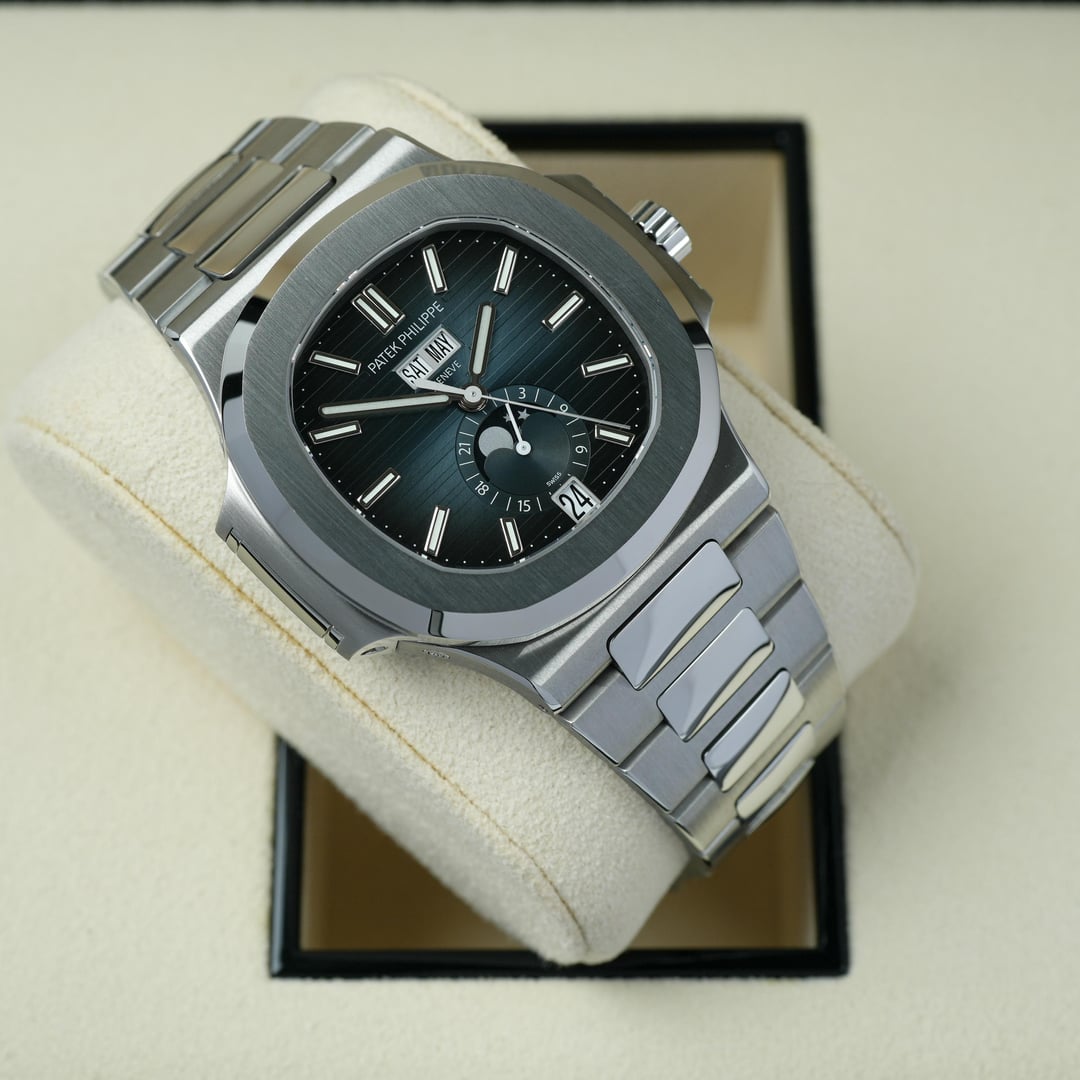 2021 Patek Philippe Nautilus 5726/1A-014 Blue Annual Calendar Steel 40.5mm Complete Timestamp: [https://imgur.com/uz43VFP](https://imgur.com/uz43VFP) A sought-after reference that embodies the brand’s tradition of refined complications within the iconic Nautilus design. Crafted in stainless steel with a 40.5mm case, it features a striking gradient blue dial with horizontal embossing. Powered by the automatic Caliber 324 S QA LU 24H/303, it offers an annual calendar, moon phase, day, date, month, and 24-hour indication. The sapphire caseback reveals the meticulously finished movement, while the integrated stainless steel bracelet ensures comfort and style. With 30m water resistance and a 45-hour power reserve, this watch blends technical sophistication with daily wearability. Comes as a complete set, Inner/Outer boxed, Booklets, Certificate, pusher, hang tag, original purchase receipt. This beautiful timepiece comes in unworn condition. Please look over my pictures closely as I like to properly represent the watch you will be receiving and contents. **Offered at $119,999 shipped in US or OBO.** Payments accepted: Wire or Direct Bank Transfer (Bank of America) only. Shipping is always FedEx/UPS overnight, fully insured. I am an avid enthusiast and collector and am not affiliated with any watch brand I post. Always open to trades. Please message with offers. I guarantee every watch I sell to be 100% authentic. Follow me on IG: JJ\_Timepiece\_Co