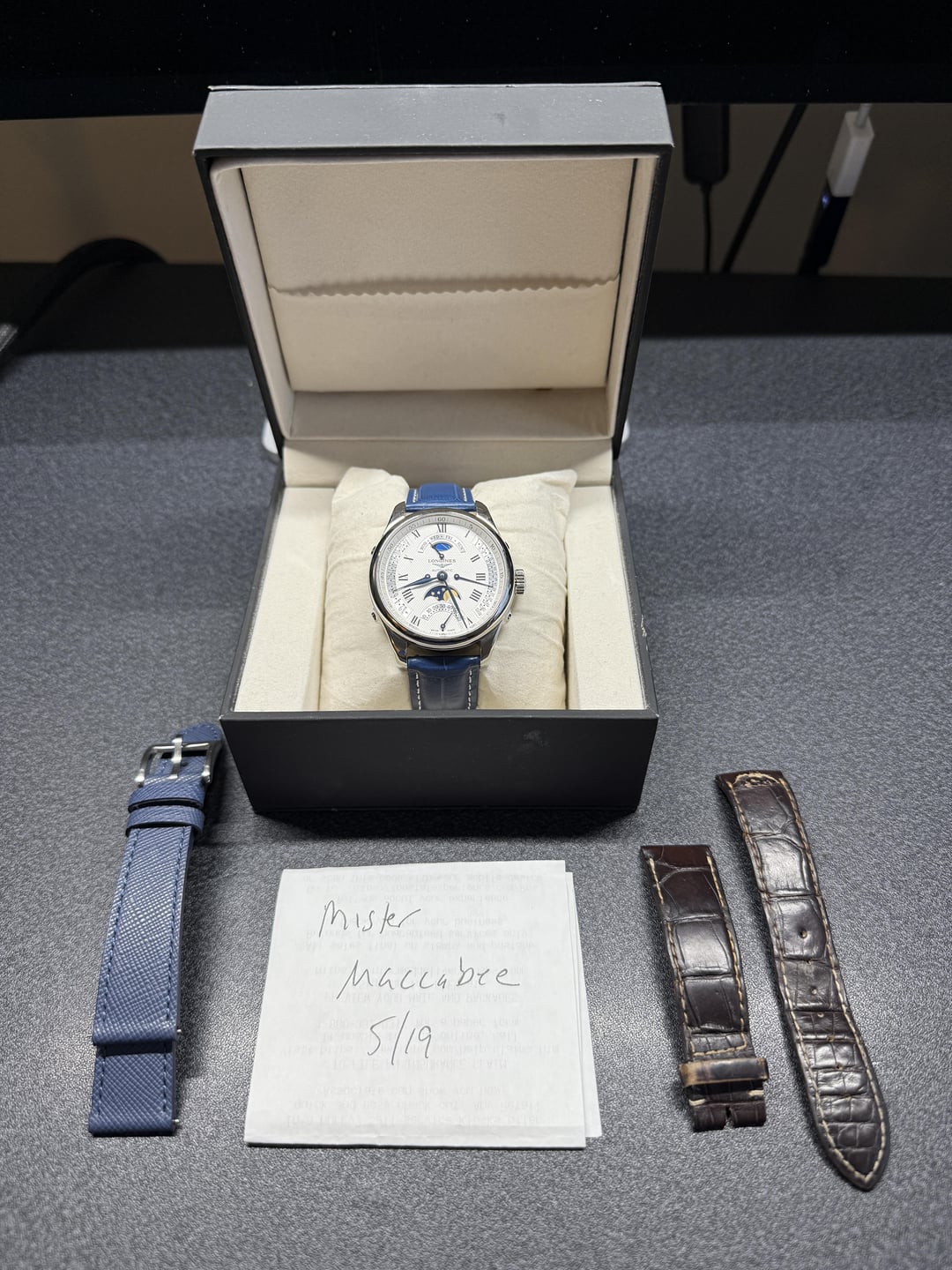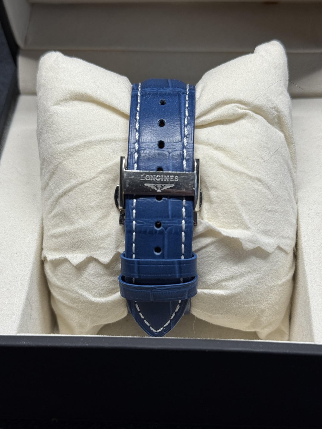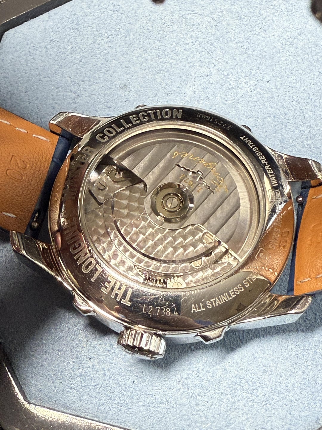 **Purchased this here on watchexchange a couple weeks back (do a search you can find the listing), loved it, full intention to wear it. Sold to me as is, no box or papers, aftermarket strap, including the original leather brown strap and the Longines clasp. Found out I can purchase a grail of mine at a good price and decided to sell a bunch including this one. The bezel was beat up so I had it polished. Based on how the bezel looked prior my guy did a super job on it. I added in a better blue leather alligator strap with an extra punched hole, attached the Longines clasp to it and it looks and feels a lot better now. I am including a small box as you can see in the pics as well. (I put in about $200 into this** post- **purchase) This is a very neat multi-complication watch from Longines, 41mm, that is now discontinued at this size. They only sell the 44mm now which is pretty giant-sized for most people. I have a 7 to 7 and a quarter inch wrist and this thicker 41mm fit perfect for me. There are some hairlines on the case due to normal wear from whomever wore this prior to my purchase (I only had the bezel polished not the case so the watch itself was never opened up and insides and movement were not touched).** $1800 shipped via USPS Priority Mail conus only PayPal F&F preferred (G&S ok but you will have to pay the addt 3% PayPal fee). I have 25 positive transactions on watchexchange with good feedback so please read them. Also have an eBay store with hundreds of sales and hundreds of positive feedback so read them as well (offtherakcollectibles) Sale only, no trades. Ships from NYC so if you’re in area can meet up locally. Please leave a comment here so I can view your transaction history and then message me if you’re interested. Thanks! \------------------------- LONGINES MASTER COLLECTION RETROGRADE, L2.738.4.71.3, Automatic watch, Ø 41.00 mm, Stainless steel. GMT Moonphase, Self winding mechanical movement beating at 28'800 vibrations per hour and providing 48 hours of power reserve. Water-resistant to 3 bar, Scratch-resistant sapphire crystal. Silver "barleycorn" dial. Alligator strap bracelet, With triple safety folding clasp and push-piece opening mechanism