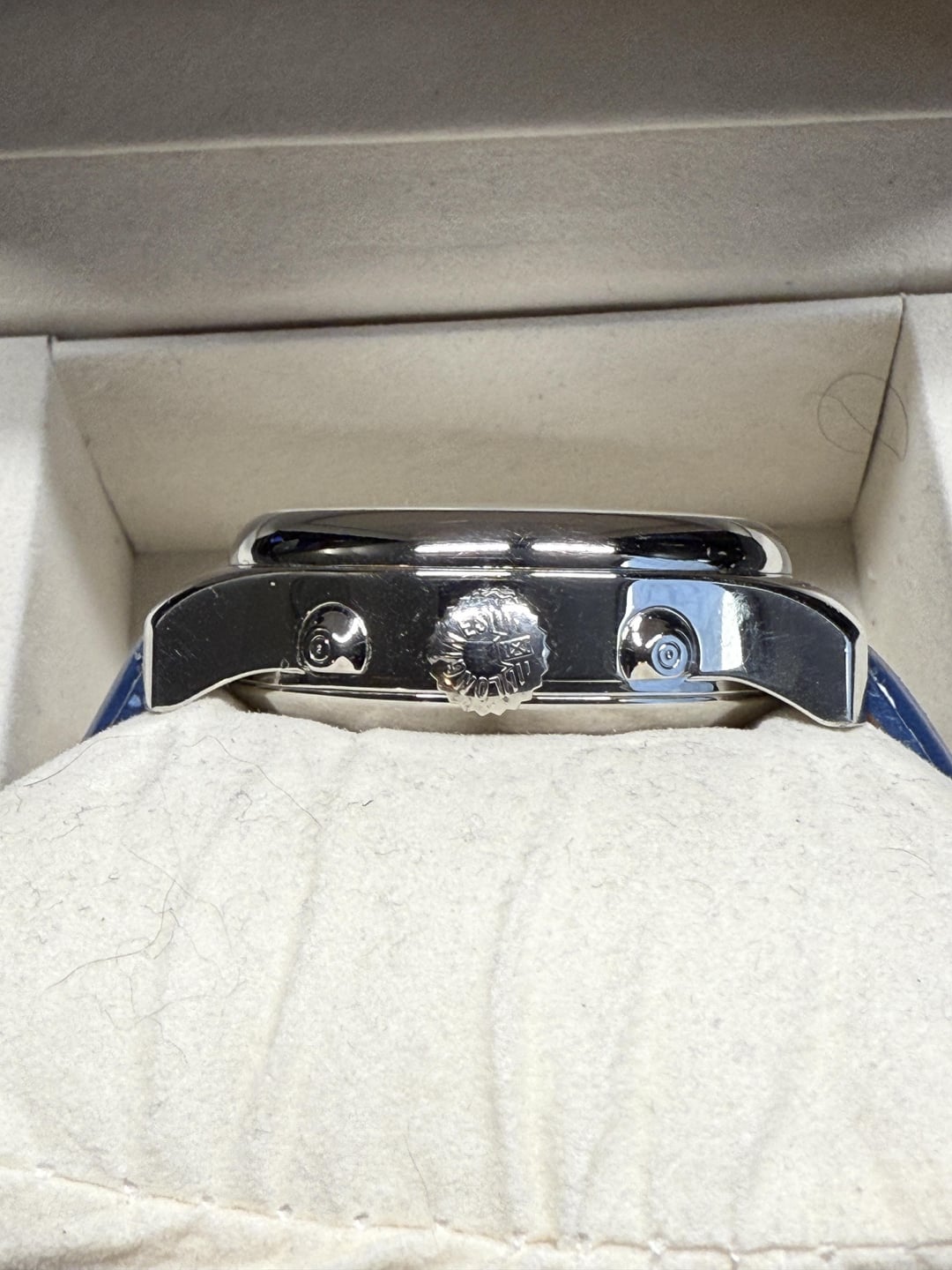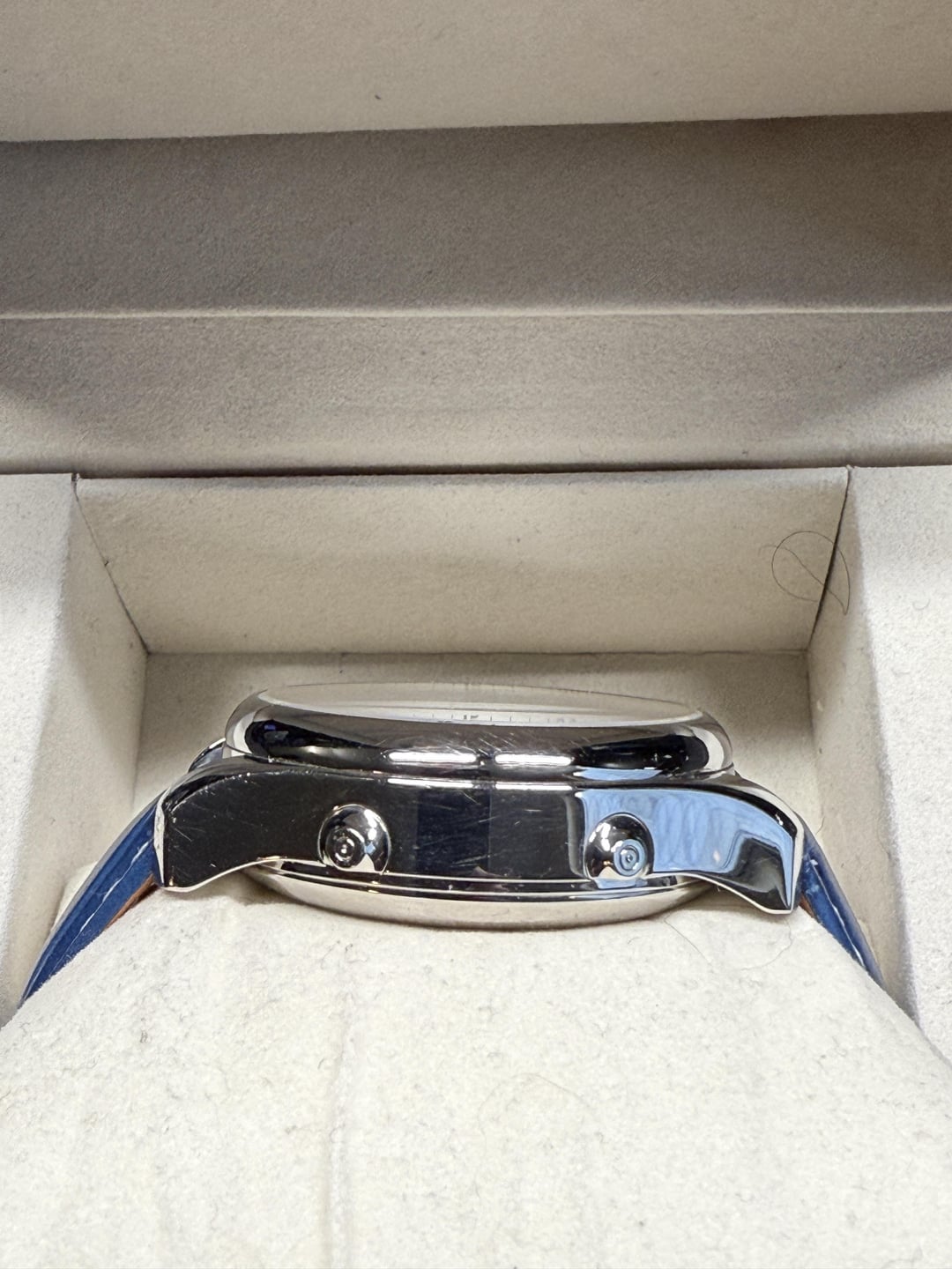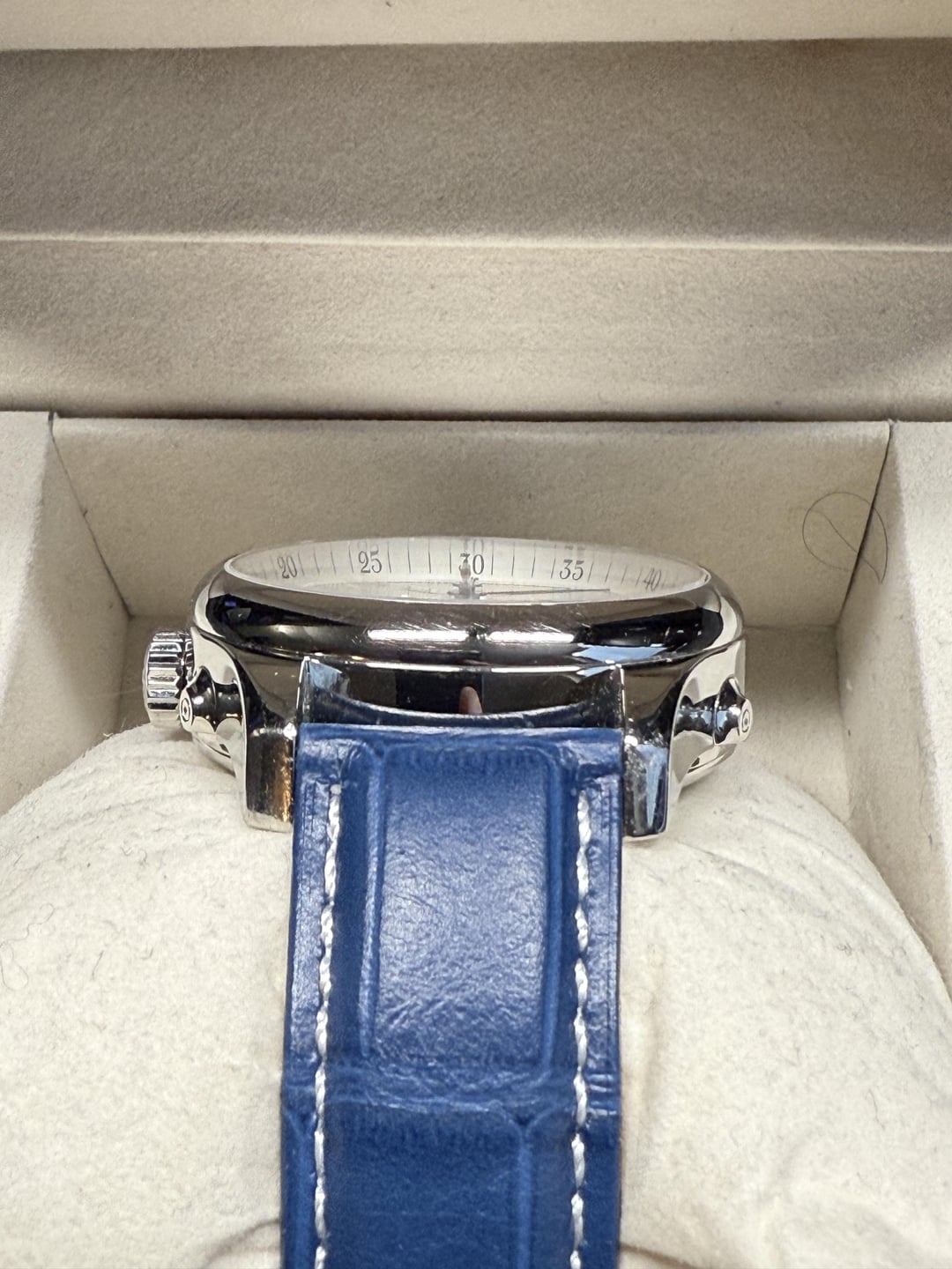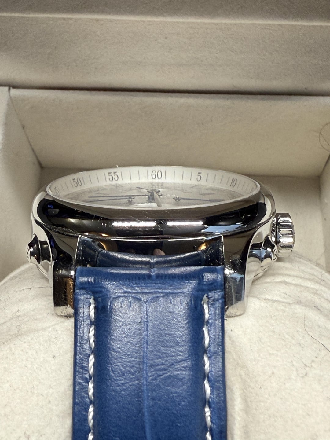 **Purchased this here on watchexchange a couple weeks back (do a search you can find the listing), loved it, full intention to wear it. Sold to me as is, no box or papers, aftermarket strap, including the original leather brown strap and the Longines clasp. Found out I can purchase a grail of mine at a good price and decided to sell a bunch including this one. The bezel was beat up so I had it polished. Based on how the bezel looked prior my guy did a super job on it. I added in a better blue leather alligator strap with an extra punched hole, attached the Longines clasp to it and it looks and feels a lot better now. I am including a small box as you can see in the pics as well. (I put in about $200 into this** post- **purchase) This is a very neat multi-complication watch from Longines, 41mm, that is now discontinued at this size. They only sell the 44mm now which is pretty giant-sized for most people. I have a 7 to 7 and a quarter inch wrist and this thicker 41mm fit perfect for me. There are some hairlines on the case due to normal wear from whomever wore this prior to my purchase (I only had the bezel polished not the case so the watch itself was never opened up and insides and movement were not touched).** $1800 shipped via USPS Priority Mail conus only PayPal F&F preferred (G&S ok but you will have to pay the addt 3% PayPal fee). I have 25 positive transactions on watchexchange with good feedback so please read them. Also have an eBay store with hundreds of sales and hundreds of positive feedback so read them as well (offtherakcollectibles) Sale only, no trades. Ships from NYC so if you’re in area can meet up locally. Please leave a comment here so I can view your transaction history and then message me if you’re interested. Thanks! \------------------------- LONGINES MASTER COLLECTION RETROGRADE, L2.738.4.71.3, Automatic watch, Ø 41.00 mm, Stainless steel. GMT Moonphase, Self winding mechanical movement beating at 28'800 vibrations per hour and providing 48 hours of power reserve. Water-resistant to 3 bar, Scratch-resistant sapphire crystal. Silver "barleycorn" dial. Alligator strap bracelet, With triple safety folding clasp and push-piece opening mechanism