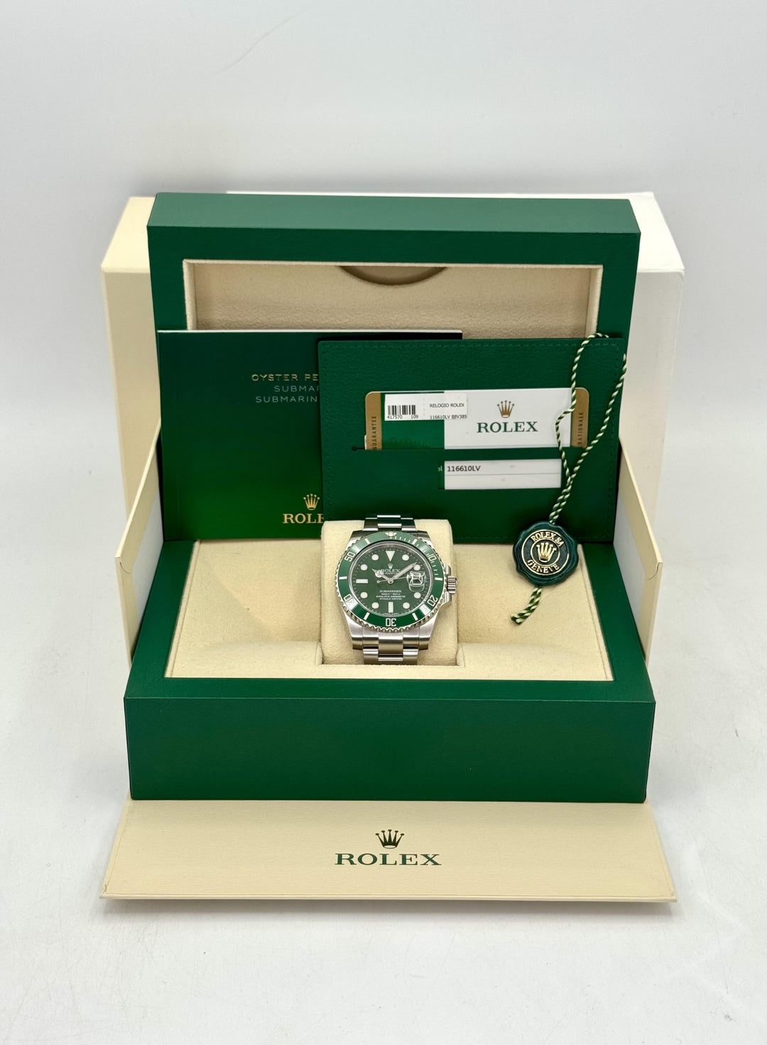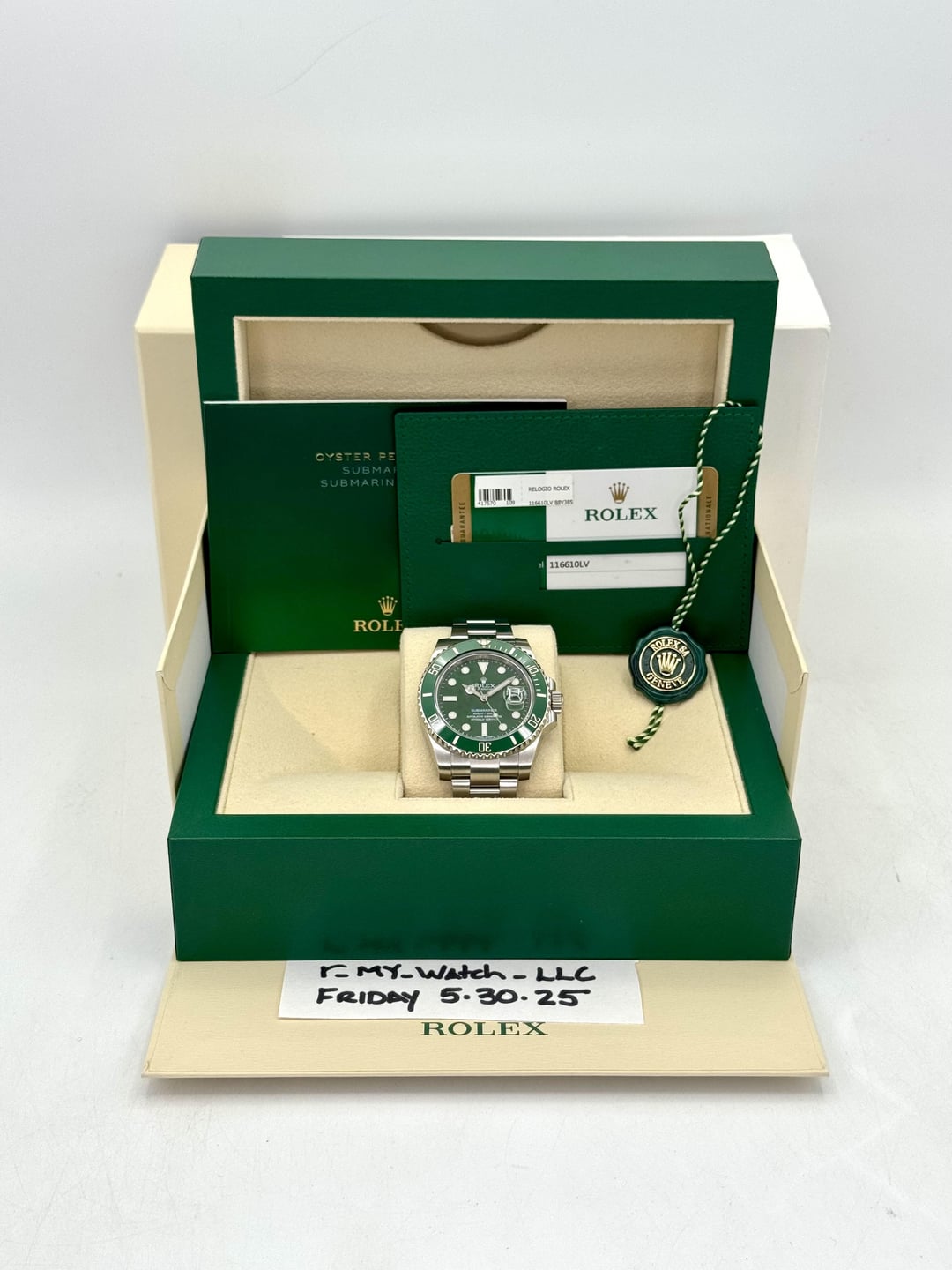 🔵2015 Rolex Submariner “Hulk” 40mm 116610LV Oystersteel with Oyster Bracelet and Green Dial 🔵TRADE or SELL us your luxury watch, all brands considered. Message me details. **Includes the following:** ✔️Original Rolex Double boxed ✔️Box and Papers - Yes ✔️Warranty card dated 2015 ✔️Manual and Warranty booklets ✔️Green Hang Tag included ✔️Material: Stainless Steel ✔️Size: 8.25inch wrist (Full Links) ✔️Watch is in excellent overall condition. Please see photos for details. ✔️[Trades](https://mywatchllc.com/pages/sell-rolex-watch) welcome ✔️Appraisal included Business Name: **My Watch LLC** LOCATION: Oak Park, Michigan ✔️[MyWatchLLC.com](http://mywatchllc.com) for current inventory ✔️Google Business Listing [https://g.co/kgs/Cmd6FPW](https://g.co/kgs/Cmd6FPW) ✔️Business Hours M-F 9-6 ✔️Facetime/Video chat/calls welcome to view the watch interested. ✔️Contact: 248-422-0909 via text or call for quickest response. 🟢TERMS: Visit [MyWatchLLC.Com](http://mywatchllc.com) for payments accepted 🟢REFERENCES/REVIEWS: We are well reviewed on all platforms from google, trust pilot, rolexforums, additionally we have 300+ reference in multiple FaceBook watch groups, reference checks welcome. 🟢SHIPPING: If you are not local, we offer Fully Insured FedEx overnight shipping in the USA for a fee. International shipping available. [https://mywatchllc.com/products/2015-rolex-submariner-hulk-40mm-116610lv-green-dial-1](https://mywatchllc.com/products/2015-rolex-submariner-hulk-40mm-116610lv-green-dial-1)