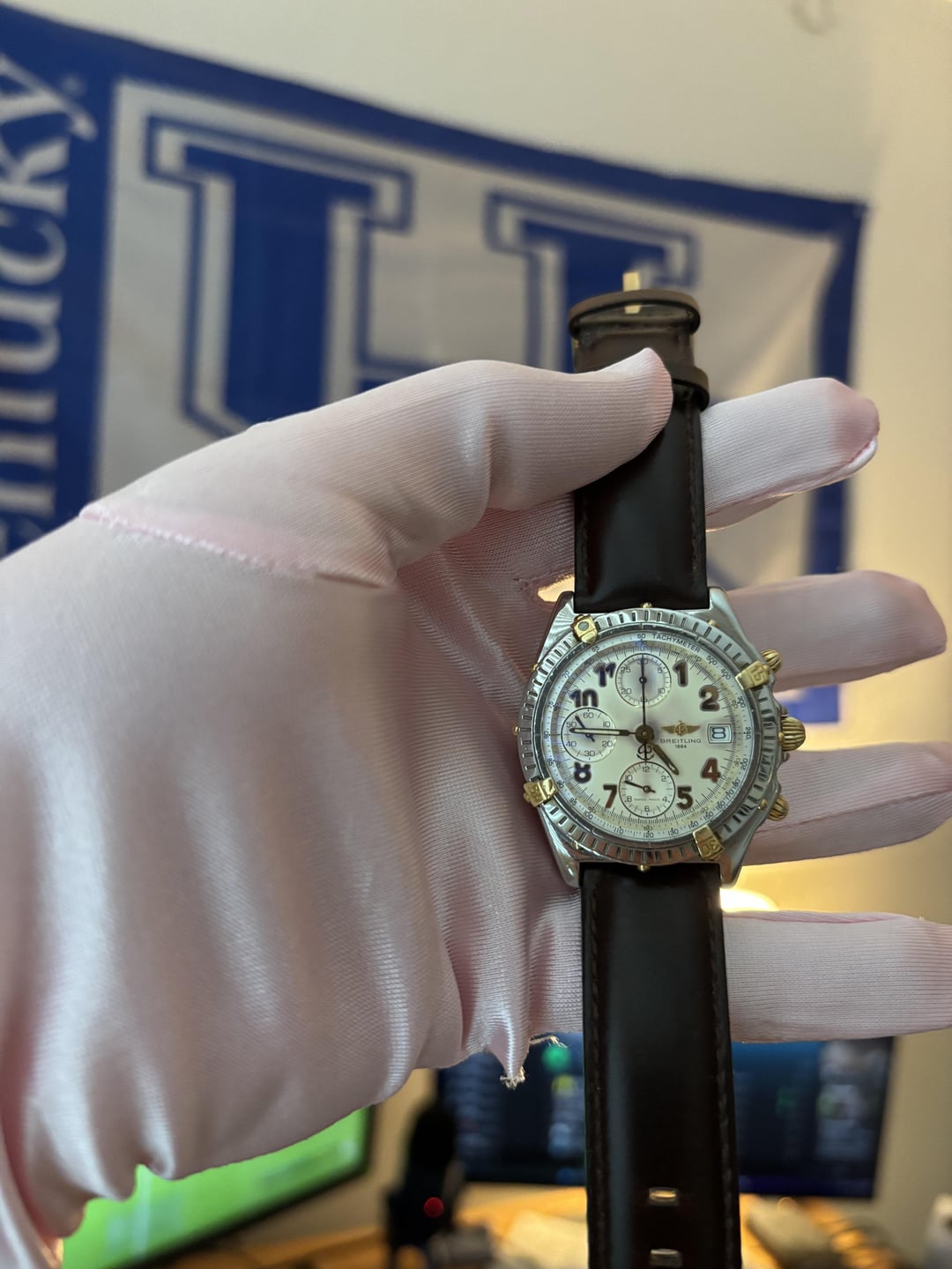 Breitling Chronomat on a leather strap! Ref b130050.1 Comes watch only as shown! Dial is slightly discolored, but a really classic look on the leather strap! Running amazing, especially for an older edition! Crystal and bezel clean as shown. Steal it for $1250 plus label 🔥