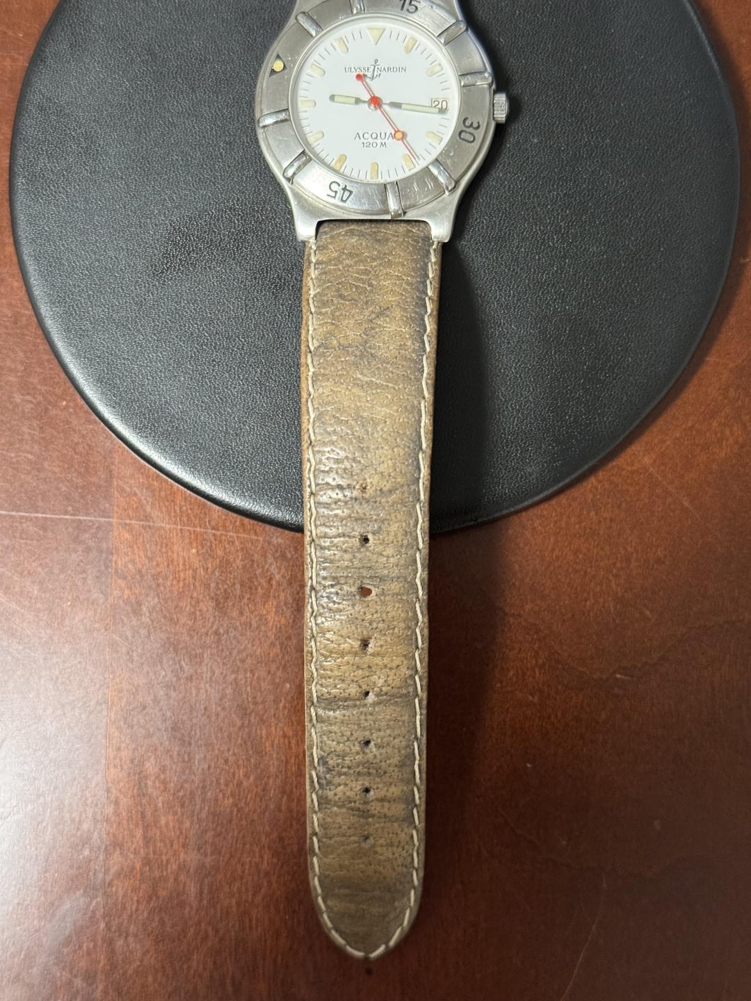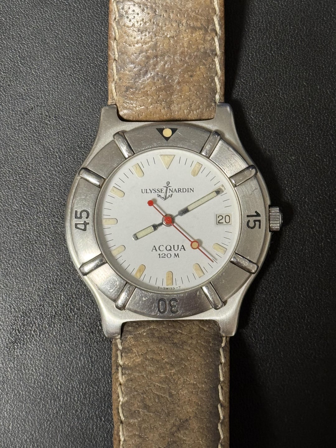 Ulysse Nardin Acqua 120m Hello watchexchange this is my first ever post, I am putting one of my personal favorite watches on the market. If you have any questions please feel free to reach out I would love to gain some reputation and interact more with the community. This watch contains a Swiss quartz movement and a rotating bezel. This is a stainless steel with a leather band that’s super high quality and has a nice touch. Stamped with Ulysse Nardin. Everything is genuine and original. Unfortunately I don’t have box or papers but I can provide with as much pictures as needed to make everything right! Sapphire crystal and has a super tiny miniature scuff that’s not even able to be seen on camera. I think this doesn’t even notice, it’s so small you can’t see nothing at all, so looks more like scuff free. It has a nice vintage look from the 1990s. I am asking $875, I believe there are very minimal out there on the market and these to me are very nice. If there’s anything I can provide to help you decide with this piece please let me know! Thanks watchexchange community!