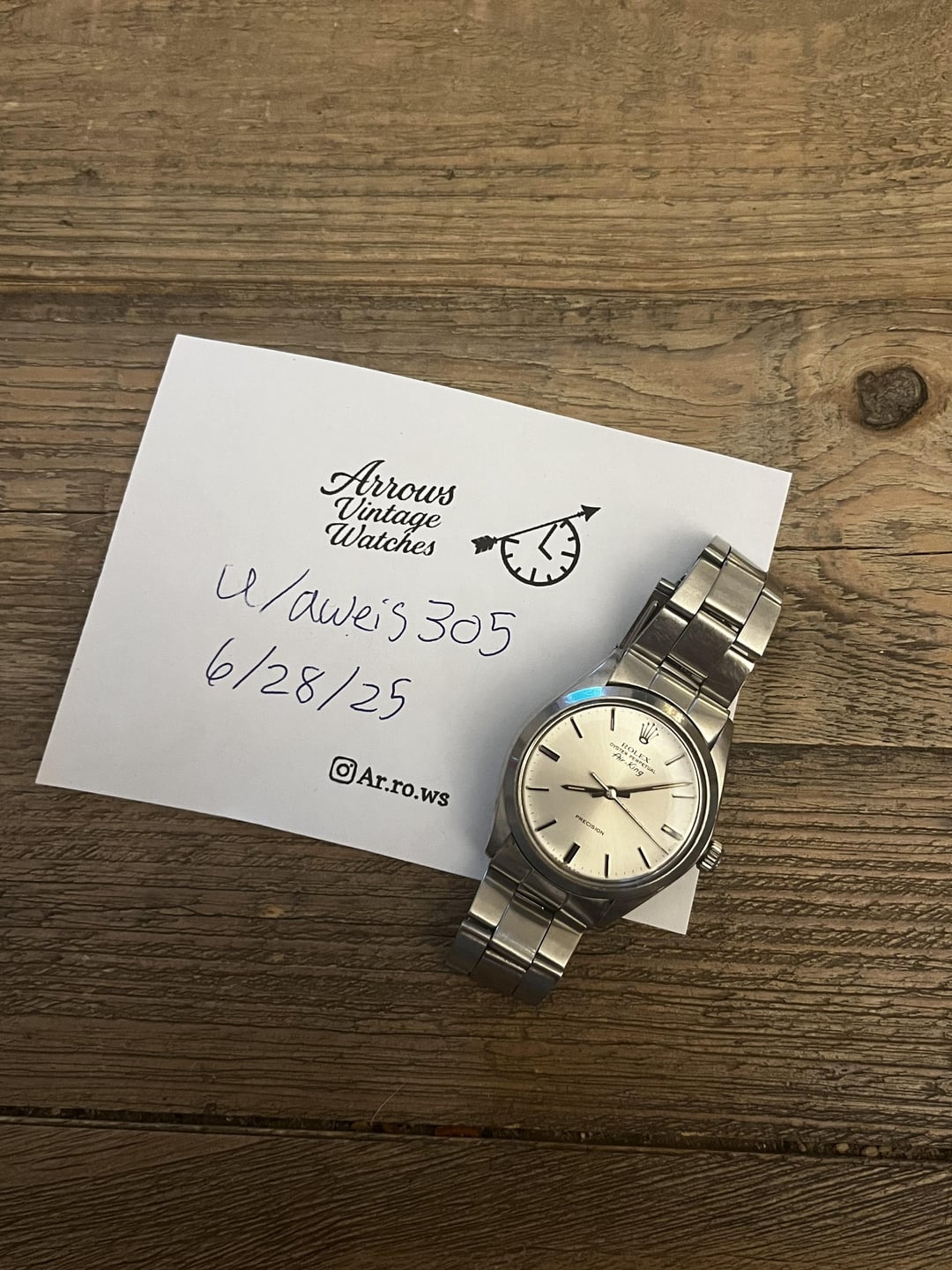 For sale is a beautifully preserved vintage Rolex Air-King 5500, a timeless classic that captures the understated elegance and reliability Rolex is known for. This particular reference is powered by the manual wind Oyster Precision movement and features a clean silver dial with simple baton hour markers, housed in the iconic 34mm Oyster case. The watch comes complete with its original green Rolex box and matching Rolex hangtag — a rare and collectible set that enhances the vintage appeal of this already desirable piece. With its minimalist styling and robust construction, the Air-King 5500 has become a go-to for collectors looking for vintage Rolex pedigree without the flash. Key Features: -Brand: Rolex -Model: Air-King -Reference: 5500 -Movement: Rolex Caliber 1520, automatic -Case: 34mm stainless steel Oyster case -Dial: Silver with applied baton markers and “Precision” text -Bracelet: Original Rolex Oyster bracelet -Includes: Original Rolex box and green hangtag -Condition: Very good vintage condition. Very minimal surface wear consistent with age; dial and hands are clean and original. Movement is running perfectly. Why Collectors Love It: The Rolex Air-King 5500 is a gateway into vintage Rolex collecting — iconic, versatile, and still surprisingly attainable. The timeless design, dependable movement, and included ephemera make this a fantastic all-around vintage watch that wears well with anything. Please reach out if you want to see this or any other watch over FaceTime. See all pictures for details and timestamp. Feel free to message, comment, or PM me any questions you may have. Shipping is included in the United States. I accept most forms of major payment. For more vintage watches and first dibs on affordable pieces follow my Instagram at: Ar.ro.ws