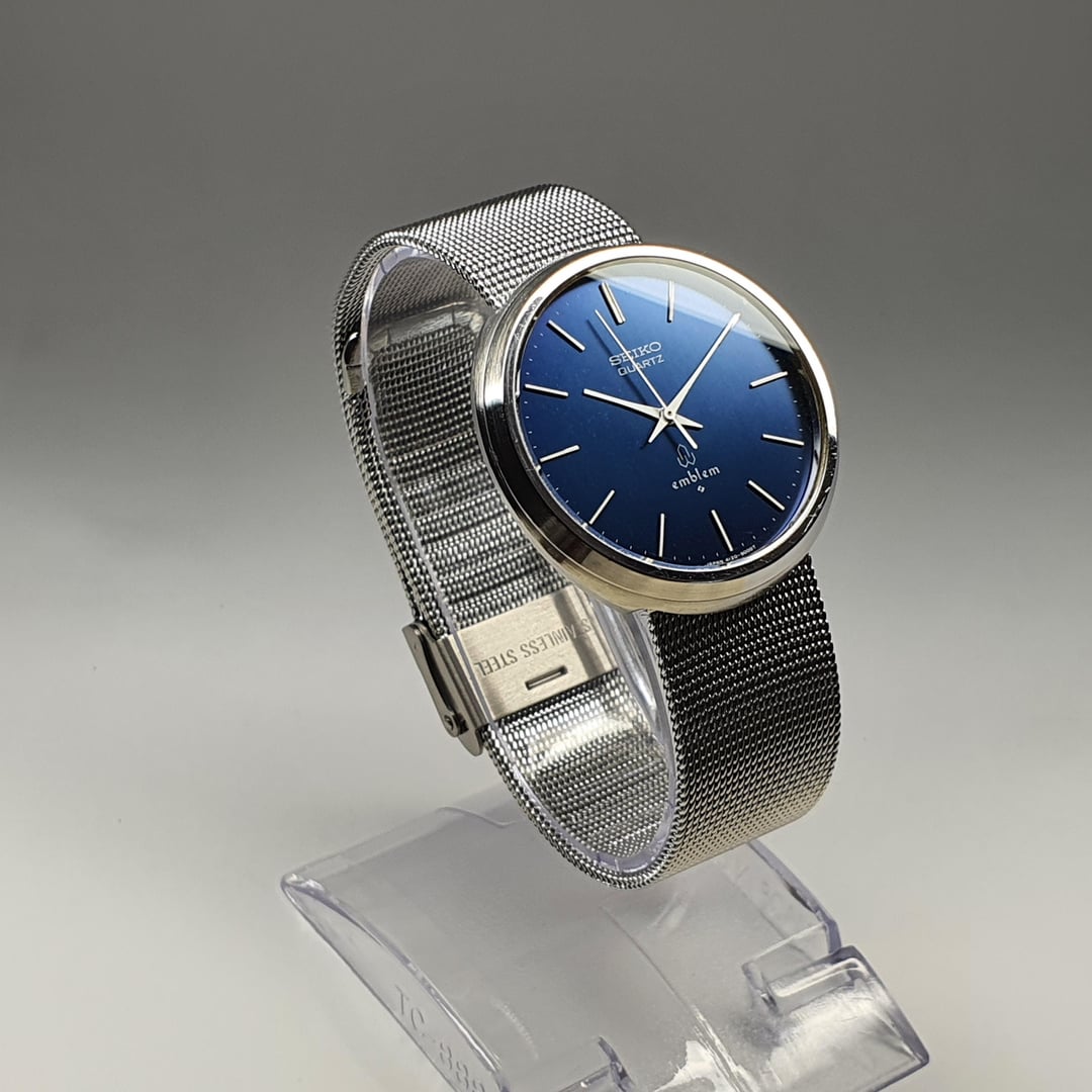 For sale is this vintage Seiko "Emblem" 4120-9000, made in Japan in July of 1976. The "Emblem" series was a mid-range series just a smidge below the expensive quartz models, which were top-of-the-range in the Seiko lineup during the 70s and may have roots in Seiko's Emblem-branded clock series (perhaps the designs were made to look more like clocks?). Manufactured in Seiko's Suwa factory (shown by the Suwa swirl logo on the dial) during its famous rivalry with the Daini Factory. This example, reference number MNC011, has a beautiful bold blue dial, which ranges from a deep blue to an electric blue depending on the light, with contrasting white stick baton markers and unique white mid-century modern hands. The Seiko logo, Emblem logo, single crystal quartz symbol and print at the bottom of the dial are in white. The lugless "disco volanté" design of the case takes tips from heavy-hitters like the Universal Genevé "Shadow" and Patek Philippe "Ellipse" (both designed by Gerald Genta) while making the case more modern and space-age with its chamfered sides, creating a slim look on the wrist (as is written in the brief, in Japanese, on the 1976 Seiko catalog clipping). The calibre 4120 movement was one of the smallest quartz movements on the market at the time and had an accuracy of 15 seconds per month (as a comparison the more modern Casio F-91W has/had an accuracy of 30 seconds per month). In great condition for its age being over 50 years old. General wear expected. Brand new original NOS Seiko crystal fitted. Comes on a brand new Milanese adjustable mesh strap. Brand new battery. Dimensions are: 35mm x 36mm x 8mm Lug Width 18mm Bought in Japan. Looking for $180 net (buyer pays Paypal fees) International Tracked Shipping $10 More pics: [https://flic.kr/s/aHBqjCjFsF](https://flic.kr/s/aHBqjCjFsF) \*Returns accepted but return postage costs are the buyer's responsibility in all circumstances.