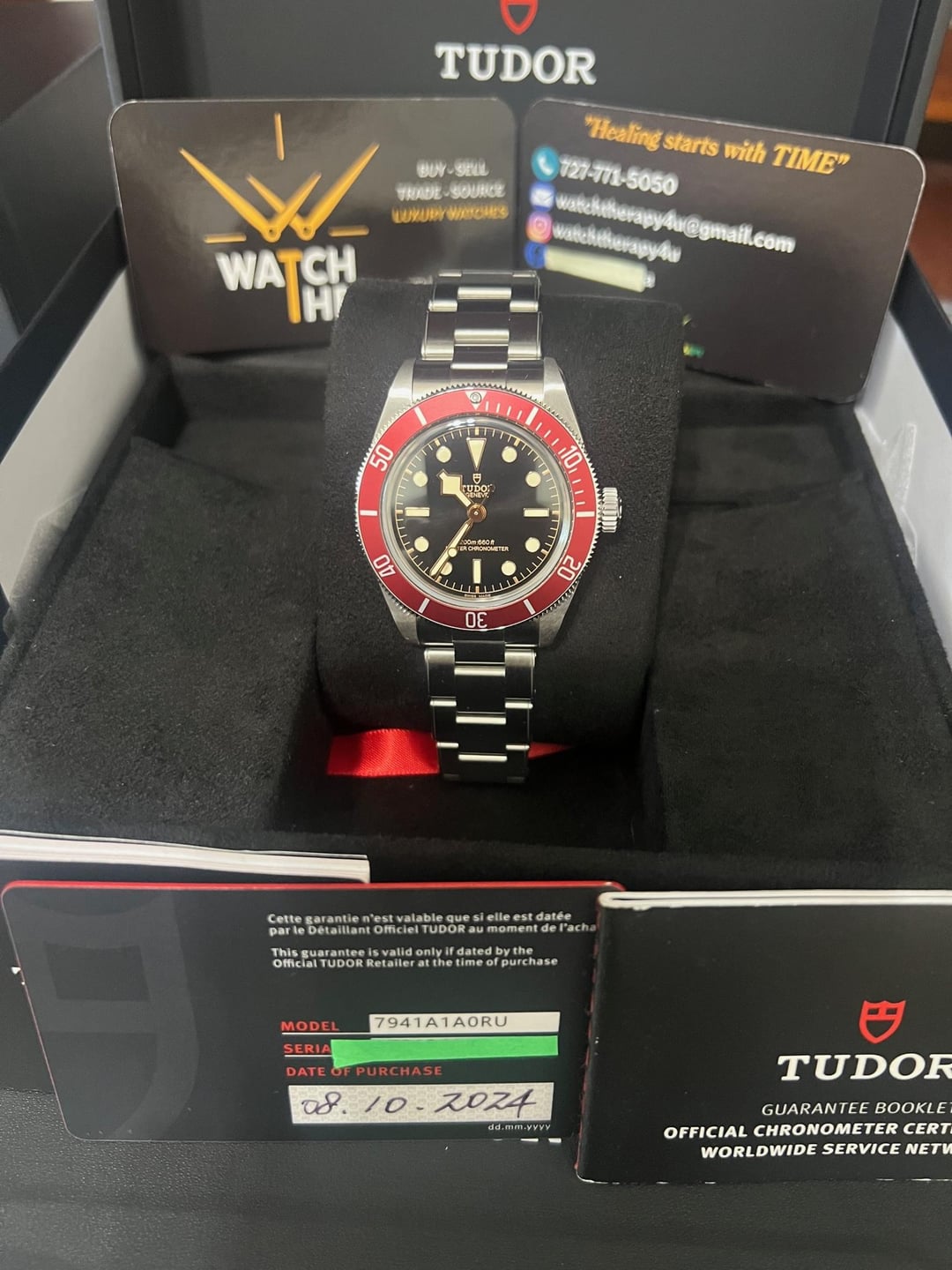 **F/S: New Tudor Black Bay 41 Red METAS Oyster 10/24 7941A1A0RU** **Specs:** \* Beautiful black domed dial w/Red Bezel \* Self-winding \* Size 41 SS case w/SS bezel and aluminum bezel \* Oyster bracelet with T-fit clasp \* 200M Water Resistance \* 70-hour power reserve \* MT5602-U (COSC) movement **Includes**: Warranty card 10/24, double boxed, booklets, all links. **Condition:** 9.5/10, unworn, unsized, but there a few hairlines on the case, one on the clasp and a couple links from handling. They are micro, so they wouldn’t show in the pics. **Price: $3,199.00 + Insured shipping to your local FedEx for pick-up in Con US**. I am also open to a face-to-face public transaction in or around the Tampa Florida Region, within reason. I have many strong and viable references within Reddit and from Buy/Sell/Trade Watch Facebook groups. Always willing to jump on a call or meeting link to show you the watch. Thank you and please reach out if you have any questions or concerns. Florida residents may be subject to sales tax w/o a valid reseller cert. ***No Trades, TY*** **Location**: Tampa Florida **Payment:** Zelle or Wire Timestamp: [https://imgur.com/a/cAKpklE](https://imgur.com/a/cAKpklE) FB: Watch Therapy Timepieces IG: [@watchtherapy4u](https://www.reddit.com/u/watchtherapy4u/)