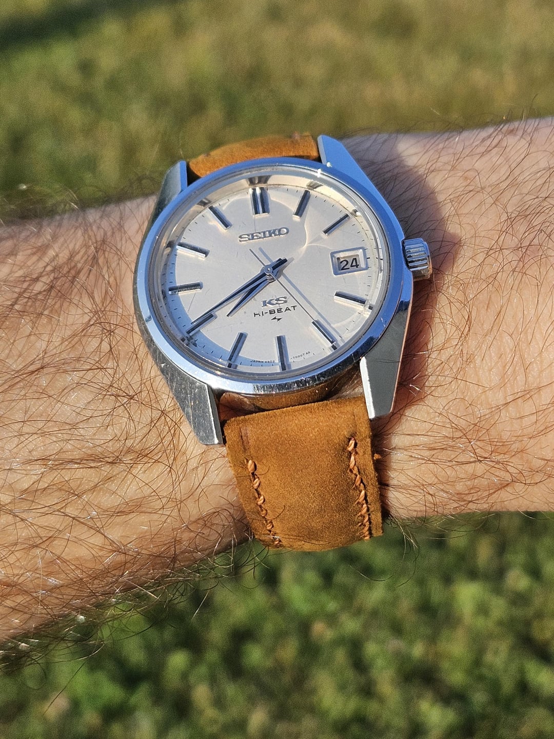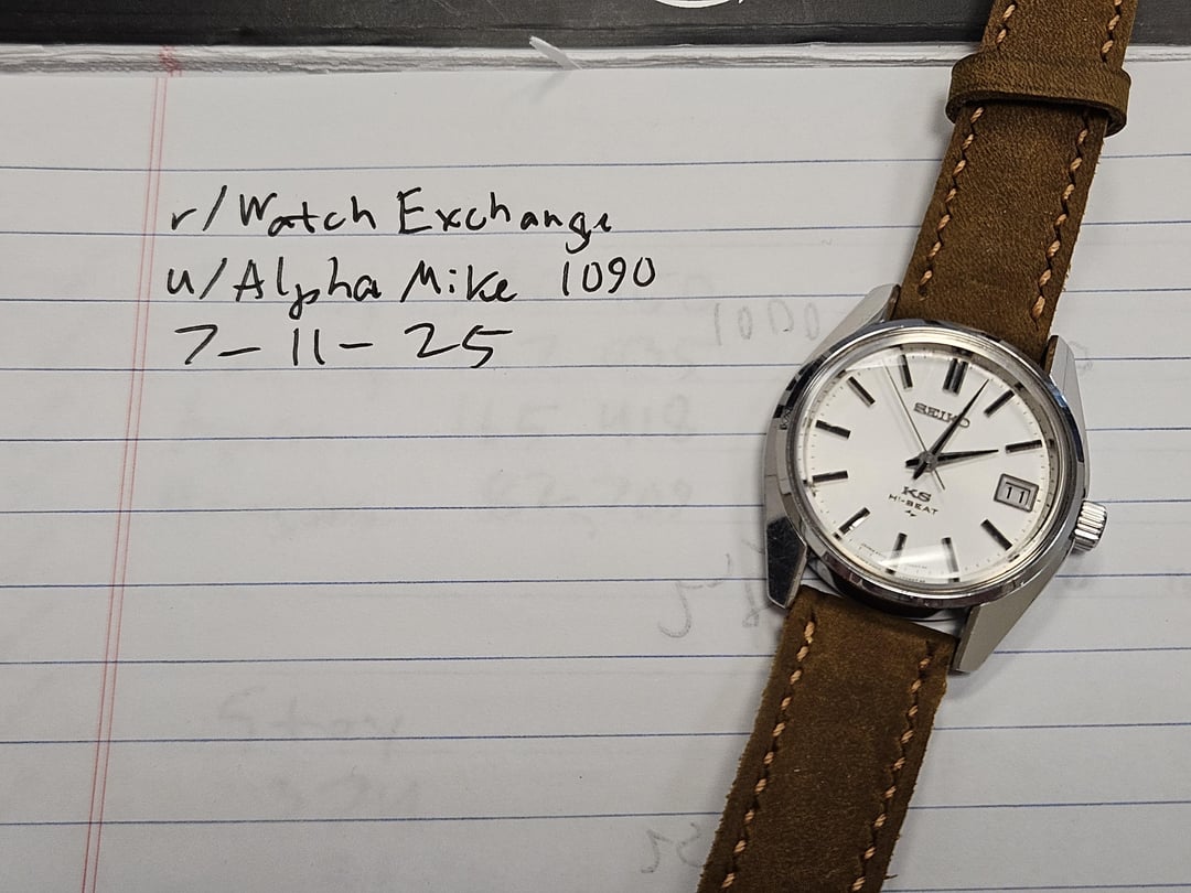 Hey there! For sale is my King Seiko "45KS" from September of 1970, reference 4502-7001. The watch is in good condition for its age as the pictures indicate, and I'll be happy to provide more specific details. The dial does have some very minor wear at 12 o'clock and 8 o'clock. Internally the watch is running very well, losing -3 seconds per day based on my wearing patterns. All functions of the watch are working as intended, including hand-winding, power reserve, quickset date, and time-setting. Album: [https://imgur.com/a/JBEVP9h](https://imgur.com/a/JBEVP9h) Timestamp: [https://imgur.com/a/pOUuQiX](https://imgur.com/a/pOUuQiX) Priced at a firm $550 which includes insured CONUS shipping. Payment via Zelle or PayPal. Thanks for looking!