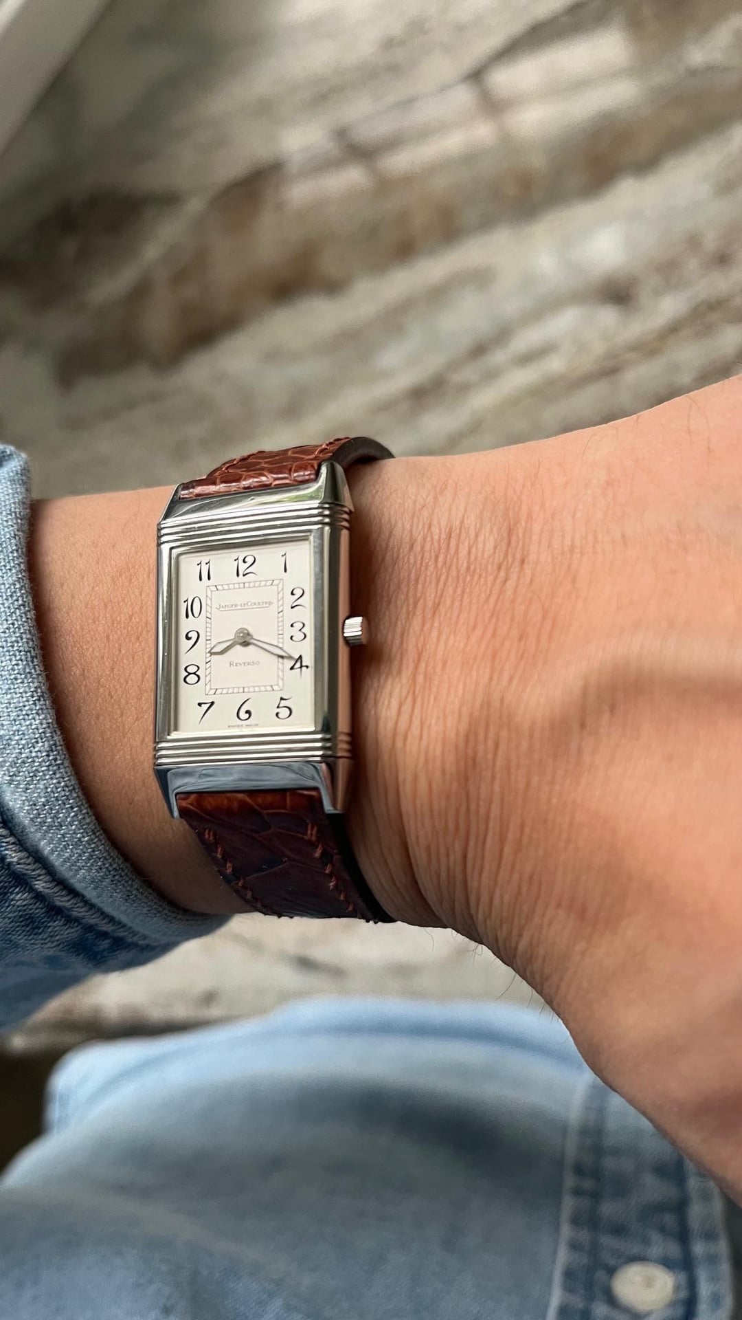 Hi Watch Fam, This is a repost. I am selling a watch that I recently picked up. It is a relatively rare Jaeger LeCoultre Reverso Classique (Ref. 250.8.86) with a floral arabic numeral dial in a manual wind configuration. This combination is relatively rare. Given that this is the Classique size, this is quintessential Reverso coming in at 23mmx38mm (17mm lug width). The watch has a lot of presence for its size. Pictures of it on my 6.75” wrist are included for your reference. Minor wear marks (no notable scratches) and in overall great cosmetic condition. Reversed side is clean with no engraving so ready for your own customization. Watch keeps time well, winds smoothly with excellent tactile feel and comes with the OEM JLC clasp and a like new after market brown ostrich strap. The other straps included in the pictures (black Autodromo strap, grey ostrich strap) can be included for extra. Looking for $3,800. Shipping will be on me if buyer is in continental U.S. Please do not hesitate to reach out with any questions or for further pictures. Payment will only be accepted through wire, venmo or zelle. Exceptions will be made on a case by case basis. I will not accept any returns so feel free to ask any questions. I have years of transaction history including dozens of positive transactions feedback on WatchUSeek under Willing86 and a few dozens more here on Reddit, so deal in confidence. Feel free to ask any questions or request more pictures/details! Timestamp: [https://imgur.com/a/OFflj78](https://imgur.com/a/OFflj78) Pictures: [https://imgur.com/a/bFIv3Bd](https://imgur.com/a/bFIv3Bd)
