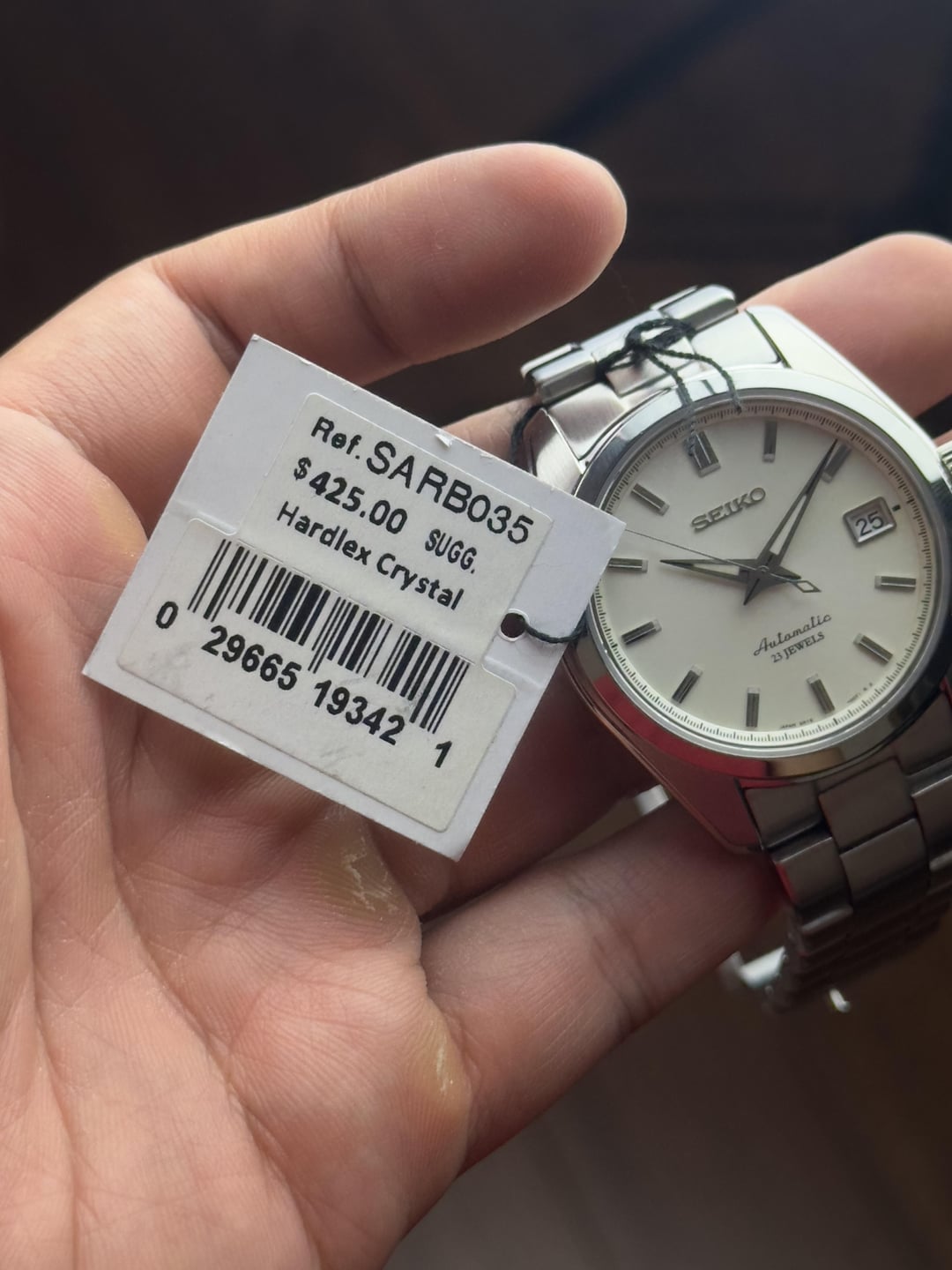 Up for sale is the Seiko Sarb035 aka “Baby Grand Seiko” in near mint condition Images: https://drive.google.com/drive/folders/1h57OFFQe-BE_Z2Iifsqvlt-WtYQcLbII Timestamp: https://drive.google.com/file/d/1Cl_ETqyKJHAlicNbUIHi-GMB88uWS-QZ/view?usp=drivesdk Video: https://drive.google.com/file/d/18t2zc6EaldVnpULS3zmQA0Y9phnce2Qj/view?usp=drivesdk The Seiko SARB035 (ivory dial - the creamy off-white colour) was originally released in 2008, alongside siblings, 033 (black dial), 037 (salmon dial) and 038 (Gold pvd). It was immediately met with rave reviews due to its superb design and an excellent value proposition. It was discontinued in 2018, and since then the price has gone up due to its collectible status. Introduced in 2007, the SARB035 features a 38mm stainless steel case with a 44.5mm lug-to-lug length, thickness of 11.5mm and 20mm lug width. Inside, the watch houses the reliable 6R15 automatic movement, delivering solid performance. It’s water-resistant up to 100 meters, protected by a Sapphire crystal and a display case back. The dial sports a cream white finish, complemented by refined dauphine hands and applied index markers. This watch is in excellent condition, showing minimal signs of wear as it was taken directly from exhibition stand from Seiko AD in Bangkok but you can expect some minor hairline scratches from contact. It has been recently serviced and is running accurately. The original bracelet remains firm and fits wrists up to 19cm (7.25 inches). The watch comes with box, papers, card and hang tag. Price: $650 + $35 flat shipping (via DHL express). Payment via PayPal F&F or G&S (+4.6% fee covered by the buyer). Not accepting trades. Feel free to message me with any questions or if you're interested. Have a great day!