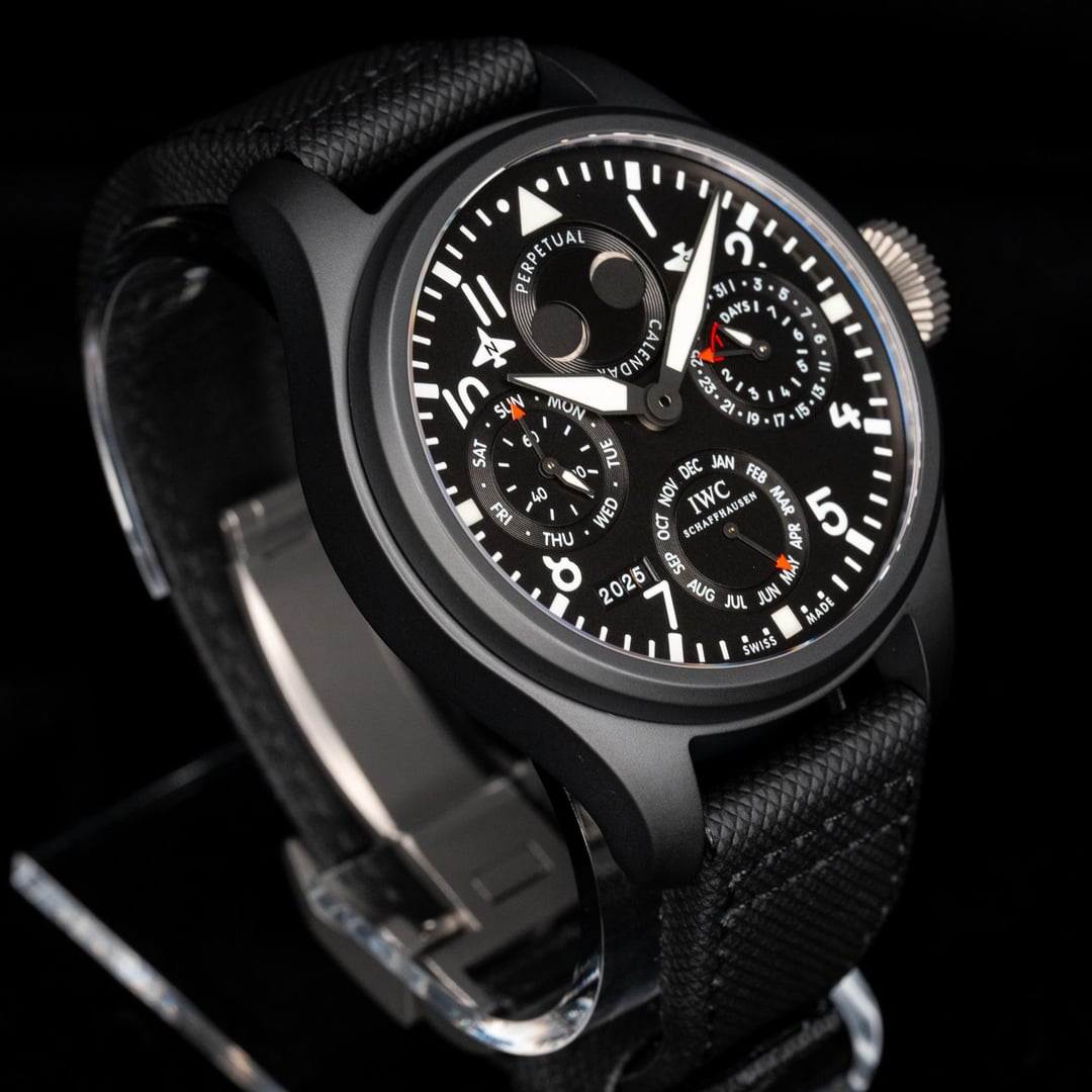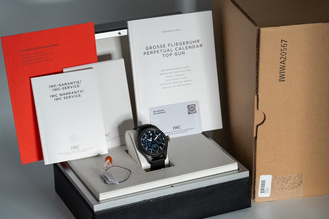 **IWC Pilot Top Gun Perpetual Calendar** **IW502902** **Just Serviced!** The IWC Big Pilot’s Watch Perpetual Calendar TOP GUN (Ref. IW502902) is a masterful fusion of aviation heritage and horological innovation. Introduced in 2012, this timepiece stands out with its imposing 48mm matte black ceramic case, complemented by a titanium crown and case back, ensuring both durability and a lightweight feel. At its core lies the in-house Caliber 51614 automatic movement, boasting a 7-day power reserve. This movement powers a perpetual calendar complication that displays the date, day, month, four-digit year, and moon phase for both hemispheres.Remarkably, all these functions are synchronized and can be adjusted via the crown, eliminating the need for multiple pushers. * **Case:** 48mm matte black ceramic with a titanium crown and case back, ensuring durability and a lightweight feel * **Dial:** Matte black with luminous Arabic numerals and hands for optimal legibility * **Movement:** Powered by the in-house IWC Caliber 51614, featuring a 7-day power reserve and automatic Pellaton winding system * **Complications:** Perpetual calendar displaying date, day, month, and four-digit year, along with a dual moon phase indicator for both hemispheres * **Strap:** Black fabric strap with a deployment clasp, offering comfort and security The watch is in Like New and Unworn condition. Please review the photos closely as they accurately convey the condition of the watch. This comes as a full set with cardboard box, outer box, inner pillow, all books and papers. Free domestic insured overnight shipping via FedEx. We deal with absolute transparency and welcome any communication regarding the watch.The serial number has been obscured for privacy. We use a strong macro lens which tends to emphasize even the smallest imperfection. Despite our efforts small smudges or specs of dust may be seen. Additional photos available upon request. Payment: Payment: Wire, Zelle, Cash F2F. CA residents please add 7.75% sales tax. We are a dealer in southern CA with many references on various platforms and Google reviews. Please also see our website. Happy to jump on a FaceTiome to see the watch in person. We also realize we are new to r/watchexchange so we are happy to use an escrow and authentication service, typically Bennisson in West Palm Beach. Please PM with any questions. u/Crosstimecollection