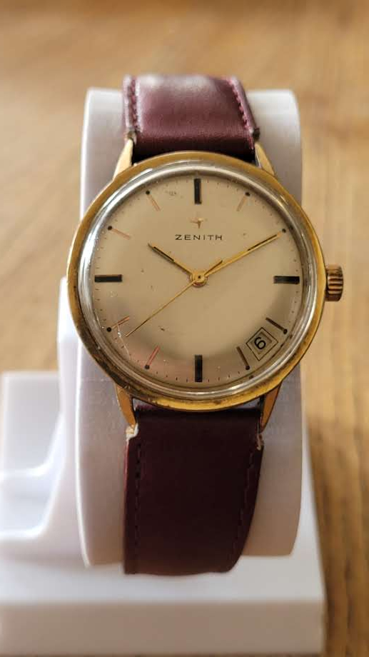 Une jolie montre 3 aiguilles avec la date entre 4 et 5h, marque de fabrique de beaucoup de montre Zenith.
