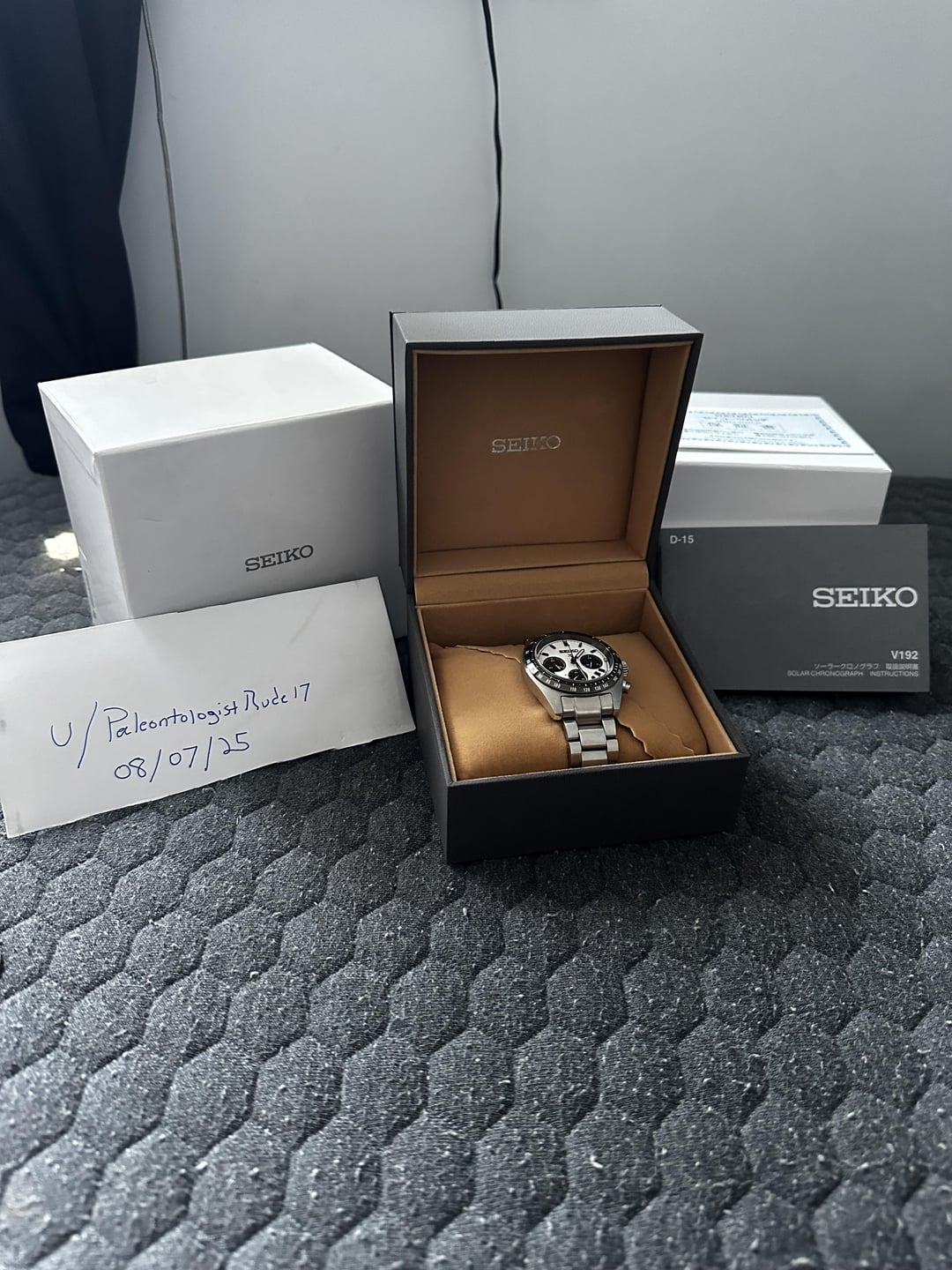 [WTS] ($350) This is the popular Seiko "Panda" chrono with classic vintage-inspired styling and modern solar reliability. Runs perfectly. Selling to cover coast of new roof. Please reach out with any questions! Can ship out today! Model: Seiko Prospex SSC813 (a.k.a. "Speedtimer Panda") • Movement: Seiko V192 solar-powered chronograph (6-month power reserve when fully charged) Case Size: 39mm Thickness: 13.3mm Lug-to-lug: ~45.5mm Lug Width: 20mm Water Resistance: 100m Crystal: Curved sapphire w/ anti-reflective coating bracelet/clasp. Crystal Condition: Excellent - only light wear with some faint hairlines on the and case are clean. Kit: Full set - includes outer box, inner presentation box, booklet,