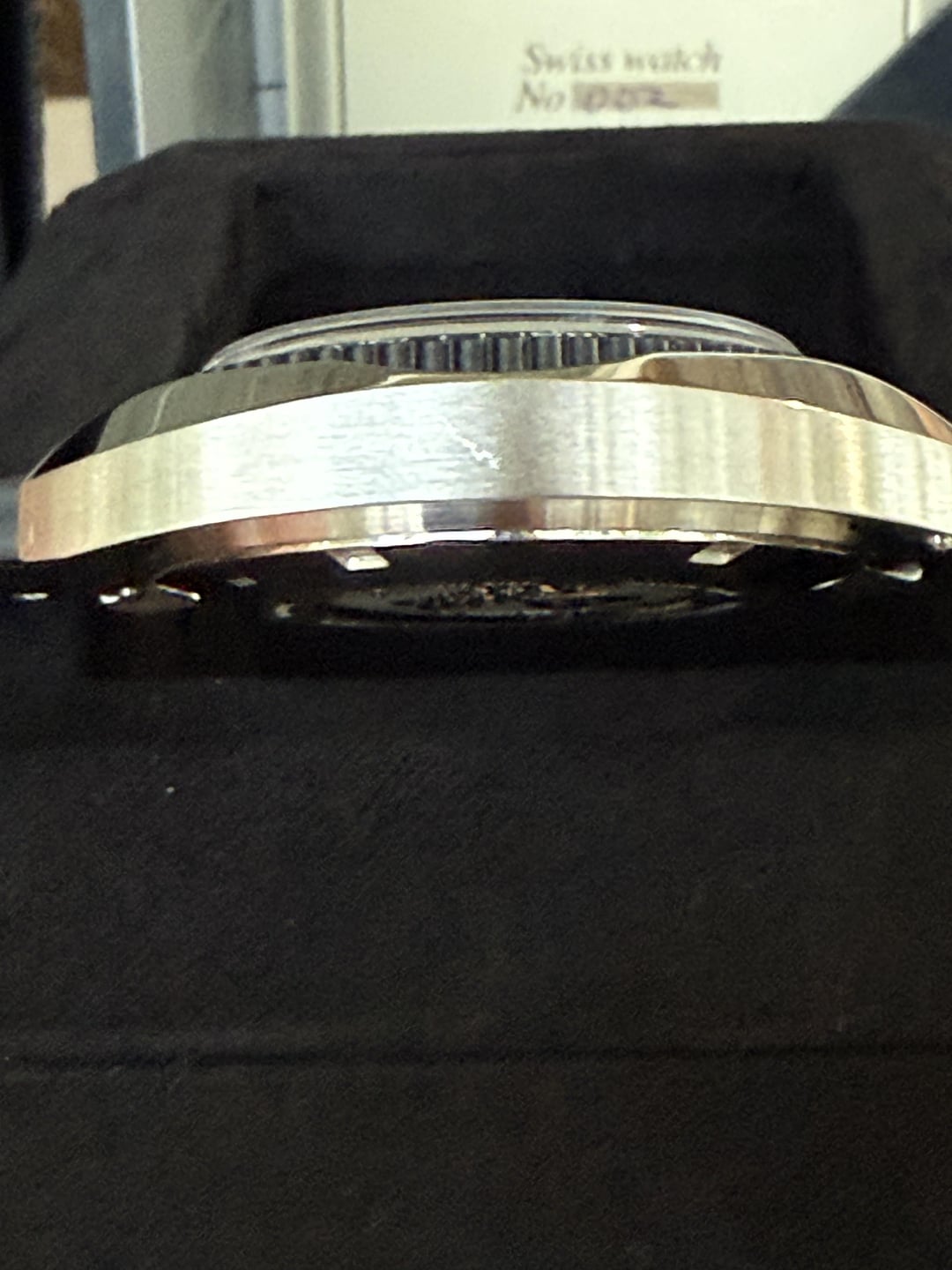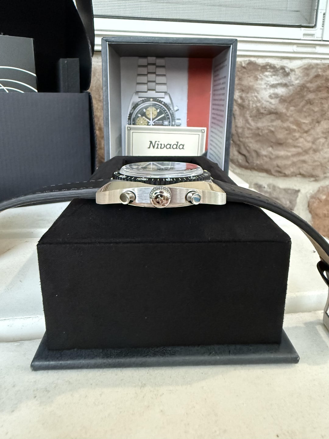 Nivada Grenchen Black/Yellow Chronosport on an OEM leather. Like new condition with the exception of one mark on the left side of the case (photographed). Width 38mm Height 10.2 mm w/o crystal Lug width 20mm L2L44.3 Seiko VK67 Meca-Quartz movement Asking price of $495 includes shipping to the US. I’m experienced shipping outside the US and I’m open to doing so, but please be prepared with references of your own. I prefer PayPal goods and services. If you’d like a deal, and feel comfortable with PayPal f&f, I’m open to negotiate slightly.