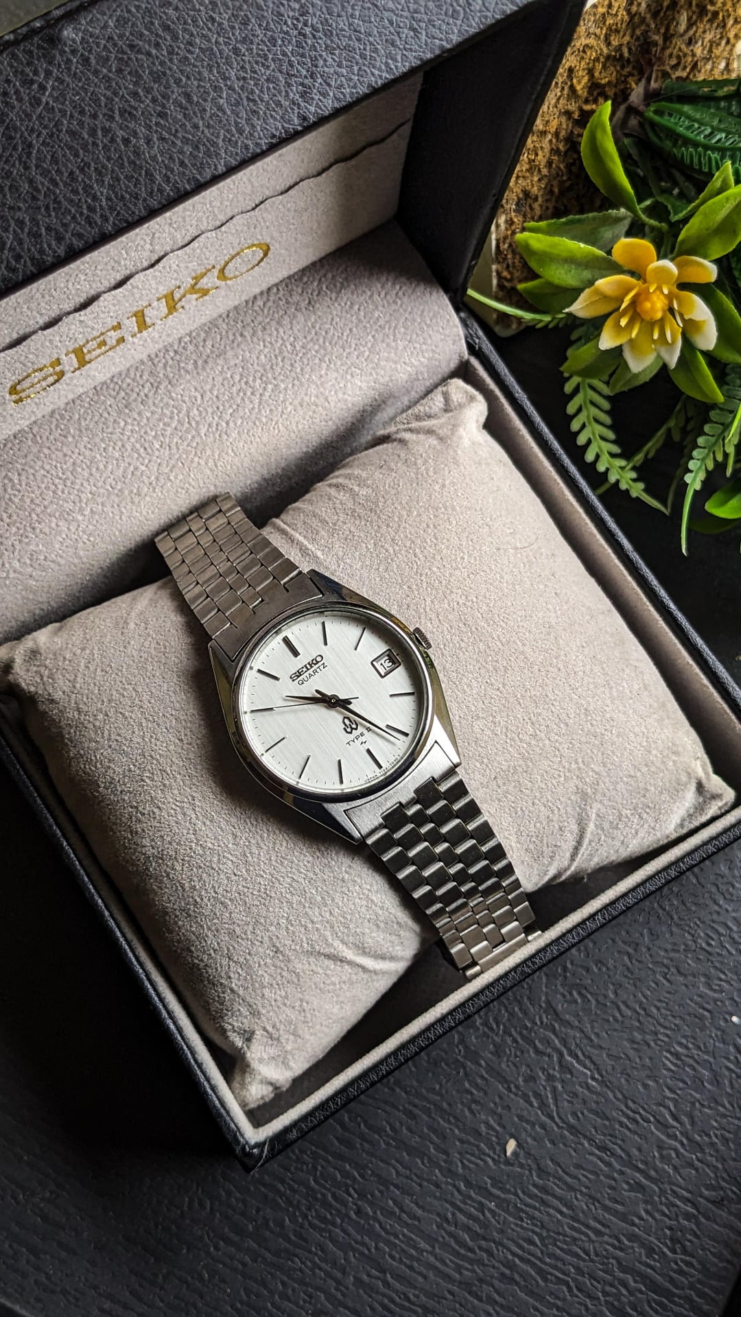 Hello WatchFam, A very beautiful early Seiko Type 2 Quartz from November 1989. Fantastic condition Sunburst dial integrated with original bracelet. It have a Quartz movement 7122. The watch contains original bracelet and comes with an aftermarket Box. Watch reference number is 7122-7020 Quartz movement working fine (not serviced) Watch is in very good condition as shown in the pictures. And can be gifted to your loved ones Watch Measures are lug to lug 38mm with crown 33mm approx. Price $225 Timestamp:https://imgur.com/a/67Yt4Rq
