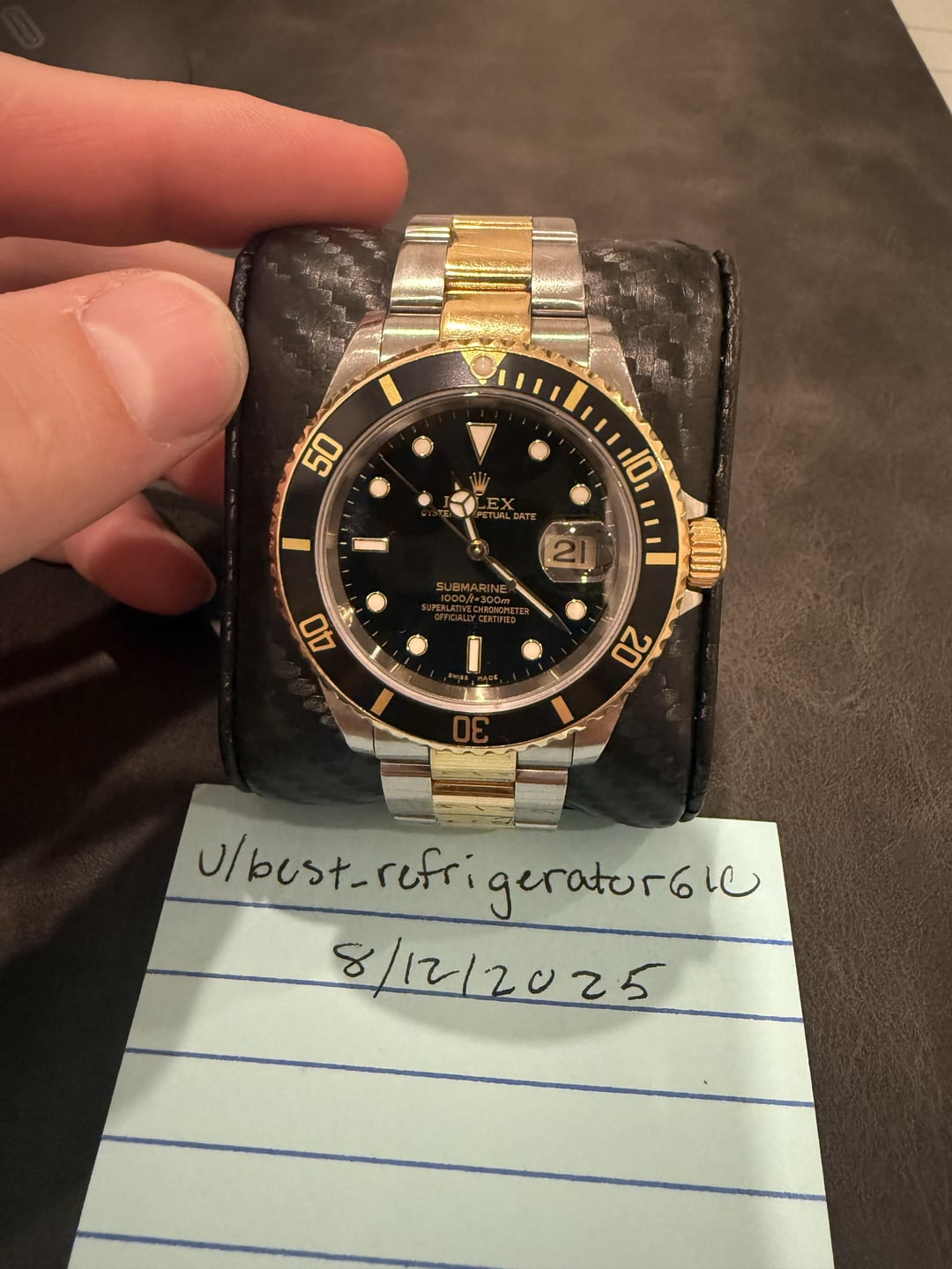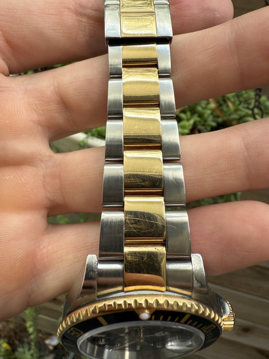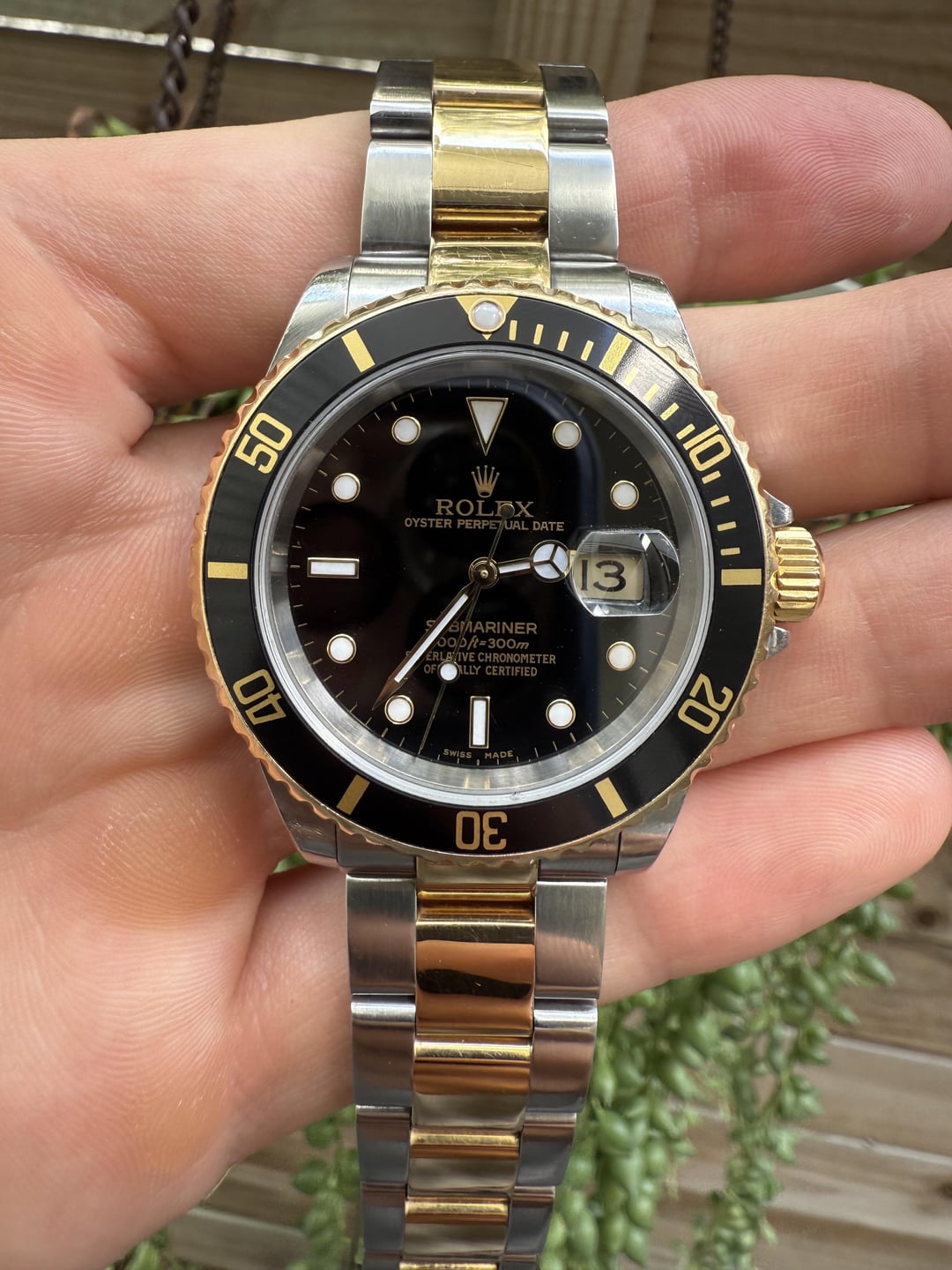 Selling my two-tone Submariner Date 16613 with the classic black dial. • Ref: 16613LN (two-tone steel & 18k gold) • D SERIAL – holes case with solid end links • Condition: Honest pre-owned condition with surface wear and a few small dings, nothing major. Case looks unpolished to me. Crystal has a small chip near 5-6 oclock. Dial and bezel are sharp. • Movement: Caliber 3135 running smoothly • Included: Watch only with 9 full links + full divers extension • Bracelet: 93253 Oyster with solid end links, minimal stretch • Price: $9,500 – shipped & insured in CONUS • Location: Houston Tx Wire / zelle preferred. Cc, PayPal, Venmo etc accepted (+4%) and copy of ID required. [Instagram](https://www.instagram.com/watchesinhouston?igsh=NWxkdjFnb2F4azl3&utm_source=qr)