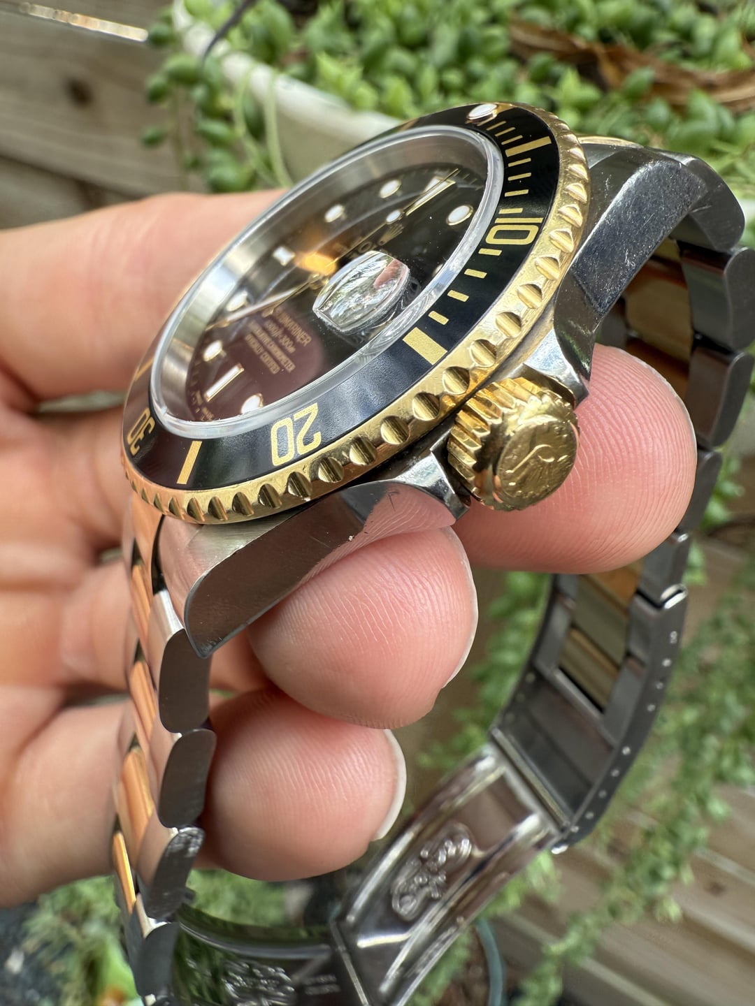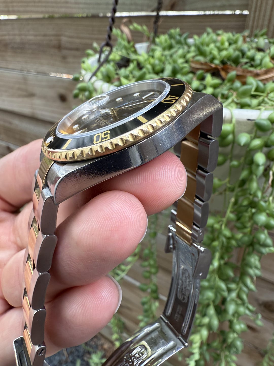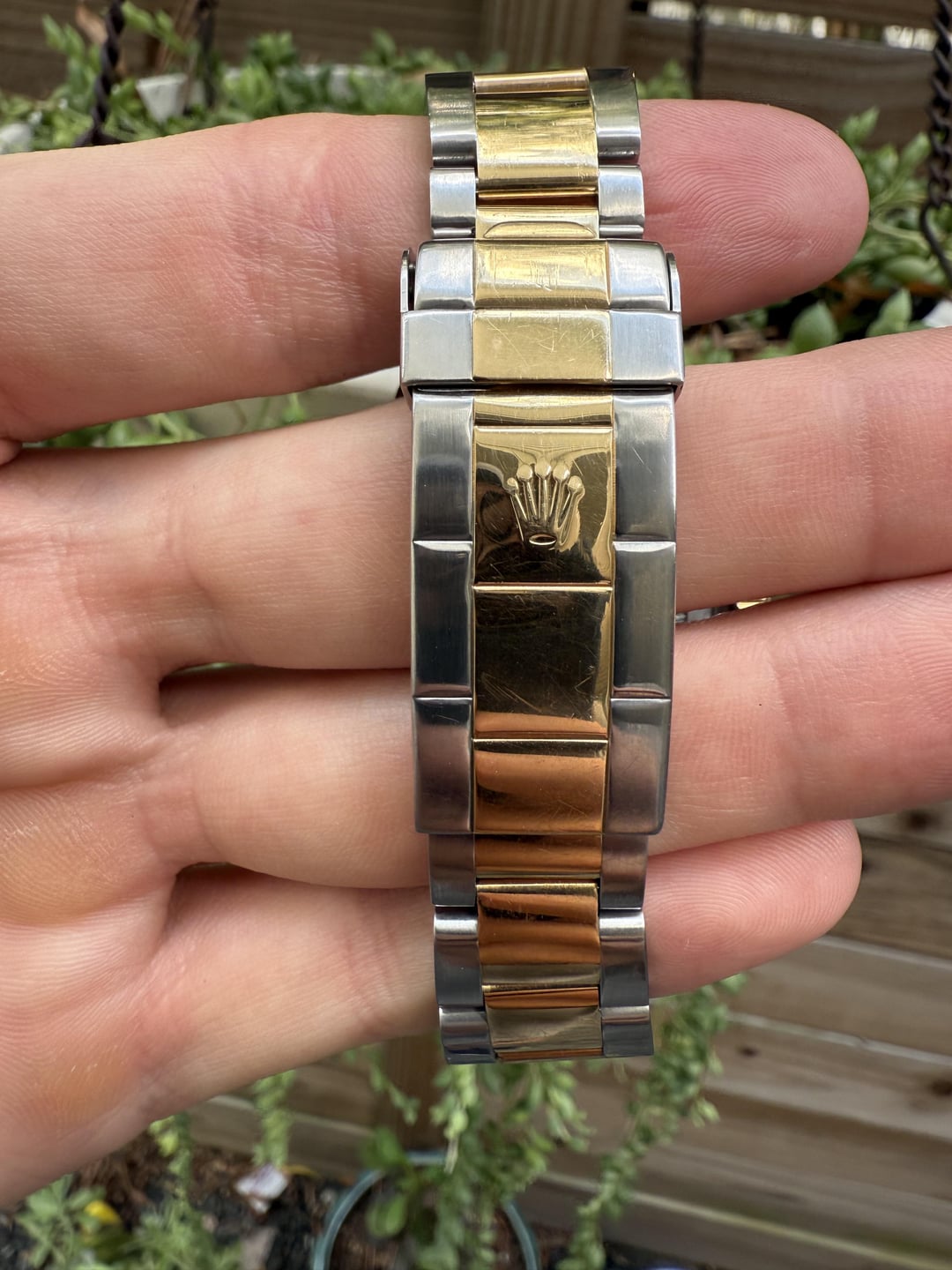 Selling my two-tone Submariner Date 16613 with the classic black dial. • Ref: 16613LN (two-tone steel & 18k gold) • D SERIAL – holes case with solid end links • Condition: Honest pre-owned condition with surface wear and a few small dings, nothing major. Case looks unpolished to me. Crystal has a small chip near 5-6 oclock. Dial and bezel are sharp. • Movement: Caliber 3135 running smoothly • Included: Watch only with 9 full links + full divers extension • Bracelet: 93253 Oyster with solid end links, minimal stretch • Price: $9,500 – shipped & insured in CONUS • Location: Houston Tx Wire / zelle preferred. Cc, PayPal, Venmo etc accepted (+4%) and copy of ID required. [Instagram](https://www.instagram.com/watchesinhouston?igsh=NWxkdjFnb2F4azl3&utm_source=qr)