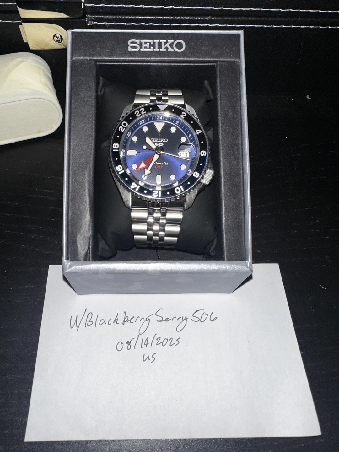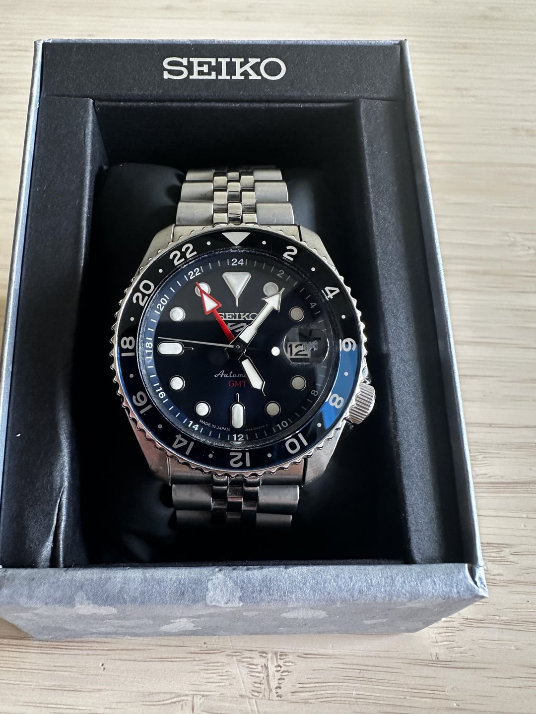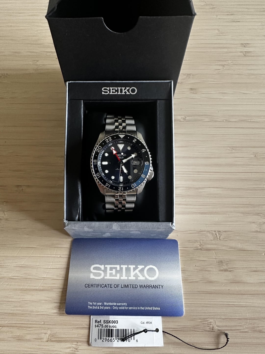 Seiko 5 Sports SSK003 “Batman” GMT – Fair Condition | Scratch on Cyclops - $319 OBO Highlights: • Iconic black and blue “Batman” bezel with sporty style • Fair pre-owned condition – noticeable scratch on cyclops magnifier. Hasn’t bothered me but would be easy to replace yourself (if you are into modding for working on watches) relatively cheap to have a jeweler do • Reliable Seiko 4R34 automatic GMT movement • 100m water resistance – suitable for everyday wear • Bold black dial with clear GMT function Since purchasing this watch, I have begun watch modding and building/designing my own watches; I really only wear my brands now and this piece is not getting the attention it deserves. I am in the process of trying to start my own American assembled micro-brand and proceeds from this sale will go towards making that dream a reality. This item ships from the US - buyer is responsable for shipping costs. Please message me for more information.