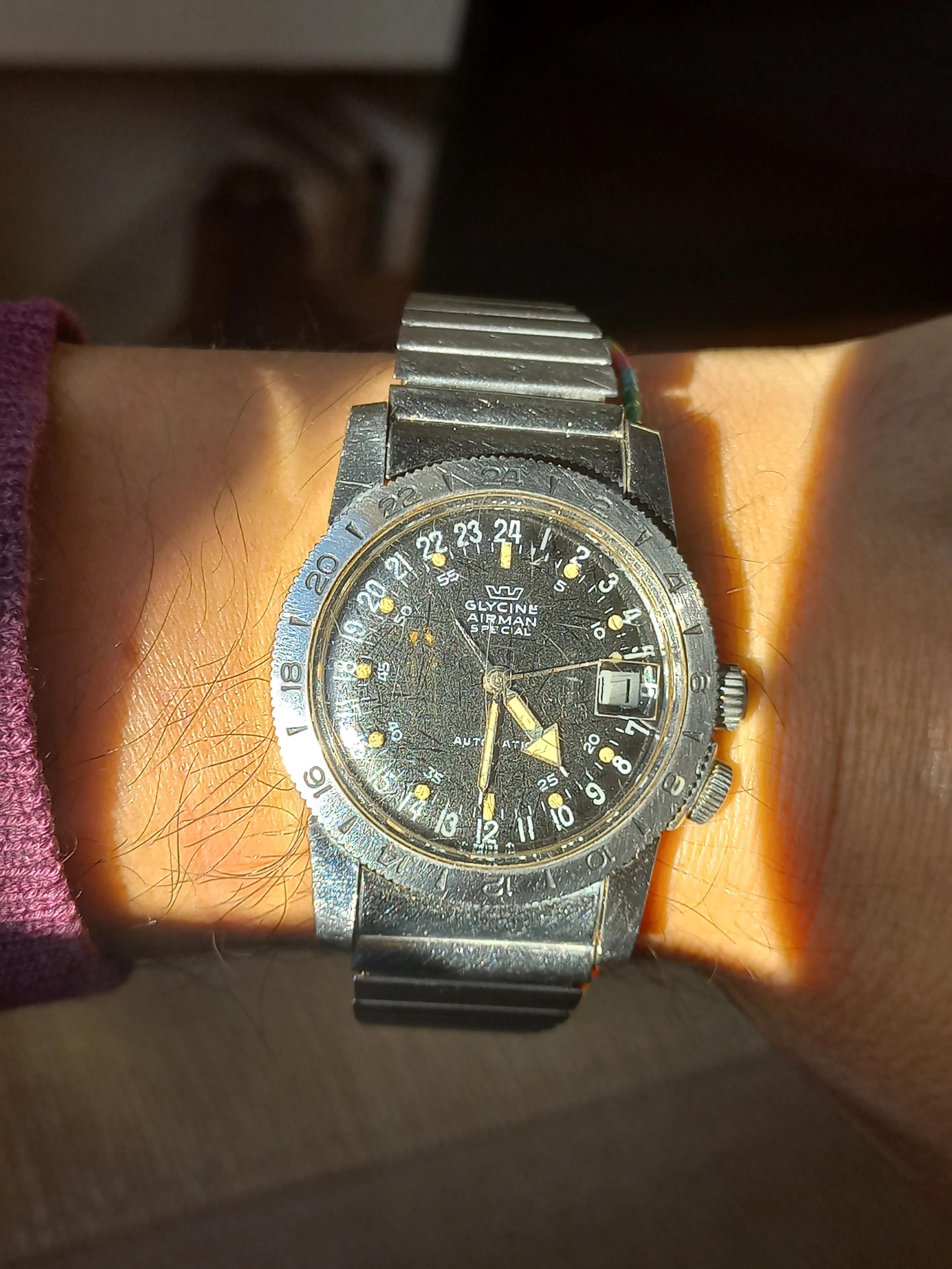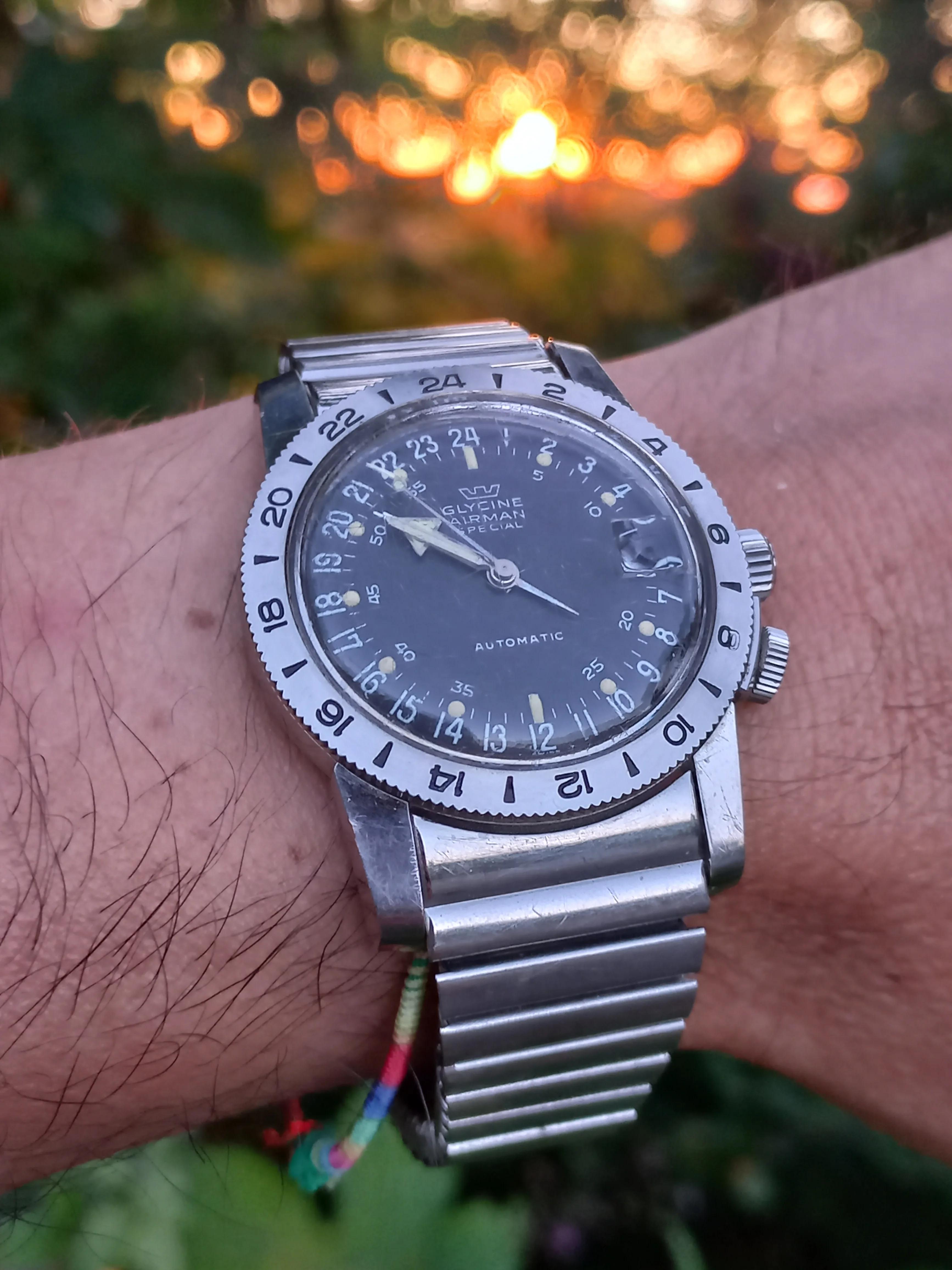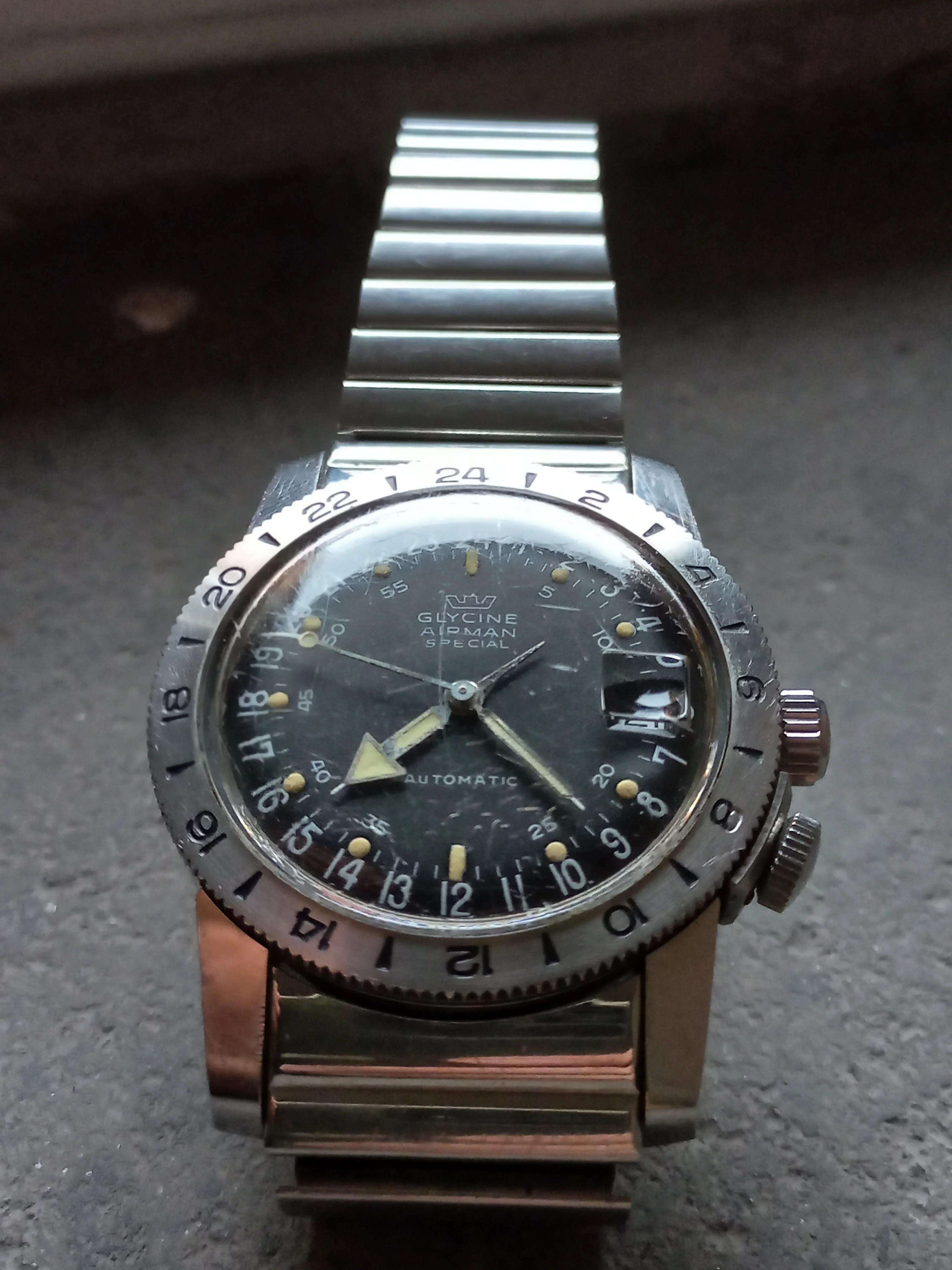 I decided to part with my vintage Glycine Airman Special, a 24hrs watch with GMT functions well known among collectors, with numerous modern reissues to its name. Serial number 947214, still readable on caseback, dates back the watch to 1968, according to spreadsheet included among pics.