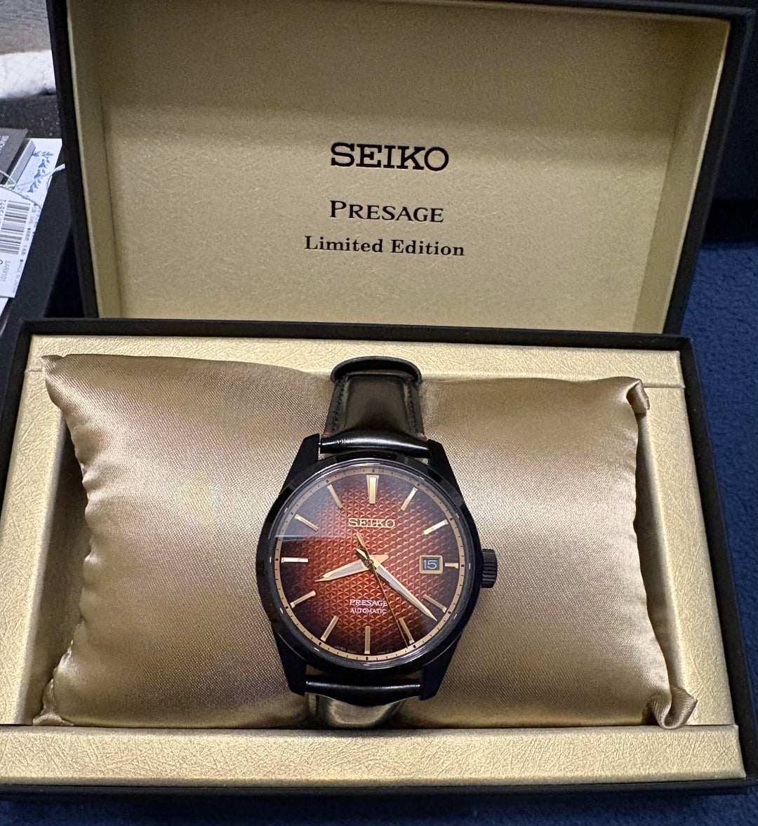 Hi everyone, Up for sale is my Seiko Presage SPB331J1, a limited edition (2000 pieces) Sharp Edged Series Kabuki-inspired Limited Edition. What's Included: Full kit including original box, papers Price: $575 Payment Method: PayPal F&F or G&S + 3% (buyer covers fees) or Venmo. Shipping: CONUS only, included in the price. Details: Movement: Seiko Caliber 6R35 Automatic with manual winding Power Reserve: Approximately 70 hours • Case Material: Stainless steel with hard coating Case Size: 39.3mm diameter, 11.1mm thickness, 47.2mm lug-to-lug Crystal: Sapphire with anti-reflective coating on the inner surface Lug Width: 20mm Water Resistance: 10 bar (100m) See-through screw-down case back, date display, stop second hand function, LumiBrite on hands and indices. I am happy to answer any questions. Thanks for looking!
