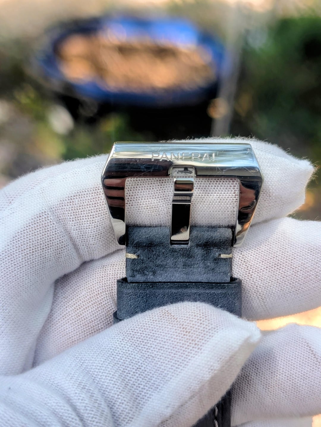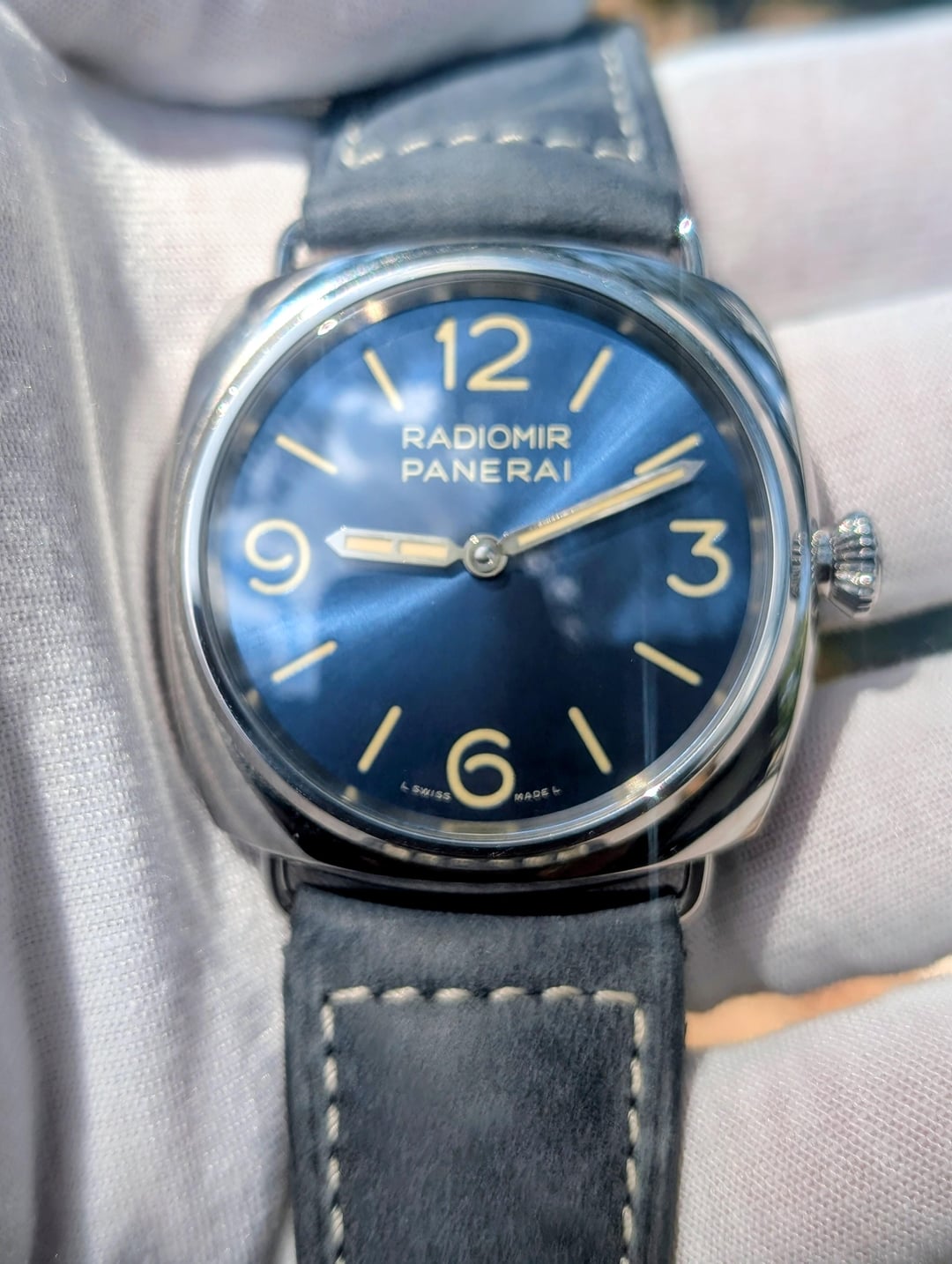 Panerai Radiomir PAM01383 $2995 shipped CONUS from Austin, TX - No Trades BEAUTIFUL Blue sun-brushed dial with luminous Arabic numerals and hour markersInner and outer box, card (dated 5/2024), manual and ebay authentication card. Small nick on the bezel at the 2 o'clock position, but only visible when you look for it (priced accordingly) * 26mm blue nubuck leather strap * Hand-wound mechanical, P.6000 calibre * 45 mm * 10.0 bar (\~100.0 metres) * timestamp: [https://imgur.com/a/ZBDja87](https://imgur.com/a/ZBDja87) * payment via PP or Venmo. PPGS with 3% on top