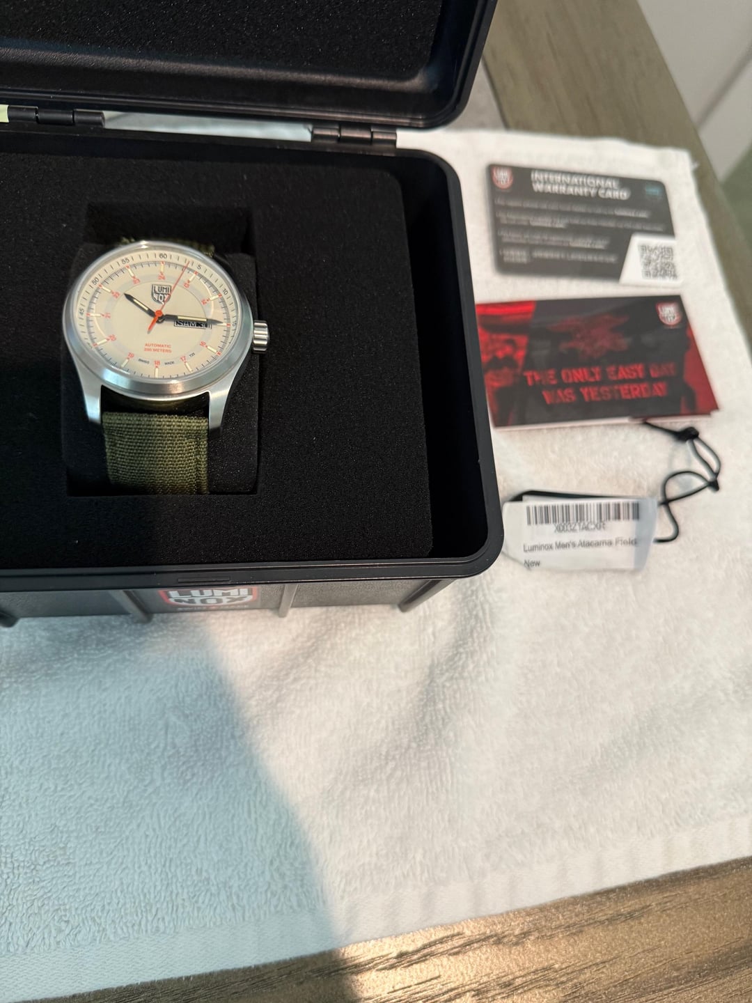 Up for sale is a Luminox Atacama Field Automatic w/ white dial. Full set. I purchased this new in fall 2024, and selling to make room for other pieces. This is my first sale on this forum, but I have sold a few pieces on c24. More than happy to provide any additional info, pics, videos, etc. through DM. Reference [XL.1907.NF](http://XL.1907.NF) SELLITA SW 220-1 movement. 44mm case and 14mm thick (this thing is a hoss - I have large wrists and didn't mind, but please don't miss this). 200m water resistance. Sapphire crystal. Beautiful white dial with great lume. Asking $650 obo shipped (to continental USA only). Also available in-person in Savannah, GA area.