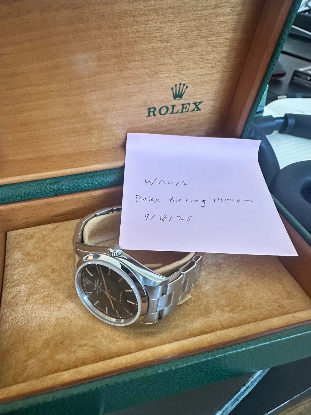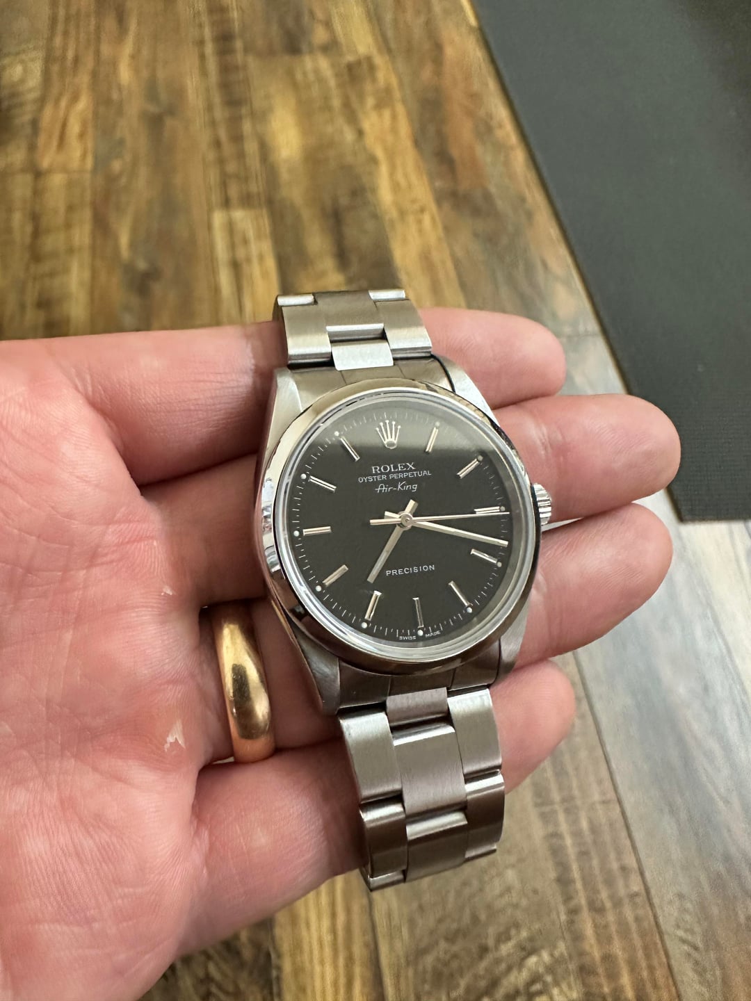 [WTS] Rolex Airking 14000M - 2001-02 - Beautiful Black dial Hi folks -- another watchexchange catch and release for me. Purchased this beauty earlier this year. Comes with original inner box, outer box, extra link, receipt and appraisal from SwissWatchExpo. Condition: watch is in excellent condition with very minimal hairline scratches on the bracelet and case as shown in the photos. Overall very honest version of the 14000m from 2001-02. Sapphire is pristine with no scratches. Beautiful black sunburst dial, wears comfortably at 34.5mm. A midsize that’s classic on all wrists. Caliber 3130 perpetual movement. Keeps time well and should fit wrists up to 7.5. Asking $3650 shipped via Fedex. Payment through Zelle/Wire. Location: U.S. / California
