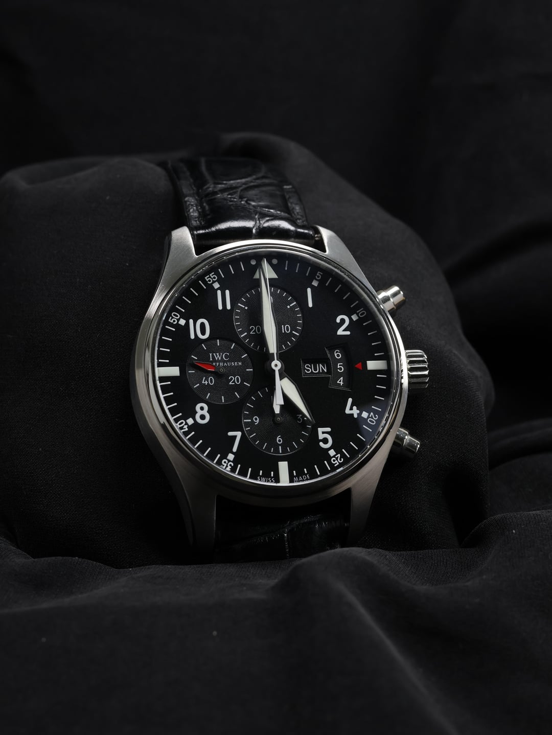 IWC Pilot’s Watch Chronograph IW377701 – Full Set (2013) $3590 + shipment A classic modern pilot’s chronograph from IWC, the Ref. IW377701 embodies the brand’s aviation DNA with robust design, excellent legibility, and everyday versatility. This 43mm stainless steel chronograph features the signature black pilot’s dial with bold white Arabic numerals, day/date at 3 o’clock, and subdials laid out for maximum clarity. Luminous hands and indices ensure legibility in all conditions. Inside beats the reliable IWC Caliber 79320 automatic chronograph movement, offering precision timekeeping and a 44-hour power reserve. The screw-down crown and 60-meter water resistance add to its durability. Condition • Watch head: Excellent overall condition with only minimal signs of handling. The case, dial, and crystal are all clean and sharp. • Strap: The original leather strap worn but in good condition. • Set: Comes as a complete full set from 2013, including box and papers. A timeless and highly wearable IWC pilot’s chronograph, combining tool-watch toughness with refined Swiss craftsmanship
