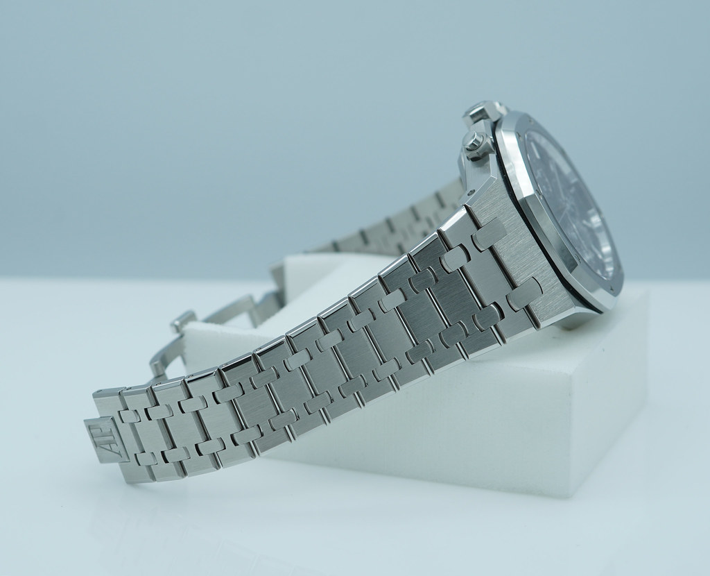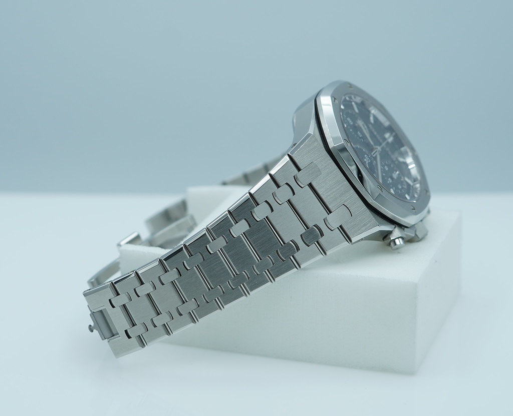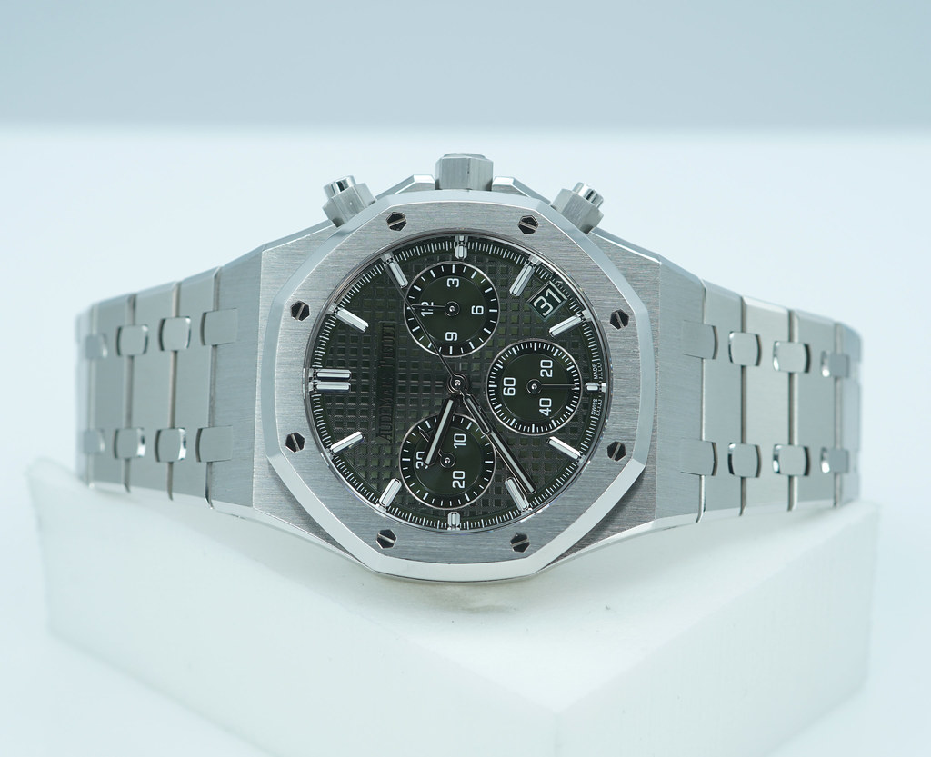 Hi, Selling An Excellent Condition & Very Beautiful Discontinued 50th Anniversary 41mm Audemars Piguet Royal Oak Chronograph Stainless Steel with Khaki Green Dial. Purchased from Audemars Piguet Boutique in 05.2022. Watch running perfect with Non Issues. Full Links. Boxes & Papers.